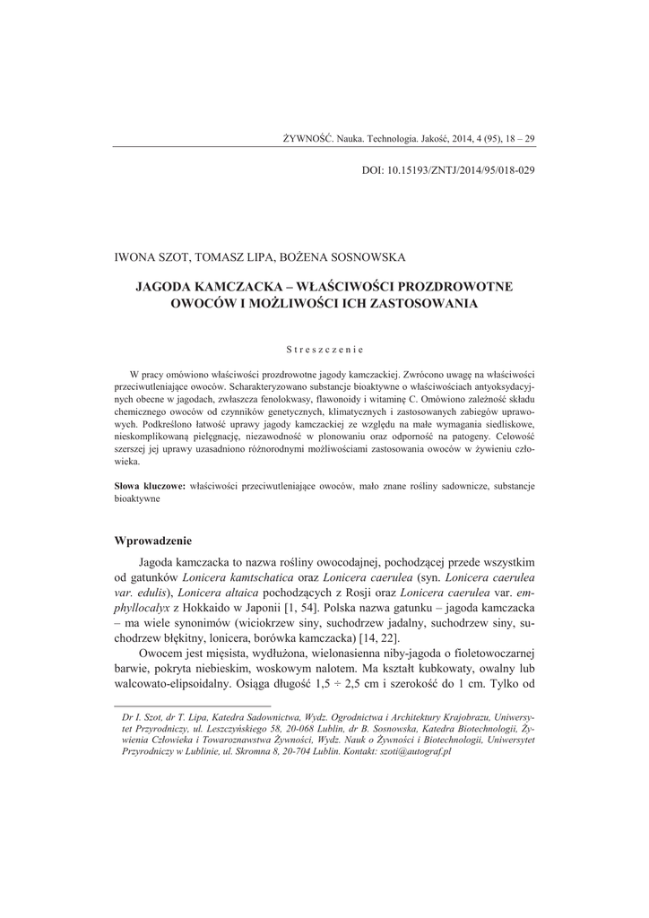 ŻYWNOŚĆ. Nauka. Technologia. Jakość, 2014, 4 (95), 18 – 29 DOI: 10.15193/ZNTJ/2014/95/018-029 IWONA SZOT, TOMASZ LIPA, BOŻENA SOSNOWSKA JAGODA KAMCZACKA – WŁAŚCIWOŚCI PROZDROWOTNE OWOCÓW I MOŻLIWOŚCI ICH ZASTOSOWANIA Streszczenie W pracy omówiono właściwości prozdrowotne jagody kamczackiej. Zwrócono uwagę na właściwości przeciwutleniające owoców. Scharakteryzowano substancje bioaktywne o właściwościach antyoksydacyjnych obecne w jagodach, zwłaszcza fenolokwasy, flawonoidy i witaminę C. Omówiono zależność składu chemicznego owoców od czynników genetycznych, klimatycznych i zastosowanych zabiegów uprawowych. Podkreślono łatwość uprawy jagody kamczackiej ze względu na małe wymagania siedliskowe, nieskomplikowaną pielęgnację, niezawodność w plonowaniu oraz odporność na patogeny. Celowość szerszej jej uprawy uzasadniono różnorodnymi możliwościami zastosowania owoców w żywieniu człowieka. Słowa kluczowe: właściwości przeciwutleniające owoców, mało znane rośliny sadownicze, substancje bioaktywne Wprowadzenie Jagoda kamczacka to nazwa rośliny owocodajnej, pochodzącej przede wszystkim od gatunków Lonicera kamtschatica oraz Lonicera caerulea (syn. Lonicera caerulea var. edulis), Lonicera altaica pochodzących z Rosji oraz Lonicera caerulea var. emphyllocalyx z Hokkaido w Japonii [1, 54]. Polska nazwa gatunku – jagoda kamczacka – ma wiele synonimów (wiciokrzew siny, suchodrzew jadalny, suchodrzew siny, suchodrzew błękitny, lonicera, borówka kamczacka) [14, 22]. Owocem jest mięsista, wydłużona, wielonasienna niby-jagoda o fioletowoczarnej barwie, pokryta niebieskim, woskowym nalotem. Ma kształt kubkowaty, owalny lub walcowato-elipsoidalny. Osiąga długość 1,5 ÷ 2,5 cm i szerokość do 1 cm. Tylko od Dr I. Szot, dr T. Lipa, Katedra Sadownictwa, Wydz. Ogrodnictwa i Architektury Krajobrazu, Uniwersytet Przyrodniczy, ul. Leszczyńskiego 58, 20-068 Lublin, dr B. Sosnowska, Katedra Biotechnologii, Żywienia Człowieka i Towaroznawstwa Żywności, Wydz. Nauk o Żywności i Biotechnologii, Uniwersytet Przyrodniczy w Lublinie, ul. Skromna 8, 20-704 Lublin. Kontakt: [email protected] JAGODA KAMCZACKA – WŁAŚCIWOŚCI PROZDROWOTNE OWOCÓW I MOŻLIWOŚCI… 19 gatunków Lonicera kamtschatica i Lonicera edulis pochodzą odmiany o smacznych owocach w typie borówki amerykańskiej czy borówki czernicy. Są soczyste, mają słodko-kwaśny smak. Natomiast owoce z krzewów odmian mających w swym rodowodzie Lonicera altaica mogą charakteryzować się wyraźną cierpkością i goryczką. Średnia masa 100 owoców wynosi 115,57 g, jędrność – 198 G/mm, zawartość suchej masy w owocach – 14,64 %, a ekstrakt ogólny – 10,67 %. Kwasowość owoców (w przeliczeniu na kwas cytrynowy) wynosi 2,98 g/100 g, a zawartość cukrów ogółem – 5,50 g/100 g [50]. Celem pracy było przedstawienie aktualnego stanu wiedzy na temat właściwości prozdrowotnych owoców jagody kamczackiej oraz możliwości zastosowania owoców. Składniki owoców jagody kamczackiej o właściwościach prozdrowotnych Obserwuje się zainteresowanie owocami gatunków rzadko dotychczas uprawianych lub pozyskiwanych ze środowisk naturalnych, zwłaszcza o ciemnej skórce, charakteryzującymi się działaniem przeciwutleniającym [20; 56]. Szczególnie podkreśla się zdolność naturalnie występujących związków przeciwutleniających do neutralizowania aktywności wolnych rodników. W szerokim znaczeniu przeciwutleniacze obejmują wszystkie rodzaje substancji hamujących reakcje z tlenem lub ozonem, względnie działających pośrednio poprzez wiązanie niektórych prooksydantów [9]. Wśród antyoksydantów występujących w roślinach szczególną rolę przypisuje się związkom fenolowym. Polifenole są to wtórne metabolity roślinne o bardzo zróżnicowanej strukturze, masie cząsteczkowej i właściwościach fizycznych, biologicznych i chemicznych. Ze względu na strukturę podstawowego szkieletu węglowego wyróżniono cztery grupy związków fenolowych: fenolokwasy, flawonoidy, stilbeny i lignany [36]. Fenolokwasy w roślinach występują głównie w formie związanej, jako składowe lignin i tanin hydrolizujących, w postaci estrów oraz glikozydów. Kwasy hydroksycynamonowe występują najczęściej w połączeniach estrowych, podczas gdy kwasy hydroksybenzoesowe są obecne w roślinach głównie jako glikozydy. Zdolność grupy karboksylowej do odbierania elektronu ma niekorzystny wpływ na właściwości donorowe hydroksybenzoesanu, dlatego też pochodne kwasu cynamonowego są bardziej efektywnymi przeciwutleniaczami niż pochodne kwasu benzoesowego [25]. Wśród różnych gatunków owoców o ciemnej skórce dużą aktywnością przeciwutleniającą i jednocześnie wysoką koncentracją polifenoli, w tym antocyjanów, wyróżniają się owoce jagody kamczackiej. Chaovanalikit i wsp. [4] podają, że owoce jagody kamczackiej są doskonałym źródłem polifenoli, porównywalnym do owoców Vaccinium, Rubus i Ribes. W jagodach stwierdzono dużą ilość polifenoli ogółem (429,8 mg kwasu galusowego w 100 g). W owocach jagody kamczackiej, wśród frakcji fenolowej, wyodrębniono kwas chlorogenowy (0,42 %), kawowy (0,14 %) i ferulowy (0,10 %) [29, 30, 38, 48, 53]. Największą i najbardziej zróżnicowaną grupę związków fenolowych znajdujących się w rośli- 20 Iwona Szot, Tomasz Lipa, Bożena Sosnowska nach stanowią flawonoidy [19, 44]. Występują one jako wolne cząsteczki – aglikony lub w formie związanej z cukrami – glikozydy. W zależności od położenia pierścienia fenolowego i stopnia utleniania pierścienia piranowego flawonoidy podzielono na następujące klasy: flawony, flawanony, flawan-3-ole (katechiny i proantocyjanidyny), izoflawony, antocyjany oraz chalkony [16]. Jusev i Plekhanova [13] dowiedli, że zawartość kwasu chlorogenowego i jego izomerów w dużym stopniu zależy od gatunku i zawiera się w przedziale od 3