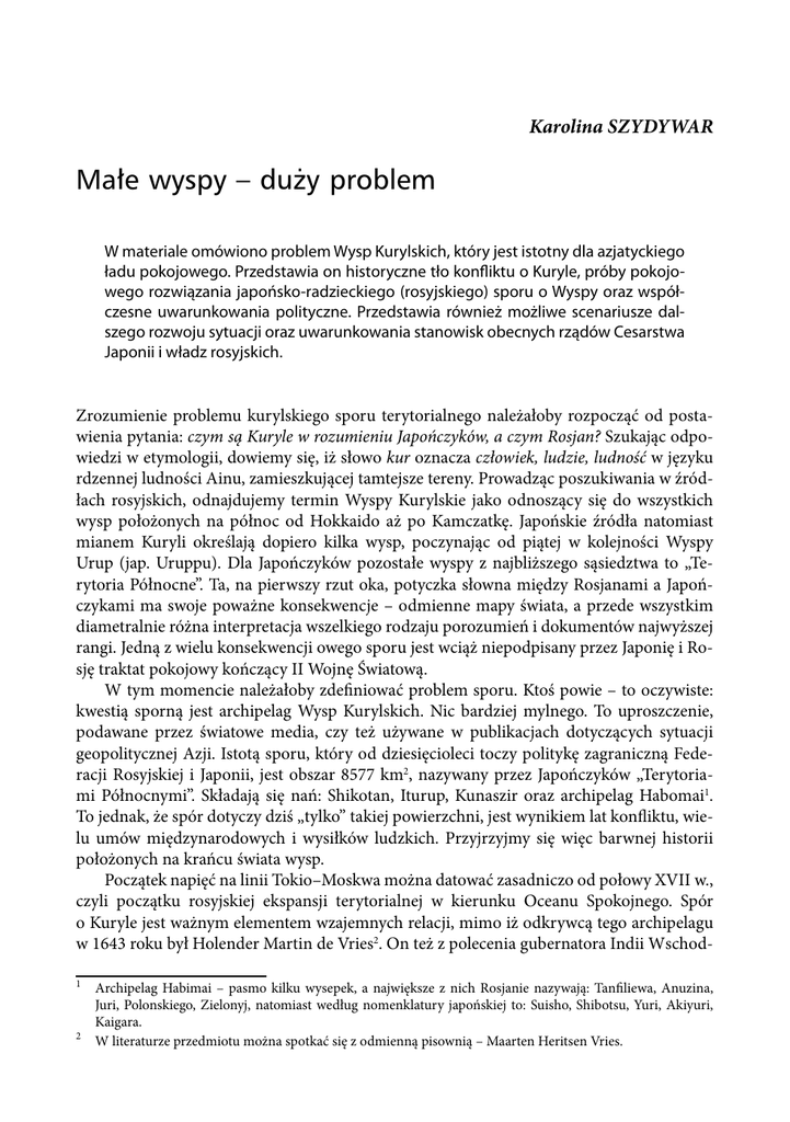 Karolina SZYDYWAR Małe wyspy – duży problem W materiale omówiono problem Wysp Kurylskich, który jest istotny dla azjatyckiego ładu pokojowego. Przedstawia on historyczne tło konfliktu o Kuryle, próby pokojowego rozwiązania japońsko-radzieckiego (rosyjskiego) sporu o Wyspy oraz współczesne uwarunkowania polityczne. Przedstawia również możliwe scenariusze dalszego rozwoju sytuacji oraz uwarunkowania stanowisk obecnych rządów Cesarstwa Japonii i władz rosyjskich. Zrozumienie problemu kurylskiego sporu terytorialnego należałoby rozpocząć od postawienia pytania: czym są Kuryle w rozumieniu Japończyków, a czym Rosjan? Szukając odpowiedzi w etymologii, dowiemy się, iż słowo kur oznacza człowiek, ludzie, ludność w języku rdzennej ludności Ainu, zamieszkującej tamtejsze tereny. Prowadząc poszukiwania w źródłach rosyjskich, odnajdujemy termin Wyspy Kurylskie jako odnoszący się do wszystkich wysp położonych na północ od Hokkaido aż po Kamczatkę. Japońskie źródła natomiast mianem Kuryli określają dopiero kilka wysp, poczynając od piątej w kolejności Wyspy Urup (jap. Uruppu). Dla Japończyków pozostałe wyspy z najbliższego sąsiedztwa to „Terytoria Północne”. Ta, na pierwszy rzut oka, potyczka słowna między Rosjanami a Japończykami ma swoje poważne konsekwencje – odmienne mapy świata, a przede wszystkim diametralnie różna interpretacja wszelkiego rodzaju porozumień i dokumentów najwyższej rangi. Jedną z wielu konsekwencji owego sporu jest wciąż niepodpisany przez Japonię i Rosję traktat pokojowy kończący II Wojnę Światową. W tym momencie należałoby zdefiniować problem sporu. Ktoś powie – to oczywiste: kwestią sporną jest archipelag Wysp Kurylskich. Nic bardziej mylnego. To uproszczenie, podawane przez światowe media, czy też używane w publikacjach dotyczących sytuacji geopolitycznej Azji. Istotą sporu, który od dziesięcioleci toczy politykę zagraniczną Federacji Rosyjskiej i Japonii, jest obszar 8577 km2, nazywany przez Japończyków „Terytoriami Północnymi”. Składają się nań: Shikotan, Iturup, Kunaszir oraz archipelag Habomai1. To jednak, że spór dotyczy dziś „tylko” takiej powierzchni, jest wynikiem lat konfliktu, wielu umów międzynarodowych i wysiłków ludzkich. Przyjrzyjmy się więc barwnej historii położonych na krańcu świata wysp. Początek napięć na linii Tokio–Moskwa można datować zasadniczo od połowy XVII w., czyli początku rosyjskiej ekspansji terytorialnej w kierunku Oceanu Spokojnego. Spór o Kuryle jest ważnym elementem wzajemnych relacji, mimo iż odkrywcą tego archipelagu w 1643 roku był Holender Martin de Vries2. On też z polecenia gubernatora Indii Wschod1 2 Archipelag Habimai – pasmo kilku wysepek, a największe z nich Rosjanie nazywają: Tanfiliewa, Anuzina, Juri, Polonskiego, Zielonyj, natomiast według nomenklatury japońskiej to: Suisho, Shibotsu, Yuri, Akiyuri, Kaigara. W literaturze przedmiotu można spotkać się z odmienną pisownią – Maarten Heritsen Vries. 304 ROCZNIK BEZPIECZEŃSTWA MIĘDZYNARODOWEGO – 2007 nich swe odkrycie naniósł na mapy i uznał za własność Holandii. Rosjanie za odkrywcę wysp uznają Władimira Atłasowa (jedna z nich nazwana została jego imieniem). Wiek XVIII upłynął pod znakiem umacniania wpływów handlowych na tych terenach. Japończycy w 1754 roku utworzyli tzw. basho3 na wyspie Kunaszir oraz na Sachalinie, na co Rosjanie odpowiedzieli założeniem faktorii handlowej na Urup w 1795 roku. Początek XIX wieku zaowocował pierwszym sporem japońsko-rosyjskim o Sachalin i Kuryle, po tym jak w 1807 roku japońska administracja zagościła na całym Sachalinie. Basho zostały zaatakowane przez ówczesną Rosyjsko-Amerykańską Kompanię Handlową. Połowa stulecia to wzmożone zainteresowanie japońskimi wyspami ze strony Stanów Zjednoczonych, Wielkiej Brytanii oraz Rosji, których rezultatem było podpisanie: traktatu z Kaganawy4 (współcześnie stanowiącej integralną część aglomeracji Jokohamy) z 31 marca 1854 roku, pieczętującego nawiązanie japońsko-amerykańskich stosunków handlowych i dyplomatycznych oraz sygnowane przez władze japońskie i brytyjskie porozumienie z 14 października 1854 roku. Owe wydarzenia oraz wybuch wojny krymskiej skłoniły strony sporu do zawarcia traktatu z Shimody (Japonia–Rosja), który podpisano w buddyjskim klasztorze jako Umowę o handlu, żegludze i delimitacji granic 7 lutego 1855 roku. W świetle rozważań nad historią japońsko-rosyjskiego sporu terytorialnego oto fragment dotyczący delimitacji granic: Odtąd granice miedzy Rosją a Japonią będą przebiegały pomiędzy wyspami Etorofu i Uruppu. Całą wyspa Etorofu należy do Japonii, a cała wyspa Uruppu i inne Wyspy Kurylskie na północy stanowią własność Rosji. W odniesieniu do wyspy Karafuto (Sachalin) pozostanie ona niepodzielona pomiędzy Rosje a Japonię, tak jak było to do tej pory5. Po kolejnych dwudziestu latach, poprzedzonych wieolma rozmowami i negocjacjami, przedstawiciele obu krajów postanowili spotkać się w Petersburgu, aby zakończyć kolejny rozdział negocjacji. Wynikało to z tego, iż rząd Japonii w 1869 roku zadeklarował gotowość rezygnacji z południowej części Sachalinu po wypełnieniu przez stronę rosyjską kilku warunków. Chodziło mianowicie o uznanie przez rząd rosyjski zwierzchnictwa Japonii nad całością Kuryli, aż po Pierwszą Cieśninę Kurylską oddzielającą wyspę Shumshu od Kamczatki. Owe rokowania zakończono podpisaniem Układu o wymianie Sachalinu na Wyspy Kurylskie z 7 maja 1875 roku. Cesję zwierzchnictwa nad osiemnastoma wyspami archipelagu określono w artykule II owego porozumienia, jednocześnie nie poruszając kwestii czterech spornych współcześnie wysp. W zamian za cesję na rzecz Rosji praw do wyspy Sachalin zastrzeżonych/wymienionych w pierwszym artykule, Jego Wysokość Cesarz Wszystkich Rosjan, w imieniu Swoim i S