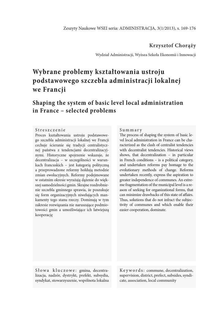 Zeszyty Naukowe WSEI seria: ADMINISTRACJA, 3(1/2013), s. 169-176 Krzysztof Chorąży Wydział Administracji, Wyższa Szkoła Ekonomii i Innowacji Wybrane problemy kształtowania ustroju podstawowego szczebla administracji lokalnej we Francji Shaping the system of basic level local administration in France – selected problems Streszczenie Summar y S ł o w a k l u c z o w e : gmina, decentralizacja, nadzór, dystrykt, prefekt, subsydia, syndykat, stowarzyszenie, wspólnota lokalna K e y w o r d s : commune, decentralization, Proces kształtowania ustroju podstawowego szczebla administracji lokalnej we Francji cechuje ścieranie się tradycji centralistycznej państwa z tendencjami decentralizacyjnymi. Historyczne spojrzenie wskazuje, że decentralizacja – w szczególności w warunkach francuskich – jest kategorią polityczną a przeprowadzone reformy hołdują metodzie zmian ewolucyjnych. Reformy podejmowane w ostatnim okresie wyrażają dążenie do większej samodzielności gmin. Skrajne rozdrobnienie szczebla gminnego sprawia, że poszukuje się form organizacyjnych niwelujących mankamenty tego stanu rzeczy. Dominują w tym zakresie rozwiązania nie naruszające podmiotowości gmin a umożliwiające ich łatwiejszą kooperację The process of shaping the system of basic level local administration in France can be characterized as the clash of centralist tendencies with decentralist tendencies. Historical views shows, that decentralization – in particular in French conditions – is a political category, and undertaken reforms pay homage to the evolutionary methods of change. Reforms undertaken recently, express the aspiration to greater independence of communes. An extreme fragmentation of the municipal level is a reason of seeking for organizational forms, that can minimize drawbacks of this state of affairs. Thus, solutions that do not infract the subjectivity of communes and which enable their easier cooperation, dominate. supervision, district, prefect, subsides, syndicate, association, local community Zeszyty Naukowe WSEI seria: ADMINISTRACJA, 3(1/2013) 170 Krzysztof Chorąży, Wybrane problemy kształtowania ustroju podstawowego szczebla... Ustrój gmin utworzonych ustawą z dnia 14 grudnia 1789 roku regulują liczne przepisy wśród których kluczową pozycję zajmuje ustawa z dnia 5 kwietnia 1884 roku, będąca podstawową częścią tzw. kodeksu gmin. Należy wskazać, że 36 390 gmin Francji metropolitalnej to jednostki bardzo zróżnicowane (o czym dalej). Wszystkie (oprócz Paryża, Marsylii i Lyonu) są zarządzane przez tak samo zorganizowane organy o jednakowych kompetencjach. Cechą wiodącą tego szczebla samorządu terytorialnego pozostaje zatem zuniformizowanie ustroju gmin mimo podejmowanych prób przezwyciężania jego skutków1. Ujednolicenie ustroju gmin było reakcją władz rewolucyjnych, które uchwalając wspomnianą ustawę z dnia 14 grudnia 1789 roku, przełamały charakterystyczne dla państwa feudalnego zróżnicowanie struktur szczebla najniższego takich, jak np. parafie czy wspólnoty miejskie i wiejskie. Istniejące do rewolucji miejskie i wiejskie wspólnoty gminne miały bardzo zróżnicowany status prawny. Rewolucja przyznała prawo wspólnotom gminnym do samodzielnego bytu, uznając je za osoby prawa publicznego i dokonując odpowiedniego podziału terytorialnego na szczeblu najniższym. Wprowadzając podział na najniższym szczeblu, władze rewolucyjne uznały wyrosły z tradycji terytorialny podział wspólnot gminnych. Utworzone gminy były jednostkami małymi (gminy jednostkowe), co przydawało im charakter jednostek naturalnych, wyodrębnionych przy uwzględnieniu określonej rzeczywistości socjologicznej. Wszystkim gminom nadano jednakowy, zuniformizowany status. Jednolitość pod względem pozycji prawnej i fakt, że gminy francuskie są jednostkami małymi, uznaje się za cechę charakterystyczną administracji francuskiej. Podział na szczeblu najniższym nie był zatem zabiegiem sztucznym, sprowadzał się raczej do uznania naturalnie istniejących wspólnot ludzkich za jednostki terytorialne, a w konsekwencji do przyznania im statusu collectivités locales, a więc jednostek wyposażonych w podmiotowość publicznoprawną. Po okresie silnej centralizacji dokonanej w ósmym roku rewolucji przejawiającej się nominowaniem mera i rady municypalnej przez władzę centralną oraz poddaniem ich hierarchicznemu zwierzchnictwu prefekta, stopniowo dokonywano decentralizacji. Proces decentralizacji gmin doznał załamania w okresie II wojny światowej, by wzmóc się pod rządami konstytucji z 1946 roku, a następnie konstytucji z 1958 roku2. W świetle obowiązujących regulacji prawnych gmina jest: 1) okręgiem samorządności lokalnej; 2) okręgiem wyborczym, w którym społeczność lokalna wybiera swych reprezentantów do rady gminy; 3) jednostką zasadniczego podziału terytorialnego państwa oraz 4) okręgiem administracji 1 2 Por. J. Jeżewski, We Francji, [w:] Gmina w wybranych państwach Europy Zachodniej, pr. zbiorowa pod red. J. Jeżewskiego, Wrocław 1995, s. 148 J. Rivero, Droit administratif, Paris 1977, s. 360 I nast. Zeszyty Naukowe WSEI seria: ADMINISTRACJA, 3(1/2013) Krzysztof Chorąży, Wybrane problemy kształtowania ustroju podstawowego szczebla... 171 państwa, w którym jest ona wykonywana przez przedstawicieli państwa część zadań państwa o wymiarze lokalnym3. Gminie jako podmiotowi prawa publicznego przysługują wszelkie kompetencje (kompetencja generalna) poza tymi, które ograniczone są ustawami, a w szczególności tymi przepisami, które wynikają z postanowień ustawy z dnia 7 stycznia 1983 roku o podziale kompetencji między państwem a wspólnotami lokalnymi. Kompetencja generalna gminy pozostaje w związku z zasadą domniemania kompetencji gminy opartej na stwierdzeniu, że gmina obejmuje wszelkie kompetencje, jeżeli nie są one zastrzeżone na rzecz innej wspólnoty lokalnej lub państwa i ni