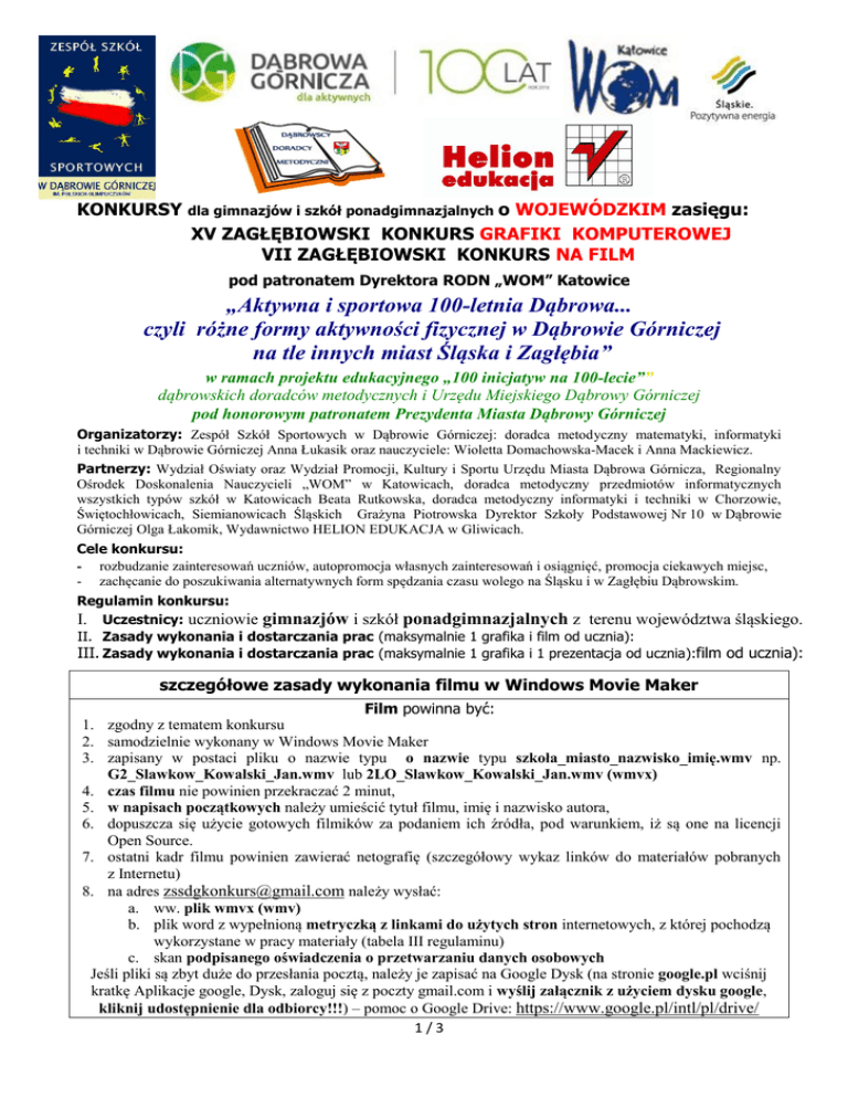 KONKURSY dla gimnazjów i szkół ponadgimnazjalnych o WOJEWÓDZKIM zasięgu: XV ZAGŁĘBIOWSKI KONKURS GRAFIKI KOMPUTEROWEJ VII ZAGŁĘBIOWSKI KONKURS NA FILM pod patronatem Dyrektora RODN „WOM” Katowice „Aktywna i sportowa 100-letnia Dąbrowa... czyli różne formy aktywności fizycznej w Dąbrowie Górniczej na tle innych miast Śląska i Zagłębia” w ramach projektu edukacyjnego „100 inicjatyw na 100-lecie”” dąbrowskich doradców metodycznych i Urzędu Miejskiego Dąbrowy Górniczej pod honorowym patronatem Prezydenta Miasta Dąbrowy Górniczej Organizatorzy: Zespół Szkół Sportowych w Dąbrowie Górniczej: doradca metodyczny matematyki, informatyki i techniki w Dąbrowie Górniczej Anna Łukasik oraz nauczyciele: Wioletta Domachowska-Macek i Anna Mackiewicz. Partnerzy: Wydział Oświaty oraz Wydział Promocji, Kultury i Sportu Urzędu Miasta Dąbrowa Górnicza, Regionalny Ośrodek Doskonalenia Nauczycieli „WOM” w Katowicach, doradca metodyczny przedmiotów informatycznych wszystkich typów szkół w Katowicach Beata Rutkowska, doradca metodyczny informatyki i techniki w Chorzowie, Świętochłowicach, Siemianowicach Śląskich Grażyna Piotrowska Dyrektor Szkoły Podstawowej Nr 10 w Dąbrowie Górniczej Olga Łakomik, Wydawnictwo HELION EDUKACJA w Gliwicach. Cele konkursu: - rozbudzanie zainteresowań uczniów, autopromocja własnych zainteresowań i osiągnięć, promocja ciekawych miejsc, - zachęcanie do poszukiwania alternatywnych form spędzania czasu wolego na Śląsku i w Zagłębiu Dąbrowskim. Regulamin konkursu: I. Uczestnicy: uczniowie gimnazjów i szkół ponadgimnazjalnych z terenu województwa śląskiego. II. Zasady wykonania i dostarczania prac (maksymalnie 1 grafika i film od ucznia): III. Zasady wykonania i dostarczania prac (maksymalnie 1 grafika i 1 prezentacja od ucznia):film od ucznia): szczegółowe zasady wykonania filmu w Windows Movie Maker Film powinna być: 1. zgodny z tematem konkursu 2. samodzielnie wykonany w Windows Movie Maker 3. zapisany w postaci pliku o nazwie typu o nazwie typu szkoła_miasto_nazwisko_imię.wmv np. G2_Slawkow_Kowalski_Jan.wmv lub 2LO_Slawkow_Kowalski_Jan.wmv (wmvx) 4. czas filmu nie powinien przekraczać 2 minut, 5. w napisach początkowych należy umieścić tytuł filmu, imię i nazwisko autora, 6. dopuszcza się użycie gotowych filmików za podaniem ich źródła, pod warunkiem, iż są one na licencji Open Source. 7. ostatni kadr filmu powinien zawierać netografię (szczegółowy wykaz linków do materiałów pobranych z Internetu) 8. na adres [email protected] należy wysłać: a. ww. plik wmvx (wmv) b. plik word z wypełnioną metryczką z linkami do użytych stron internetowych, z której pochodzą wykorzystane w pracy materiały (tabela III regulaminu) c. skan podpisanego oświadczenia o przetwarzaniu danych osobowych Jeśli pliki są zbyt duże do przesłania pocztą, należy je zapisać na Google Dysk (na stronie google.pl wciśnij kratkę Aplikacje google, Dysk, zaloguj się z poczty gmail.com i wyślij załącznik z użyciem dysku google, kliknij udostępnienie dla odbiorcy!!!) – pomoc o Google Drive: https://www.google.pl/intl/pl/drive/ 1/3 szczegółowe zasady wykonania grafiki komputerowej w Gimp Prace graficzne powinny być: 1. zgodna z tematem konkursu 2. wykonane samodzielnie w edytorze grafiki komputerowej Gimp w rozdzielczości 1200x850 px (pikseli) 3. zapisane jako plik w Gimp z zachowanymi warstwami o rozszerzeniu xcf o nazwie typu szkoła_miasto_nazwisko_imię.xcf np: G2_Katowice_Kowalski_Jan.xcf lub 2LO_Bedzin_Zych_Ala.xcf 4. dodatkowo wyeksportowane jako plik jpeg o nazwie typu szkoła_miasto_nazwisko_imię.jpg np.: G2_Katowice_Kowalski_Jan.jpg lub 2LO_Bedzin_Zych_Ala.jpg 5. nie mogą być podpisane bezpośrednio na obrazku 6. w wypadku fotomontażu należy dołączyć: a. oryginalne zdjęcia własnego autorstwa oświadczenie o samodzielnym wykonaniu zdjęć b. link do zdjęcia z Internetu wykorzystanego do fotomontażu (w tabeli w metryczce) oraz oświadczenie, że fotomontaż został wykonany samodzielnie i uczeń nie narusza praw autorskich (zdjęcie jest na licencji np. Open Source; gdzie szukać darmowych zdjęć: http://eredaktor.pl/fotografia-i-grafika/gdzie-szukac-darmowych-zdjec/ ) c. użycie ww. zdjęcia jest możliwe pod warunkiem poddania go twórczej obróbce. 7. należy wysłać na adres: [email protected] a. ww. plik jpeg zawierający grafikę b. ww. plik xcf z zachowanymi warstwami c. użyte do fotomontażu zdjęcia jako pliki jpeg (maksymalnie 6 sztuk) d. plik word z wypełnioną metryczką z linkami do użytych stron internetowych, z której pochodzą wykorzystane w pracy materiały (tabela III regulaminu) e. skan podpisanego oświadczenia o przetwarzaniu danych osobowych Jeśli pliki są zbyt duże do przesłania pocztą, należy je zapisać na Google Dysk (na stronie google.pl wciśnij kratkę Aplikacje google, Dysk, zaloguj się z poczty gmail.com i wyślij załącznik z użyciem dysku google, kliknij udostępnienie dla odbiorcy!!!) – pomoc o Google Drive: https://www.google.pl/intl/pl/drive/ Metryczka (skopiować i zapisać w postaci pliku WORD o nazwie szkoła_miasto_nazwisko_imię.doc) - do uzupełnienia i przesłania z pracą: imię nazwisko klasa autora klasa (poziom), szkoła adres szkoły, nr telefonu imię nazwisko nauczyciela (opiekuna) telefon kontaktowy, adres e-mail opiekuna Wykorzystane linki nazwa pliku stanowiącego pracę zgodna z wytycznymi w regulaminie (w tym rozszerzenie) 1. Prace przesłane po terminie do organizatora, niezgodne z tematem, niezgodne z regulaminem zostaną zdyskwalifikowane. 2. Wszystkie prace przechodzą nieodpłatnie na własność organizatora, który zastrzega sobie możliwość publikowania ich na stronie internetowej szkoły w celu reklamowania konkursu. III. Terminarz konkursu: 1. Nadesłanie prac (zgodnie z wymogami plików) w nieprzekraczalnym terminie do 7 marca 2016 r. (decyduje termin wpłynięcia prac do Ze