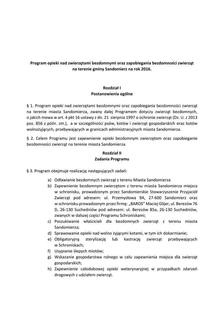 Program opieki nad zwierzętami bezdomnymi oraz zapobiegania bezdomności zwierząt na terenie gminy Sandomierz na rok 2016. Rozdział I Postanowienia ogólne § 1. Program opieki nad zwierzętami bezdomnymi oraz zapobiegania bezdomności zwierząt na terenie miasta Sandomierza, zwany dalej Programem dotyczy zwierząt bezdomnych, o jakich mowa w art. 4 pkt 16 ustawy z dn. 21 sierpnia 1997 o ochronie zwierząt (Dz. U. z 2013 poz. 856 z późn. zm.), a w szczególności psów, kotów i zwierząt gospodarskich oraz kotów wolnożyjących, przebywających w granicach administracyjnych miasta Sandomierza. § 2. Celem Programu jest zapewnienie opieki bezdomnym zwierzętom oraz zapobieganie bezdomności zwierząt na terenie miasta Sandomierza. Rozdział II Zadania Programu § 3. Program obejmuje realizację następujących zadań: a) Odławianie bezdomnych zwierząt z terenu Miasta Sandomierza b) Zapewnienie bezdomnym zwierzętom z terenu miasta Sandomierza miejsca w schronisku, prowadzonym przez Sandomierskie Stowarzyszenie Przyjaciół Zwierząt pod adresem: ul. Przemysłowa 9A, 27-600 Sandomierz oraz w schronisku prowadzonym przez firmę: „BAROS” Maciej Glijer, ul. Berezów 76 D, 26-130 Suchedniów pod adresem: ul. Berezów 85a, 26-130 Suchedniów, zwanych w dalszej części Programu Schroniskami; c) Poszukiwanie właścicieli dla bezdomnych zwierząt z terenu miasta Sandomierza; d) Sprawowanie opieki nad wolno żyjącymi kotami, w tym ich dokarmianie; e) Obligatoryjną sterylizację lub kastrację zwierząt przebywających w Schroniskach; f) Usypianie ślepych miotów; g) Wskazanie gospodarstwa rolnego w celu zapewnienia miejsca dla zwierząt gospodarskich; h) Zapewnienie całodobowej opieki weterynaryjnej w przypadkach zdarzeń drogowych z udziałem zwierząt. Rozdział III Wykonawcy Programu § 4. Realizację zadań objętych Programem prowadzą: a) Gmina Miejska Sandomierz, zwana w dalszej części Gminą, poprzez Wydział Nadzoru Komunalnego Urzędu Miejskiego w Sandomierzu oraz Straż Miejską w Sandomierzu b) Sandomierskie Stowarzyszenie Przyjaciół Zwierząt, c) „BAROS” Maciej Glijer, ul. Berezów 76 D, 26-130 Suchedniów d) Przychodnia Weterynaryjna „Animals” s.c., ul. Ożarowska 13a, 27-600 Sandomierz, zwanej w dalszej części Programu Przychodnią Weterynaryjną e) Zespół Szkół Centrum Kształcenia Rolniczego im. Ziemi Sandomierskiej ul. Mokoszyńska 1, 27-600 Sandomierz, zwany dalej gospodarstwem rolnym f) Policja Rozdział IV Zapewnienie bezdomnym zwierzętom miejsca w schronisku dla zwierząt oraz wskazanie gospodarstwa rolnego w celu zapewnienia miejsca zwierzętom gospodarskim § 5. Odławianie bezdomnych zwierząt prowadzone jest przez podmioty prowadzące Schroniska raz Straż Miejską w Sandomierzu. § 6. Odławianie zwierząt bezdomnych na terenie miasta Sandomierza jest działaniem o charakterze stałym i podejmowane jest na podstawie zgłoszeń interwencyjnych do Straży Miejskiej w Sandomierzu oraz do Schroniska przy ul. Przemysłowej 9A w Sandomierzu. § 7. Odłowione zwierzęta domowe z terenu miasta Sandomierza, co do których nie ma możliwości jednoznacznego ustaleniach właściciela lub innej osoby, pod opieką której trwale dotąd pozostawały są przewożone do Schronisk. § 8. Bezdomne zwierzęta gospodarskie podlegają przewiezieniu do Zespołu Szkół Centrum Kształcenia Rolniczego im. Ziemi Sandomierskiej w Sandomierzu, ul. Mokoszyńska 1. § 9. Zwierzęta przyjmowane do Schroniska poddawane są kwarantannie oraz zabiegom odrobaczania, obligatoryjnej sterylizacji/kastracji, czipowaniu, kompleksowym szczepieniom oraz koniecznemu leczeniu. § 10. Zapewnienie opieki odłowionym zwierzętom w schronisku do czasu przekazania do adopcji lub koniecznej eutanazji lub naturalnego zakończenia życia zwierzęcia obejmuje zabezpieczenie warunków właściwych do przetrzymywania zwierząt, opiekę weterynaryjną, oraz zapewnienie pożywienia. § 11. W przypadku ustalenia właściciela zwierzęcia bezdomnego, które zostało umieszczone w schronisku, gospodarstwie rolnym lub udzielono pomocy weterynaryjnej jako bezdomnemu, właściciel obowiązany jest zwrócić Gminie poniesione koszty związane z odłowieniem, pobytem i ewentualną opieką weterynaryjną, zgodnie z umowami zawartymi przez Gminę Sandomierz z tymi podmiotami. Rozdział V Poszukiwanie właścicieli dla bezdomnych zwierząt § 12. Poszukiwanie właścicieli dla bezdomnych zwierząt z terenu miasta Sandomierza jest realizowane przez podmiot prowadzący Schronisko oraz Sandomierskie Stowarzyszenie Przyjaciół Zwierząt m.in. poprzez umieszczanie na stronach internetowych Schroniska oraz Sandomierskiego Stowarzyszenia Przyjaciół Zwierząt aktualnych informacji dot. zwierząt przeznaczonych do adopcji. Rozdział VI Opieka nad wolno żyjącymi kotami, w tym ich dokarmianie § 13. Sprawowanie opieki nad wolno żyjącymi kotami jest realizowane przy współpracy Gminy z Przychodnią Weterynaryjną oraz Sandomierskim Stowarzyszeniem Przyjaciół Zwierząt i obejmuje: a) Zakup karmy i zapewnienie dokarmiania kotów wolno żyjących (organizacja dokarmiania kotów w terenie realizowana jest przez Sandomierskie Stowarzyszenie Przyjaciół Zwierząt) b) Sterylizację lub kastrację kotów wolno żyjących w Przychodni Weterynaryjnej c) Zapewnienie opieki weterynaryjnej rannym lub chorym kotom w Przychodni Weterynaryjnej. Rozdział VII Obligatoryjna sterylizacja lub kastracja § 14. Obligatoryjna sterylizacja lub kastracja zwierząt domowych, w szczególności psów i kotów, jest realizowana przez Schroniska przyjmujące zwierzęta bezdomne, odłowione z terenu Gminy Sandomierz, z wyjątkiem zwierząt, u których istnieją przeciwwskazania do wykonania tych zabiegów, z uwagi na stan zdrowia i/lub ich wiek. Zabiegi wykonywane są przez lekarzy weterynarii, z którymi Schroniska mają zawarte stosowne umowy. Rozdział VIII Usypianie ślepych miotów § 15. Usypianie ślepych miotów jest reali