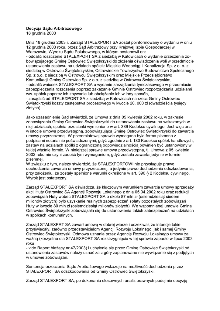 Decyzja Sądu Arbitrażowego 18 grudnia 2003 Dnia 18 grudnia 2003 r. Zarząd STALEXPORT SA został poinformowany o wydaniu w dniu 12 grudnia 2003 roku, przez Sąd Arbitrażowy przy Krajowej Izbie Gospodarczej w Warszawie, Wyroku Sądu Polubownego, w którym postanowił on: - oddalić roszczenie STALEXPORT SA z siedzibą w Katowicach o wydanie orzeczenia zobowiązującego Gminę Ostrowiec Świętokrzyski do złożenia oświadczenia woli w przedmiocie ustanowienia zastawu na udziałach spółek: Miejskie Wodociągi i Kanalizacja Sp. z o. o. z siedzibą w Ostrowcu Świętokrzyskim, Ostrowieckie Towarzystwo Budownictwa Społecznego Sp. z o.o. z siedzibą w Ostrowcu Świętokrzyskim oraz Miejskie Przedsiębiorstwo Komunikacji Gminy Ostrowiec Sp. z o.o. z siedzibą w Ostrowcu Świętokrzyskim, - oddalić wniosek STALEXPORT SA o wydanie zarządzenia tymczasowego w przedmiocie zabezpieczenia roszczenia poprzez zakazanie Gminie Ostrowiec rozporządzania udziałami ww. spółek poprzez ich zbywanie lub obciążanie ich w inny sposób, - zasądzić od STALEXPORT SA z siedzibą w Katowicach na rzecz Gminy Ostrowiec Świętokrzyski koszty zastępstwa procesowego w kwocie 20. 000 zł (dwadzieścia tysięcy złotych). Jako uzasadnienie Sąd stwierdził, że Umowa z dnia 05 kwietnia 2002 roku, w zakresie zobowiązania Gminy Ostrowiec Świętokrzyski do ustanowienia zastawu na wskazanych w niej udziałach, spełnia przesłanki wymienione w art. 389 Kodeksu cywilnego. Jest więc ona w istocie umową przedwstępną, zobowiązującą Gminę Ostrowiec Świętokrzyski do zawarcia umowy przyrzeczonej. W przedmiotowej sprawie wymagana była forma pisemna z podpisami notarialnie poświadczonymi, gdyż zgodnie z art. 180 Kodeksu spółek handlowych, zastaw na udziałach spółki z ograniczoną odpowiedzialnością powinien być ustanowiony w takiej właśnie formie. W niniejszej sprawie umowa przedwstępna, tj. Umowa z 05 kwietnia 2002 roku nie czyni zadość tym wymaganiom, gdyż została zawarta jedynie w formie pisemnej. W związku z tym, należy stwierdzić, że STALEXPORTOWI nie przysługuje prawo dochodzenia zawarcia umowy przyrzeczonej, a jedynie prawo dochodzenia odszkodowania, przy założeniu, że zostały spełnione warunki określone w art. 390 § 2 Kodeksu cywilnego. Wyrok jest ostateczny. Zarząd STALEXPORT SA oświadcza, że kluczowym warunkiem zawarcia umowy sprzedaży akcji Huty Ostrowiec SA Agencji Rozwoju Lokalnego z dnia 05.04.2002 roku oraz redukcji zobowiązań Huty wobec STALEXPORT SA o około 87 mln zł (osiemdziesiąt siedem milionów złotych) było uzyskanie realnych zabezpieczeń spłaty pozostałych zobowiązań Huty w kwocie 80 mln zł (osiemdziesiąt milionów złotych). We wspomnianej umowie Gmina Ostrowiec Świętokrzyski zobowiązała się do ustanowienia takich zabezpieczeń na udziałach w spółkach komunalnych. Zarząd STALEXPRT SA zawarł umowę w dobrej wierze i oczekiwał, że intencje takie przyświecały, zarówno przedstawicielom Agencji Rozwoju Lokalnego, jak i samej Gminy Ostrowiec Świętokrzyski. Odmowa uznania przez Agencję Rozwoju Lokalnego umowy za ważną (korzystne dla STALEXPORT SA rozstrzygnięcie w tej sprawie zapadło w lipcu 2003 roku - vide Raport bieżący nr 47/2003) i uchylenie się przez Gminę Ostrowiec Świętokrzyski od ustanowienia zastawów należy uznać za z góry zaplanowane nie wywiązanie się z podjętych w umowie zobowiązań. Sentencja orzeczenia Sądu Arbitrażowego wskazuje na możliwość dochodzenia przez STALEXPORT SA odszkodowania od Gminy Ostrowiec Świętokrzyski. Zarząd STALEXPORT SA, po dokonaniu stosownych analiz prawnych podejmie decyzję odnośnie dalszego sposobu zaspokojenia roszczeń wobec Gminy Ostrowiec Świętokrzyski. Zarząd STALEXPORT SA oświadcza, że niekorzystne - na obecnym etapie - rozstrzygnięcie sporu z Gminą Ostrowiec Świętokrzyski nie ma wpływu na zdolność Spółki do wywiązywania się z zobowiązań układowych.