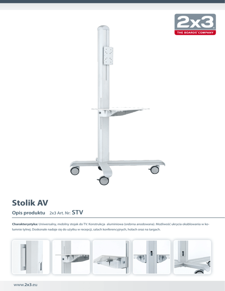 Stolik AV Opis produktu 2x3 Art. Nr: STV Charakterystyka: Uniwersalny, mobilny stojak do TV. Konstrukcja aluminiowa (srebrna anodowana). Możliwość ukrycia okablowania w kolumnie tylnej. Doskonale nadaje się do użytku w recepcji, salach konferencyjnych, holach oraz na targach. www.2x3.eu SPECYFIKACJA TECHNICZNA Stolik AV 2x3 Art. Nr STV Wysokość produktu 193 cm Wymiary blatu 56×43 cm Regulacja wysokości blatu 71-101 cm Regulacja wysokości uchwytu na monitor 117-167 cm Maksymalne obciążenie stolika Konstrukcja 30 kg aluminiowa Kolor srebrny Podstawa mobilna - kółka z blokadą Waga 34,85 kg 560 mm 2x3 S.A. 73-231 Krzęcin, ul. Słoneczna 3, Polska [i]: 801 23 00 23 [t]: +48 95 765 3848 [f]: +48 95 765 3850 [e]: [email protected] [w]: www.2x3.eu 430 mm innowacje w komunikacji wizualnej