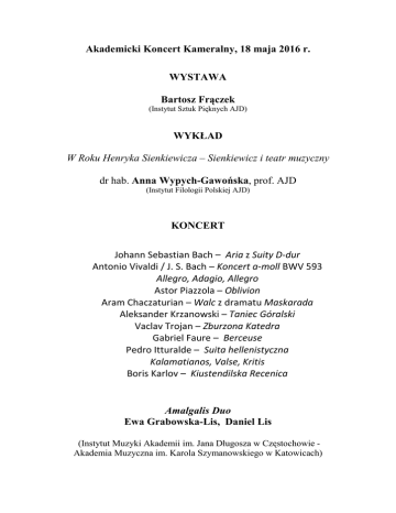 Akademicki Koncert Kameralny, 18 maja 2016 r. WYSTAWA Bartosz Frączek (Instytut Sztuk Pięknych AJD) WYKŁAD W Roku Henryka Sienkiewicza – Sienkiewicz i teatr muzyczny dr hab. Anna Wypych-Gawońska, prof. AJD (Instytut Filologii Polskiej AJD) KONCERT Johann Sebastian Bach – Aria z Suity D-dur Antonio Vivaldi / J. S. Bach – Koncert a-moll BWV 593 Allegro, Adagio, Allegro Astor Piazzola – Oblivion Aram Chaczaturian – Walc z dramatu Maskarada Aleksander Krzanowski – Taniec Góralski Vaclav Trojan – Zburzona Katedra Gabriel Faure – Berceuse Pedro Itturalde – Suita hellenistyczna Kalamatianos, Valse, Kritis Boris Karlov – Kiustendilska Recenica Amalgalis Duo Ewa Grabowska-Lis, Daniel Lis (Instytut Muzyki Akademii im. Jana Długosza w Częstochowie Akademia Muzyczna im. Karola Szymanowskiego w Katowicach) Anna Wypych-Gawrońska, dr hab., prof. Akademii im. Jana Długosza w Częstochowie. Literaturoznawca, teatrolog, historyk teatru i dramatu; zajmuje się przede wszystkim historią teatru muzycznego w Polsce. Autorka monografii: Lwowski teatr operowy i operetkowy w latach 1872-1918 (ksiąŜka otrzymała nagrodę Sekcji Krytyków Teatralnych Polskiego Ośrodka Międzynarodowego Instytutu Teatralnego „KsiąŜka Roku 1999”); Warszawski teatr operowy w latach 1832-1880; Literatura w operze. Adaptacje dramatyczno-muzyczne utworów literackich w Polsce do 1918 roku; Warszawski teatr operowy i operetkowy w latach 1880-1915; Muzyka w polskim teatrze dramatycznym do 1918 roku. Redaktorka i współredaktorka publikacji zbiorowych (m.in. pracy Iwo Gall - redutowiec, artysta teatru), autorka kilkudziesięciu artykułów i recenzji, w tym opublikowanych w "Pamiętniku Teatralnym", "Muzyce", "Przestrzeniach Teorii", "Res Facta Nova", a takŜe biogramów w "Polskim Słowniku Biograficznym". Kierownik trzech projektów badawczych – dwóch Ministerstwa Nauki i Szkolnictwa WyŜszego i jednego Narodowego Centrum Nauki. Bartosz Frączek urodził się w 1974 w Częstochowie. Studia ukończył z wyróŜnieniem, dyplomem z malarstwa w pracowni prof. Wincentego Maszkowskiego w częstochowskiej WSP w roku 1999. Aktualnie adiunkt w Katedrze Malarstwa na Wydziale Sztuki, Akademii im. Jana Długosza w Częstochowie. Ma w swym dorobku 75 wystaw indywidualnych – m. in. w Anglii, Holandii, Szwecji, Danii, Stanach Zjednoczonych, Niemczech, Belgii i na Węgrzech, Turcji oraz ponad 180 zbiorowych na całym świecie. Jego prace znajdują się w wielu prywatnych kolekcjach w kraju i za granicą, pokazywane były takŜe na targach sztuki Hanse Art (Lubeka, Oldenburg, Brema, Hamburg), Artevent expo (Antwerpia, Arnhem) czy Artistes Contemporaines (Lozanna, Geneva). Zajmuje się głównie malarstwem oraz upowszechnianiem kultury plastycznej. Jest pomysłodawcą Międzynarodowego Biennale Miniatury oraz kuratorem wielu międzynarodowych wystaw i sympozjów malarskich. Amalgalis Duo Muzycy tworzący duet są laureatami wielu międzynarodowych i krajowych konkursów muzycznych. Ich działalność artystyczna koncentruje się wokół muzyki solowej i kameralnej. Współpracowali z wieloma znakomitymi artystami. W duecie koncertują stale od 2011 roku, występując nie tylko na muzycznych festiwalach, ale przede wszystkim na licznych koncertach kameralnych. W 2014 roku zespół zdobył II nagrodę w International Master Competition for Music Teachers w Warszawie, a w 2015 roku II nagrodę w X Art Duo Music Festival w Pradze. W repertuarze zespołu znajdują się kompozycje wszystkich epok od baroku do współczesności, jak i utwory z elementami muzyki folkowej i rozrywkowej. Ewa Grabowska-Lis, absolwentka Akademii Muzycznej im. Karola Szymanowskiego w Katowicach (dyplom z wyróŜnieniem 1995). W 2001 roku ukończyła studia podyplomowe w Akademii Muzycznej w Katowicach. Obecnie jest pracownikiem naukowo-dydaktycznym Instytutu Muzyki Akademii im. Jana Długosza w Częstochowie oraz nauczycielem w Państwowej Szkole Muzycznej I st. im. Janiny Garści w Chrzanowie. Jest laureatką m.in. II nagrody na Międzynarodowym Konkursie Akordeonowym w Reinach (Szwajcaria, 1994) oraz III nagrody na Międzynarodowym Konkursie Akordeonowym w Assenovgrad (Bułgaria, 1998). Jako solistka występowała w wielu koncertach w kraju m.in. z Orkiestrą Filharmonii Częstochowskiej. W latach 1995–2005 była członkiem Śląskiego Kwintetu Akordeonowego, z którym dokonała nagrań płytowych. Występowała jako solistka i kameralistka w Polsce, Austrii, Szwajcarii, Bułgarii oraz na Litwie, Słowacji i Węgrzech. Była gościem wielu festiwali muzycznych, takich m. in. jak: Kwartet Śląski i Jego Goście, Gwiazdy Promują, Alkagran, Mikołowskie Dni Muzyki, Muzyczne Lato w Rybnej, Międzynarodowy Festiwal „Muzyka Świata” w Pabianicach, Międzynarodowy Festiwal Muzyki Akordeonowej w Przemyślu, Międzynarodowy Festiwal Muzyki Kameralnej i Organowej w Wygiełzowie i wielu innych. Była organizatorem trzech edycji Międzynarodowego Festiwalu Akordeonowej Muzyki Rozrywkowej w Częstochowie. Wielokrotnie uczestniczyła w pracach jury konkursów akordeonowych. Jej uczniowie są laureatami nagród i wyróŜnień na prestiŜowych konkursach akordeonowych. W 2013 roku w wydawnictwie Acte Prealable ukazała się jej płyta z prawykonaniami utworów Andrzeja Krzanowskiego i Edwarda Bogusławskiego. W 2015 roku uzyskała stopień doktora habilitowanego sztuki. Daniel Lis Absolwent Akademii Muzycznej im. Karola Szymanowskiego w Katowicach (dyplom z wyróŜnieniem 2000) Był stypendystą Ministra Kultury i Sztuki w latach 1997/98 i 1999/2000. Jest zwycięzcą międzynarodowych konkursów akordeonowych w Reinach (Szwajcaria, 1997), Fürstenfeld (Austria, 2000) oraz konkursów krajowych: w Czechowicach-Dziedzicach (2000), Przemyślu (1994, 1996, 1998) i Sanoku (1992). Daniel Lis jako jeden z trzech Polaków zdobył tytuł laureata odbywającego się od 1938 roku konkursu "Coupe Mondiale" w Nijmegen (Holandia, 1998). Występował jako solist