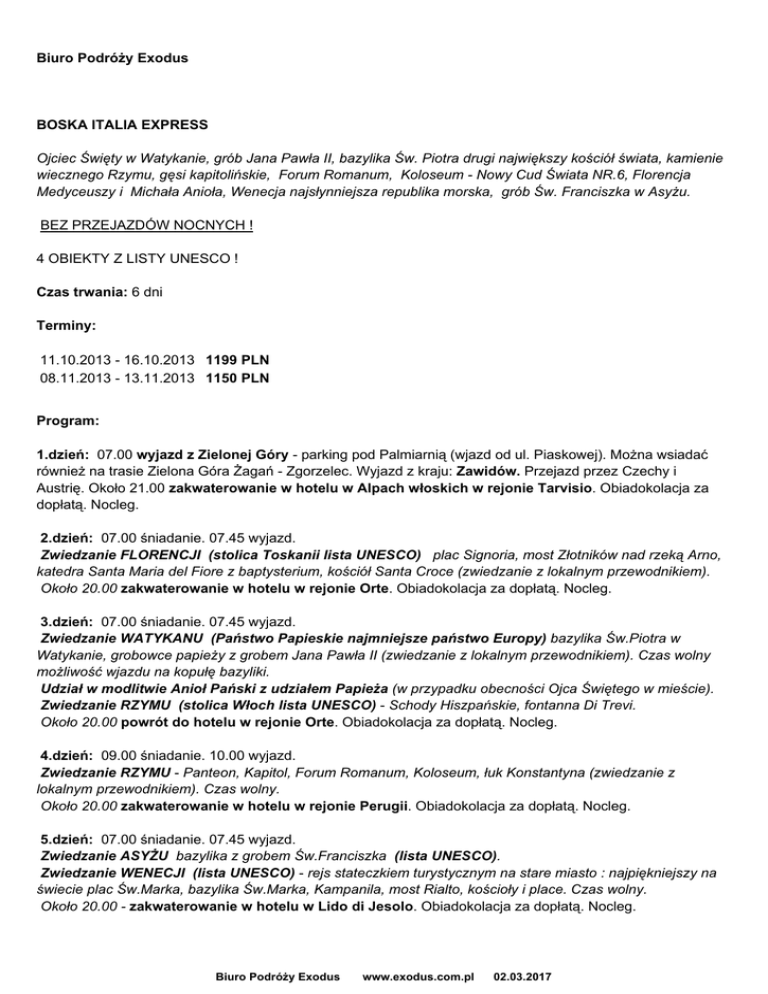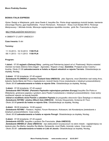 Biuro Podróży Exodus BOSKA ITALIA EXPRESS Ojciec Święty w Watykanie, grób Jana Pawła II, bazylika Św. Piotra drugi największy kościół świata, kamienie wiecznego Rzymu, gęsi kapitolińskie, Forum Romanum, Koloseum - Nowy Cud Świata NR.6, Florencja Medyceuszy i Michała Anioła, Wenecja najsłynniejsza republika morska, grób Św. Franciszka w Asyżu. BEZ PRZEJAZDÓW NOCNYCH ! 4 OBIEKTY Z LISTY UNESCO ! Czas trwania: 6 dni Terminy: 11.10.2013 - 16.10.2013 1199 PLN 08.11.2013 - 13.11.2013 1150 PLN Program: 1.dzień: 07.00 wyjazd z Zielonej Góry - parking pod Palmiarnią (wjazd od ul. Piaskowej). Można wsiadać również na trasie Zielona Góra Żagań - Zgorzelec. Wyjazd z kraju: Zawidów. Przejazd przez Czechy i Austrię. Około 21.00 zakwaterowanie w hotelu w Alpach włoskich w rejonie Tarvisio. Obiadokolacja za dopłatą. Nocleg. 2.dzień: 07.00 śniadanie. 07.45 wyjazd. Zwiedzanie FLORENCJI (stolica Toskanii lista UNESCO) plac Signoria, most Złotników nad rzeką Arno, katedra Santa Maria del Fiore z baptysterium, kościół Santa Croce (zwiedzanie z lokalnym przewodnikiem). Około 20.00 zakwaterowanie w hotelu w rejonie Orte. Obiadokolacja za dopłatą. Nocleg. 3.dzień: 07.00 śniadanie. 07.45 wyjazd. Zwiedzanie WATYKANU (Państwo Papieskie najmniejsze państwo Europy) bazylika Św.Piotra w Watykanie, grobowce papieży z grobem Jana Pawła II (zwiedzanie z lokalnym przewodnikiem). Czas wolny możliwość wjazdu na kopułę bazyliki. Udział w modlitwie Anioł Pański z udziałem Papieża (w przypadku obecności Ojca Świętego w mieście). Zwiedzanie RZYMU (stolica Włoch lista UNESCO) - Schody Hiszpańskie, fontanna Di Trevi. Około 20.00 powrót do hotelu w rejonie Orte. Obiadokolacja za dopłatą. Nocleg. 4.dzień: 09.00 śniadanie. 10.00 wyjazd. Zwiedzanie RZYMU - Panteon, Kapitol, Forum Romanum, Koloseum, łuk Konstantyna (zwiedzanie z lokalnym przewodnikiem). Czas wolny. Około 20.00 zakwaterowanie w hotelu w rejonie Perugii. Obiadokolacja za dopłatą. Nocleg. 5.dzień: 07.00 śniadanie. 07.45 wyjazd. Zwiedzanie ASYŻU bazylika z grobem Św.Franciszka (lista UNESCO). Zwiedzanie WENECJI (lista UNESCO) - rejs stateczkiem turystycznym na stare miasto : najpiękniejszy na świecie plac Św.Marka, bazylika Św.Marka, Kampanila, most Rialto, kościoły i place. Czas wolny. Około 20.00 - zakwaterowanie w hotelu w Lido di Jesolo. Obiadokolacja za dopłatą. Nocleg. Biuro Podróży Exodus www.exodus.com.pl 02.03.2017 6.dzień: 07.00 śniadanie. 07.45 wyjazd. Przejazd przez Austrię i Czechy. Przejście graniczne: Zawidów. Około 22.00 - rozwiązanie wycieczki w Zielonej Górze parking pod Palmiarnią. W cenie: autokar wysokopokładowy (klimatyzacja, wc, video, barek dodatkowo płatny) około 3600 km 5 noclegów w hotelach**/***- pokoje 2-osobowe z łazienką/WC 5 śniadań kontynentalnych opieka pilota BP EXODUS ubezpieczenie NW, KL Dodatkowe opłaty: metro Rzym 4 Eur przewodnicy lokalni: Rzym, Watykan, Florencja 20 Eur kościół St.Croce Florencja 3 Eur zestawy słuchawkowe: Rzym, Watykan, Florencja 6 Eur opłaty turystyczne: Rzym, Florencja, Asyż, Wenecja 20 Eur statek turystyczny Wenecja 20 Eur 5 obiadokolacji (na życzenie) - 60 Eur Uwaga: przy długich przejazdach autokar zatrzymuje się na 15-minutowe postoje każdorazowo po około 4-godzinnej jeździe. Nie bierzemy odpowiedzialności za punkty programu niezrealizowane z przyczyn od nas niezależnych. Biuro Podróży Exodus www.exodus.com.pl 02.03.2017