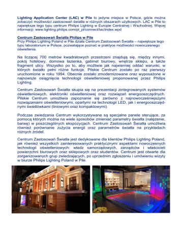 Lighting Application Center (LAC) w Pile to jedyne miejsce w Polsce, gdzie można zobaczyć możliwości zastosowań światła w różnych obszarach użytkowych. LAC w Pile to największe tego typu centrum Philips Lighting w Europie Centralnej i Wschodniej. Więcej informacji: www.lighting.philips.com/pl_pl/connect/lac/index.wpd Centrum Zastosowań Światła Philips w Pile Przy Philips Lighting Poland w Pile działa Centrum Zastosowań Światła – największe tego typu laboratorium w Polsce, pozwalające poznać w praktyce możliwości nowoczesnego oświetlenia. Na liczącej 700 metrów kwadratowych przestrzeni znajdują się, między innymi, pokój hotelowy, domowa łazienka, gabinet biurowy, wnętrze sklepu, a także fragment ulicy. Wszystko po to, aby możliwie jak najwierniej oddać warunki, w których światło pełni różne funkcje. Pilskie Centrum zostało po raz pierwszy uruchomione w roku 1994. Obecnie zostało zmodernizowane oraz wyposażone w najnowsze osiągnięcia technologii oświetleniowej proponowanej przez Philips Lighting. Centrum Zastosowań Światła skupia się na prezentacji zintegrowanych systemów oświetleniowych, elektroniki oświetleniowej oraz rozwiązań energooszczędnych. Pilskie Centrum umożliwia zapoznanie się zarówno z najnowocześniejszymi rozwiązaniami oświetleniowymi, opartymi na technologii LED, jak i energooszczędnymi świetlówkami (liniowymi oraz kompaktowymi). Podczas zwiedzania Centrum wykorzystywane są specjalne panele sterujące, za pomocą których można na wiele sposobów zmieniać parametry światła (natężenie, barwę) w poszczególnych ekspozycjach. Centrum Zastosowań Światła umożliwia również porównanie zużycia energii oraz parametrów światła na przykładach różnych źródeł. Centrum Zastosowań Światła jest dedykowane dla klientów Philips Lighting Poland, jak również wszystkich zainteresowanych praktycznymi aspektami nowoczesnych technologii oświetleniowych: władz samorządowych, zarządców i właścicieli powierzchni biurowych oraz sklepowych oraz studentów. Centrum jest otwarte dla zorganizowanych grup zwiedzających, po uprzednim zgłoszeniu i umówieniu wizyty w biurze Philips Lighting Poland w Pile.