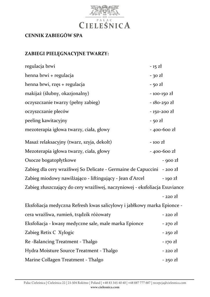 CENNIK ZABIEGÓW SPA ZABIEGI PIELĘGNACYJNE TWARZY: regulacja brwi - 15 zł henna brwi + regulacja - 30 zł henna brwi, rzęs + regulacja - 50 zł makijaż (ślubny, okazjonalny) - 100-150 zł oczyszczanie twarzy (pełny zabieg) - 180-250 zł oczyszczanie pleców - 150-200 zł peeling kawitacyjny - 50 zł mezoterapia igłowa twarzy, ciała, głowy - 400-600 zł Masaż relaksacyjny (twarz, szyja, dekolt) - 100 zł Mezoterapia igłowa twarzy, ciała, głowy - 400-600 zł Osocze bogatopłytkowe - 900 zł Zabieg dla cery wrażliwej So Delicate - Germaine de Capuccini - 200 zł Zabieg miodowy nawilżająco - liftingujący - Jean d'Arcel - 190 zł Zabieg złuszczający do cery wrażliwej, naczyniowej - eksfoliacja Exuviance - 220 zł Eksfoliacja medyczna Refresh kwas salicylowy i jabłkowy marka Epionce cera wrażliwa, rumień, trądzik różowaty - 220 zł Eksfoliacja - kwasy medyczne sale, male marka Epionce - 270 zł Zabieg Retix C Xylogic - 250 zł Re -Balancing Treatment - Thalgo - 170 zł Hydra Moisture Source Treatment - Thalgo - 220 zł Marine Collagen Treatment - Thalgo - 250 zł Hyalluronic Marine Treatment - Thalgo - 270 zł Silicium Marine Treatment - Thalgo - 290 zł PIELĘGNACJA SKÓRY WOKÓŁ OCZU: Pure Collagen Eye Pads - Thalgo - 100 zł Hyalluronic Eye Pads - Thalgo - 100 zł Mezoterapia igłowa skóry wokół oczu - 150 - 200 zł ZABIEGI NA CIAŁO Peeling całego ciała z balsamowaniem - 150zł Masaż całego ciała - 150 zł Masaż świecą aromatyczną - 200zł Zabieg czekoladowy Dr Irena Eris - 250 zł Miconized Marine Alga Body Wrap - rytualny zabieg Thalgo (peeling, maska alga, masaż) - 300 zł Polynesian Treatment Thalgo - polinezyjski rytuał - 300 zł Indoceane Treatment Thalgo - orientalny śródziemnomorski rytuał -350 zł PIELĘGNACJA DŁONI I STÓP Manicure + lakierowanie - 80 zł Manicure japoński - 70 zł Manicure SPA - 100 zł Manicure hybrydowy - 120 zł Manicure tytanowy - 130 zł Lakierowanie i zdobienie - 20-50 zł Przedłużanie paznokci metodą Acrygel - 150 zł Zabieg parafinowy - 60 zł Pedicure - 120 zł ZABIEGI DODATKOWE Depilacja woskiem: całe nogi - 150 zł bikini - 50-100 zł plecy - 40-50 zł pachy - 30 zł górna warga - 20 zł broda - 20 zł Do każdego zabiegu kosmetycznego twarzy jak i ciała dołączany jest odpowiedni rodzaj masażu.