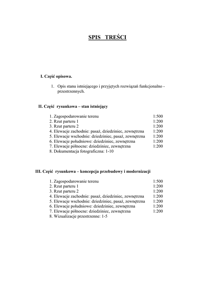 SPIS TREŚCI I. Część opisowa. 1. Opis stanu istniejącego i przyjętych rozwiązań funkcjonalno przestrzennych. II. Część rysunkowa – stan istniejący 1. Zagospodarowanie terenu 2. Rzut parteru 1 3. Rzut parteru 2 4. Elewacje zachodnie: pasaż, dziedziniec, zewnętrzna 5. Elewacje wschodnie: dziedziniec, pasaż, zewnętrzna 6. Elewacje południowe: dziedziniec, zewnętrzna 7. Elewacje północne: dziedziniec, zewnętrzna 8. Dokumentacja fotograficzna: 1-10 1:500 1:200 1:200 1:200 1:200 1:200 1:200 III. Część rysunkowa – koncepcja przebudowy i modernizacji 1. Zagospodarowanie terenu 2. Rzut parteru 1 3. Rzut parteru 2 4. Elewacje zachodnie: pasaż, dziedziniec, zewnętrzna 5. Elewacje wschodnie: dziedziniec, pasaż, zewnętrzna 6. Elewacje południowe: dziedziniec, zewnętrzna 7. Elewacje północne: dziedziniec, zewnętrzna 8. Wizualizacje przestrzenne: 1-5 1:500 1:200 1:200 1:200 1:200 1:200 1:200 CZĘŚĆ OPISOWA 1. DANE OGÓLNE. 1.1. Obiekt Pawilon Handlowo – Usługowy na os. 700 - lecia w Żywcu, przeznaczony do przebudowy i modernizacji funkcjonalno – przestrzennej. 1.2. Inwestor : - Spółdzielnia Mieszkaniowa „ GRONIE „ 34 – 300 Żywiec Os. 700 – lecia 50 2. PODSTAWA OPRACOWANIA 2.1. Zlecenie inwestora. 2.2. Kopia mapy zasadniczej. 2.3. Inwentaryzacja stanu istniejącego. 3. OPIS STANU ISTNIEJACEGO – ZAKRES OPRACOWANIA Przedmiotem opracowania jest koncepcja funkcjonalno - przestrzenna przebudowy istniejącego Pawilonu Handlowo – Usługowego zlokalizowanego na os. 700 – lecia w Żywcu. Istniejący pawilon Handlowo – usługowy składający się z 4 segmentów: 1 – Apteka, 2- Osiedlowy Dom Kultury, 3- Pawilon usługowo – handlowy + piekarnia, 4 – Pawilon usługowo – handlowy + restauracja „Kolorowa” o łącznej powierzchni zabudowy 2762,0 m2 ( wraz z pergolą ) i kubaturze 11340,52 m3 został wykonany według dokumentacji Miastoprojekt – Kraków w latach 70-tych XX- wieku jako budynek jednokondygnacyjny o konstrukcji szkieletowej- żelbetowej. Budynek w części 3 i 4 stanowi integralna całość kubaturową podzieloną na niezależne funkcje usługowo – handlowe, z wydzielonymi niezależnymi wejściami oraz zapleczami od strony dziedzińca. Z uwagi na zróżnicowanie użytkowe, budynek w poszczególnych segmentach ulegał przeróbkom i wtórny m przekształceniom w stosunku do projektu pierwotnego. Zmianie ulegał układ funkcjonalny, układ otworów zewnętrznych oraz kolorystyka elementów elewacji i stolarki. Przebudowie i modernizacji poddano stropodach pawilonu z uwzględnieniem jego termomodernizacji i uszczelnienia. Projektowana przebudowa pawilonu ma za zadanie utrzymać jego usługowo – handlowy charakter z jednoczesnym dostosowaniem układu funkcjonalnego do aktualnych potrzeb i wymogów konsumenta z jednoczesnym ujednoliceniem kolorystyki stolarki i elewacji z wykorzystaniem nowych technologii uwzględniających jego termomodernizację ( docieplenie, wymiana stolarki ). 4. DANE PODSTAWOWE : STAN ISTNIEJĄCY Powierzchnia zabudowy istniejąca Powierzchnia pomieszczeń istniejąca Kubatura istniejąca 2 762,00 m2 2 007,00 m2 11 340,52 m3 5. ZESTAWIENIE POWIERZCHNI : STAN ISTNIEJĄCY RODZAJ POMIESZCZENIA SEGMENT 1: 1.1. Fryzjer 1.2. Apteka SEGMENT 2: 2.1. Klub Akwarium 2.2. Biblioteka SEGMENT 3: 3.1. Poczta 3.2. Magiel 3.3. ARGUS- pościel 3.4. Piekarnia 3.5. Sklep odzieżowy SEGMENT 4: 4.1. Sklep odzieżowy 4.2. Naprawa RTV 4.3. Sklep spożywczy 4.4. Pasmanteria 4.5. Sklep odzieżowy 4.6. Restauracja „ Kolorowa „ POW. POMIESZCZEŃ UWAGI 38,9 m2 87,7 m2 239,2 m2 72,9 m2 45,1 m2 44,1 m2 165,7 m2 338,2 m2 49,1 m2 RAZEM 72,1 m2 56,2 m2 397,7 m2 44,2 m2 151,5 m2 204,4 m2 2007,0 m2 6. PROGRAM UŻYTKOWY PO PRZEBUDOWIE. Projektowana przebudowa i modernizacja Pawilonu Handlowo – Usługowego polega głównie na zmianie układu funkcjonalnego części segmentu 3 i 4 , utworzeniu zespołu pawilonów handlowych dostępnych z korytarza wewnętrznego oraz wyodrębnieniu sekcji sklepu spożywczego ( pozostawienie pomieszczeń piekarni oraz restauracji Kolorowa – z częściową rozbudową sali konsumpcyjnej ), zmianie układu komunikacji wewnętrznej – połączenie segmentów 3 i 4 wewnętrznym korytarzem z wykonaniem wejść od strony wschodniej i zachodniej ( do niektórych pawilonów bezpośrednio od strony północnej ). Wraz ze zmianą funkcji i układu przestrzennego projektuje się dostosowanie układu otworów zewnętrznych do powstałej funkcji z całkowitą wymianą starej stalowej stolarki i zastąpienie jej nowymi zestawami stolarki aluminiowej lub z PCV oraz ujednolicenie kolorystyki elewacji dla całego zespołu pawilonów. Koncepcja przebudowy uwzględnia rozbudowę sali konsumpcyjnej restauracji KOLOROWA w kierunku zachodnim z zastosowaniem dużych przeszkleń elewacji i doświetlenia za pomocą świetlika dachowego, będącego jednocześnie wizualnym akcentem wyodrębnionego narożnika południowo – zachodniego całego budynku. Projekt przewiduje uporządkowanie terenu wokół Pawilonu z zastosowaniem nawierzchni z kolorowej kostki betonowej, zieleni ozdobnej niskiej i wysokiej. 7. DANE PODSTAWOWE : STAN PROJEKTOWANY Powierzchnia zabudowy projektowana Powierzchnia pomieszczeń projektowana Kubatura projektowana 2 832,00 m2 2 085,70 m2 11590,00 m3 8. ZESTAWIENIE POWIERZCHNI : STAN PROJEKTOWANY RODZAJ POMIESZCZENIA SEGMENT 1: 1.1. Fryzjer 1.2. Apteka SEGMENT 2: 2.1. Klub Akwarium 2.2. Biblioteka SEGMENT 3: 3.1. Sklep odzieżowy 3.2. Piekarnia 3.3. Pawilon handlowy 3.4. Pawilon handlowy 3.5. Pawilon handlowy 3.6. Pawilon handlowy 3.7. W.C. personelu 3.8. Komunikacja SEGMENT 4: 4.1. Pawilon handlowy 4.2. Pawilon handlowy 4.3. Pawilon handlowy 4.4. Pawilon handlowy 4.5. Pawilon handlowy 4.6. Komunikacja 4.7. Sklep spożywczy 4.8. Restauracja „ Kolorowa „ POW. POMIESZCZEŃ UWAGI 38,9 m2 80,6 m2 239,2 m2 72,9 m2 49,1 m2 338,2 m2 72,5 m2 50,5 m2 40,4 m2 14,2 m2 24,4 m2 53,8 m2 RAZEM 57,7 m2 37,8 m2 65,0 m2 56,4 m2 