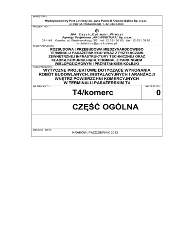 INWESTOR : Międzynarodowy Port Lotniczy im. Jana Pawła II Kraków-Balice Sp. z o.o. ul. Kpt. M. Medweckiego 1, 32-083 Balice PROJEKTANT : APA C z e c h _ D u l i ń s k i _ W r ó b e l Agencja Projektowa „ARCHITEKTURA” Sp. z o.o. 31–148 Kraków, ul. Wróblewskiego 3/2 tel: 12 631 09 60, fax: 12 631 09 61 , [email protected] TEMAT PROJEKTU: ROZBUDOWA I PRZEBUDOWA MIĘDZYNARODOWEGO TERMINALU PASAŻERSKIEGO WRAZ Z PRZYŁĄCZAMI ZEWNĘTRZNEJ INFRASTRUKTURY TECHNICZNEJ ORAZ KŁADKĄ KOMUNIKUJĄCĄ TERMINAL Z PARKINGIEM WIELOPOZIOMOWYM I PRZYSTANKIEM KOLEJKI FAZA PROJEKTU: WYTYCZNE PROJEKTOWE DOTYCZĄCE WYKONANIA ROBÓT BUDOWLANYCH, INSTALACYJNYCH I ARANŻACJI WNĘTRZ POWIERZCHNI KOMERCYJNYCH W TERMINALU PASAŻERSKIM T4 NR PROJEKTU: NR ZESZYTU: T4/komerc CZĘŚĆ OGÓLNA MIEJSCE I DATA: KRAKÓW, PAŹDZIERNIK 2013 0 WYTYCZNE PROJEKTOWE DOTYCZĄCE WYKONANIA ROBÓT BUDOWLANYCH, INSTALACYJNYCH I ARANŻACJI WNĘTRZ POWIERZCHNI KOMERCYJNYCH W TERMINALU PASAŻERSKIM T4 SPIS ZAWARTOŚCI OPRACOWANIA T4/PW/komerc – część ogólna CZĘŚĆ OPISOWA 1. DANE OGÓLNE 1.1. Inwestor 1.2. Jednostka projektowa 1.3. Podstawa opracowania 1.4. Przedmiot i zakres opracowania 1.5. Cel opracowania 2. OPIS 2.1. Lokalizacja terminalu 2.2. Przeznaczenie i program użytkowy obiektu 2.3. Charakterystyczne parametry terminalu. 2.4. Funkcja obiektu, przepływy pasażerów, strefy funkcjonalne. 2.5. Rozmieszczenie i rodzaje pomieszczeń komercyjnych w terminalu. 2.6. Dostęp personelu 2.7. Pomieszczenia socjalne, sanitarne i szatniowe 2.8. Dostawy towarów i zaopatrzenia 2.9. Pomieszczenia magazynowe 2.10. Usuwanie / segregacja odpadów 2.11. Warunki ochrony przeciwpożarowej obiektu 2.12. Warunki z zakresu bezpieczeństwa i higieny pracy 2.13. Uwagi końcowe 3. ZESTAWIENIE LOKALI (ZESZYTÓW SZCZEGÓŁOWYCH) Kraków, Październik 2013 2 WYTYCZNE PROJEKTOWE DOTYCZĄCE WYKONANIA ROBÓT BUDOWLANYCH, INSTALACYJNYCH I ARANŻACJI WNĘTRZ POWIERZCHNI KOMERCYJNYCH W TERMINALU PASAŻERSKIM T4 ZAŁĄCZNIKI – Tabelaryczne zestawienie powierzchni użytkowych pomieszczeń komercyjnych – Wytyczne i elementy budowlane z zakresu ochrony przeciwpożarowej (T4/PW/Ap.poż.) – MANUAL SIW KRAKÓW AIRPORT – wytyczne dla Systemu Informacji Wizualnej dla Międzynarodowego Portu Lotniczego im. Jana Pawła II Kraków - Balice sp. z o.o. – Opracowanie „Technologia gastronomii” – wyciąg z projektu wykonawczego (T4/PW/A/arch/zał.3) – Opracowanie „Technologia: (T4/PW/A/arch/zał.4) – Zestawienie drzwi – T4/PW/A/drzwi – Opinia Sanitarna nr NNZ.9022.1.401.2011.A z dn. 13.07.2011r. wydana przez Małopolskiego Państwowego Wojewódzkiego Inspektora Sanitarnego (dotycząca oświetlenia pomieszczeń światłem dziennym nienormatywnym – pośrednim) – Sprostowanie nr NS.9022.1.756.2013 z dn. 25.09.2013r. wydane przez Małopolskiego Państwowego Wojewódzkiego Inspektora Sanitarnego (dotyczące pomyłki w Opinii Sanitarnej nr NNZ.9022.1.401.2011.A) – Decyzja nr NNZ.9022.1.401.2011 z dn. 13.07.2011r. wydana przez Małopolskiego Państwowego Wojewódzkiego Inspektora Sanitarnego (dotycząca braku oświetlenia pomieszczeń światłem dziennym) – Opinia Sanitarna nr NS.9022.1.756.2013 z dn. 25.09.2013r. wydana przez Małopolskiego Państwowego Wojewódzkiego Inspektora Sanitarnego (dotycząca braku oświetlenia pomieszczeń światłem dziennym) Apteka” – wyciąg z projektu wykonawczego CZĘŚĆ RYSUNKOWA 1.1. 1.2. 1.3. 1.4. 1.5. 1.6. Rozmieszczenie pow. komercyjnych, piwnica, poz. -6.60..................... skala 1:300 Rozmieszczenie pow. komercyjnych, piwnica, poz. -3.60/-3.30 ........... skala 1:300 Rozmieszczenie pow. komercyjnych, parter, poz. ±0.00 ...................... skala 1:300 Rozmieszczenie pow. komercyjnych, piętro +1, poz. +3.90/+5.10........ skala 1:300 Rozmieszczenie pow. komercyjnych, piętro +2, poz. +7.80/+9.10........ skala 1:300 Rozmieszczenie pow. komercyjnych, piętro +2, poz. +12.50/+13.20 .... skala 1:300 Kraków, Październik 2013 3 WYTYCZNE PROJEKTOWE DOTYCZĄCE WYKONANIA ROBÓT BUDOWLANYCH, INSTALACYJNYCH I ARANŻACJI WNĘTRZ POWIERZCHNI KOMERCYJNYCH W TERMINALU PASAŻERSKIM T4 1. DANE OGÓLNE 1.1. Inwestor Międzynarodowy Port Lotniczy im. Jana Pawła II, Kraków-Balice Sp. z o.o., 32-083 Balice, ul. Kpt. M. Medweckiego 1, tel.: 12 639 33 01, fax 12 411 79 77, 1.2. Jednostka projektowa APA Czech-Duliński-Wróbel, Agencja Projektowa „ARCHITEKTURA” Sp. z o.o., 31-148 Kraków, ul. Wróblewskiego 3/2, tel.: 12 631 09 60, fax: 12 631 09 61, 1.3. Podstawa opracowania 1.3.1. Umowa pomiędzy Inwestorem i APA z dnia 13.06.2013 r. 1.3.2. Projekt wykonawczy uzgodniony przez Inwestora protokołem odbioru końcowego z dnia 30. 03. 2012 r. 1.4. Przedmiot i zakres opracowania 1.4.1. Przedmiotem opracowania są Wytyczne projektowe dotyczące wykonania robót budowlanych, instalacyjnych i aranżacji wnętrz powierzchni komercyjnych w terminalu pasażerskim T4. 1.4.2. Tom „T4/komerc - część ogólna” zawiera ogólną charakterystykę obiektu terminalu, opis rozmieszczenia funkcji komercyjnych, opis podstawowych procedur obowiązujących w porcie lotniczym i podstawowe wytyczne dla najemców. 1.4.3. Szczegółowe wytyczne dotyczące poszczególnych lokali komercyjnych są zawarte w tomach szczegółowych opracowanych dla każdego lokalu odrębnie. 1.5. Cel opracowania Niniejsze opracowanie służy celom komercjalizacji wyszczególnionych (wskazanych) w opracowaniu lokali handlowych w terminalu T4 2. OPIS 2.1. Lokalizacja terminalu Terminal pasażerski w Krakowie-Balicach jest elementem średniej wielkości lotniczego portu regionalnego, zlokalizowanego w odległości ok. 12 km na zachód od centrum Krakowa. Dostępność komunikacyjna jest zapewniona poprzez: bezpośredni zjazd z południowej obwodnicy autostradowej Krakowa (fragment autostrady A4), drogi lokalne bezpośrednie połączenie linią kolei aglomeracyjnej z centrum miasta. Terminal wraz z sąsiadującymi obiektami (parking wielopoz