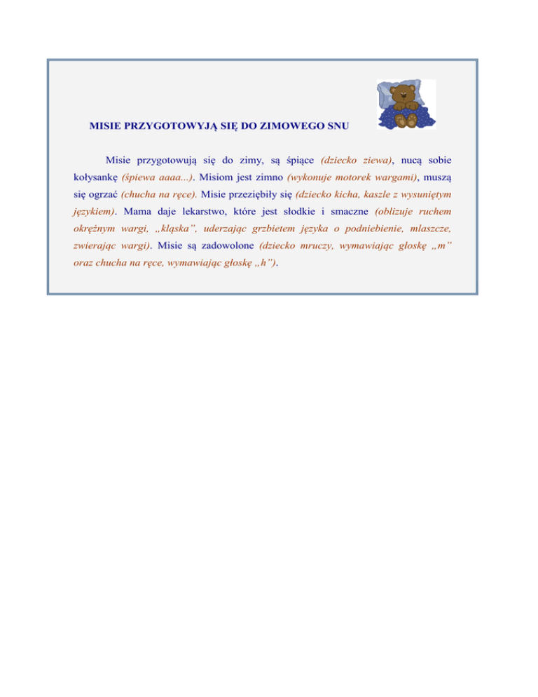 MISIE PRZYGOTOWYJĄ SIĘ DO ZIMOWEGO SNU Misie przygotowują się do zimy, są śpiące (dziecko ziewa), nucą sobie kołysankę (śpiewa aaaa...). Misiom jest zimno (wykonuje motorek wargami), muszą się ogrzać (chucha na ręce). Misie przeziębiły się (dziecko kicha, kaszle z wysuniętym językiem). Mama daje lekarstwo, które jest słodkie i smaczne (oblizuje ruchem okrężnym wargi, „kląska”, uderzając grzbietem języka o podniebienie, mlaszcze, zwierając wargi). Misie są zadowolone (dziecko mruczy, wymawiając głoskę „m” oraz chucha na ręce, wymawiając głoskę „h”).