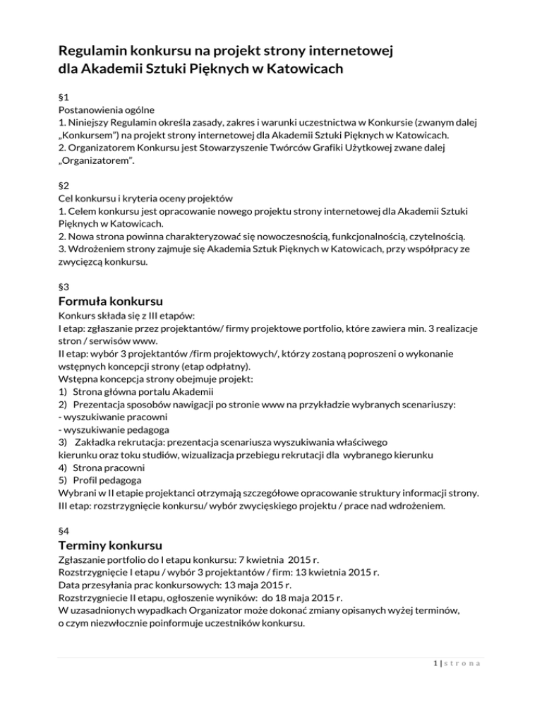 Regulamin konkursu na projekt strony internetowej dla Akademii Sztuki Pięknych w Katowicach §1 Postanowienia ogólne 1. Niniejszy Regulamin określa zasady, zakres i warunki uczestnictwa w Konkursie (zwanym dalej „Konkursem”) na projekt strony internetowej dla Akademii Sztuki Pięknych w Katowicach. 2. Organizatorem Konkursu jest Stowarzyszenie Twórców Grafiki Użytkowej zwane dalej „Organizatorem”. §2 Cel konkursu i kryteria oceny projektów 1. Celem konkursu jest opracowanie nowego projektu strony internetowej dla Akademii Sztuki Pięknych w Katowicach. 2. Nowa strona powinna charakteryzować się nowoczesnością, funkcjonalnością, czytelnością. 3. Wdrożeniem strony zajmuje się Akademia Sztuk Pięknych w Katowicach, przy współpracy ze zwycięzcą konkursu. §3 Formuła konkursu Konkurs składa się z III etapów: I etap: zgłaszanie przez projektantów/ firmy projektowe portfolio, które zawiera min. 3 realizacje stron / serwisów www. II etap: wybór 3 projektantów /firm projektowych/, którzy zostaną poproszeni o wykonanie wstępnych koncepcji strony (etap odpłatny). Wstępna koncepcja strony obejmuje projekt: 1) Strona główna portalu Akademii 2) Prezentacja sposobów nawigacji po stronie www na przykładzie wybranych scenariuszy: - wyszukiwanie pracowni - wyszukiwanie pedagoga 3) Zakładka rekrutacja: prezentacja scenariusza wyszukiwania właściwego kierunku oraz toku studiów, wizualizacja przebiegu rekrutacji dla wybranego kierunku 4) Strona pracowni 5) Profil pedagoga Wybrani w II etapie projektanci otrzymają szczegółowe opracowanie struktury informacji strony. III etap: rozstrzygnięcie konkursu/ wybór zwycięskiego projektu / prace nad wdrożeniem. §4 Terminy konkursu Zgłaszanie portfolio do I etapu konkursu: 7 kwietnia 2015 r. Rozstrzygnięcie I etapu / wybór 3 projektantów / firm: 13 kwietnia 2015 r. Data przesyłania prac konkursowych: 13 maja 2015 r. Rozstrzygniecie II etapu, ogłoszenie wyników: do 18 maja 2015 r. W uzasadnionych wypadkach Organizator może dokonać zmiany opisanych wyżej terminów, o czym niezwłocznie poinformuje uczestników konkursu. 1|s t r o n a §5 Uczestnicy konkursu 1. Konkurs ma charakter otwarty, etapowy, ogólnopolski. 2. Konkurs skierowany jest do profesjonalistów – osób fizycznych i osób prawnych zajmujących się projektowaniem graficznym. 3. Konkurs przeznaczony jest dla osób pełnoletnich. 4. Prace mogą być realizowane oraz zgłaszane do konkursu indywidualnie lub zespołowo. 5. W konkursie nie mogą brać udziału pracownicy Organizatora oraz członkowie Komisji Konkursowej, a także członkowie ich najbliższych rodzin. Osobą najbliższą jest małżonek, wstępny, zstępny, rodzeństwo, powinowaty w tej samej linii lub stopniu, osoba pozostająca w stosunku przysposobienia oraz jej małżonek, a także osoba pozostająca we wspólnym pożyciu. §6 Warunki uczestnictwa w konkursie: 1. Warunkiem udziału w konkursie jest przesłanie portfolio w formacie PDF z realizacjami minimum 3 stron internetowych wraz z linkami do tych stron, do dnia 7 kwietnia 2015 r. , 2. Zgłoszenie powinno być przesłane pocztą elektroniczną na adres mailowy: [email protected]. Załącznik z portfolio powinien nosić nazwę projektanta / studia. W treści maila należy umieścić dane kontaktowe uczestnika konkursu tj. nazwa, telefon, adres oraz adres strony www (jeśli jest). §7 Komisja Konkursowa Nadesłane na Konkurs prace ocenia Komisja Konkursowa w składzie: - dr Bogna Otto-Węgrzyn – projektantka, ASP w Katowicach, STGU - dr Justyna Kucharczyk – projektantka, ASP w Katowicach - Paweł Krzywda – projektant, ASP w Katowicach, studio Idee, STGU - Roman Kaczmarczyk –projektant, ASP w Katowicach, STGU - dr Zofia Oslislo-Piekarska –projektantka, ASP w Katowicach - dr Anna Pohl – projektantka, ASP w Katowicach - dr hab. Dawid Korzekwa – projektant, prezes STGU, ASP w Katowicach - Dominik Cymer – projektant, studio Cyber Kids on Real, STGU §8 Nagrody Wynagrodzenie dla każdego uczestnika II etapu za wstępne projekty: 1500 zł brutto Nagroda główna, obejmuje wynagrodzenie za zwycięski projekt, udział w jego wdrożeniu oraz przekazanie majątkowych praw autorskich do zwycięskiego projektu: 15 000 zł brutto. Kwoty brutto, podlegają opodatkowaniu na zasadach ogólnych, stosowny podatek zostanie potrącony przez Organizatora przed wypłatą nagrody. §9 Prawa autorskie 1. Autorzy zachowują autorskie prawa majątkowe do prac w drugim etapie konkursu. 2. Autor /autorzy, w ramach nagrody głównej, przekazują autorskie prawa majątkowe do zwycięskiego projektu. 2|s t r o n a §10 Postanowienia końcowe 1. Organizator nie odpowiada za jakąkolwiek szkodę majątkową lub niemajątkową, w tym uszczerbek, stratę, naruszenie integralności cielesnej lub straty moralne, poniesione przez Uczestnika w wyniku jego udziału w Konkursie lub w wyniku przyznania lub nieprzyznania mu nagrody. 2. Uczestnik ponosi pełną i wyłączną odpowiedzialność w przypadku, kiedy jego zgłoszenie udziału w Konkursie będzie naruszało prawa osób trzecich, postanowienia Regulaminu lub obowiązujące przepisy prawa. 3. Organizator nie ponosi odpowiedzialności za mające wpływ na prawidłowość zgłoszeń: błędy, pominięcia, kradzież, zniszczenie, zamianę, nieupoważniony dostęp do zgłoszeń, utratę zgłoszeń lub ich opóźnienie w doręczeniu Organizatorowi spowodowane przez działanie czynników pozostających poza wpływem Organizatora. 4. Organizator udostępnia w/w informacje do wiadomości uczestników za pośrednictwem Internetu, na stronie www.stgu.pl. 5. Wynagrodzenie zostanie wypłacone po sporządzeniu umowy o dzieło z projektantem/firmą projektową lub po wystawieniu faktury. 6. Wszelkie informacje o konkursie udzielane są za pośrednictwem poczty elektronicznej lub telefonicznie. 7. Laureaci mają prawo do wykorzystywania informacji o zdobyciu nagrody w celach promocyjnych. 8. Organizato