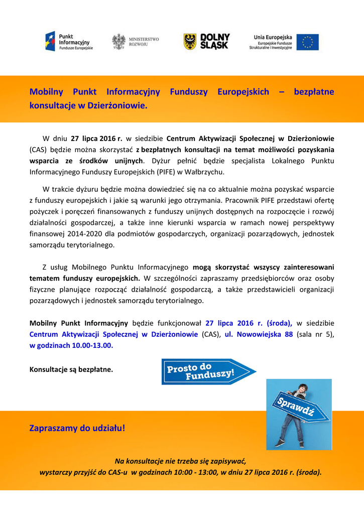 Mobilny Punkt Informacyjny konsultacje w Dzierżoniowie. Funduszy Europejskich – bezpłatne W dniu 27 lipca 2016 r. w siedzibie Centrum Aktywizacji Społecznej w Dzierżoniowie (CAS) będzie można skorzystać z bezpłatnych konsultacji na temat możliwości pozyskania wsparcia ze środków unijnych. Dyżur pełnić będzie specjalista Lokalnego Punktu Informacyjnego Funduszy Europejskich (PIFE) w Wałbrzychu. W trakcie dyżuru będzie można dowiedzieć się na co aktualnie można pozyskać wsparcie z funduszy europejskich i jakie są warunki jego otrzymania. Pracownik PIFE przedstawi ofertę pożyczek i poręczeń finansowanych z funduszy unijnych dostępnych na rozpoczęcie i rozwój działalności gospodarczej, a także inne kierunki wsparcia w ramach nowej perspektywy finansowej 2014-2020 dla podmiotów gospodarczych, organizacji pozarządowych, jednostek samorządu terytorialnego. Z usług Mobilnego Punktu Informacyjnego mogą skorzystać wszyscy zainteresowani tematem funduszy europejskich. W szczególności zapraszamy przedsiębiorców oraz osoby fizyczne planujące rozpocząć działalność gospodarczą, a także przedstawicieli organizacji pozarządowych i jednostek samorządu terytorialnego. Mobilny Punkt Informacyjny będzie funkcjonował 27 lipca 2016 r. (środa), w siedzibie Centrum Aktywizacji Społecznej w Dzierżoniowie (CAS), ul. Nowowiejska 88 (sala nr 5), w godzinach 10.00-13.00. Konsultacje są bezpłatne. Zapraszamy do udziału! Na konsultacje nie trzeba się zapisywać, wystarczy przyjść do CAS-u w godzinach 10:00 - 13:00, w dniu 27 lipca 2016 r. (środa).