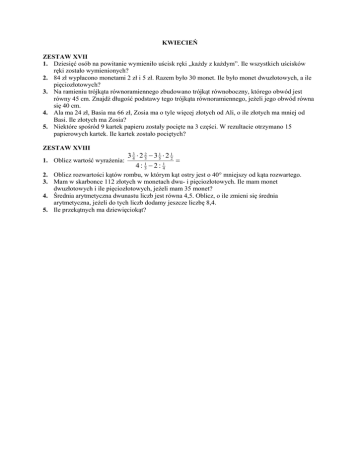 KWIECIEŃ ZESTAW XVII 1. Dziesięć osób na powitanie wymieniło uścisk ręki „każdy z każdym”. Ile wszystkich uścisków ręki zostało wymienionych? 2. 84 zł wypłacono monetami 2 zł i 5 zł. Razem było 30 monet. Ile było monet dwuzłotowych, a ile pięciozłotowych? 3. Na ramieniu trójkąta równoramiennego zbudowano trójkąt równoboczny, którego obwód jest równy 45 cm. Znajdź długość podstawy tego trójkąta równoramiennego, jeżeli jego obwód równa się 40 cm. 4. Ala ma 24 zł, Basia ma 66 zł, Zosia ma o tyle więcej złotych od Ali, o ile złotych ma mniej od Basi. Ile złotych ma Zosia? 5. Niektóre spośród 9 kartek papieru zostały pocięte na 3 części. W rezultacie otrzymano 15 papierowych kartek. Ile kartek zostało pociętych? ZESTAW XVIII 1. Oblicz wartość wyrażenia: 3 34 2 23 3 15 2 12 4 : 13 2 : 14 2. Oblicz rozwartości kątów rombu, w którym kąt ostry jest o 40 mniejszy od kąta rozwartego. 3. Mam w skarbonce 112 złotych w monetach dwu- i pięciozłotowych. Ile mam monet dwuzłotowych i ile pięciozłotowych, jeżeli mam 35 monet? 4. Średnia arytmetyczna dwunastu liczb jest równa 4,5. Oblicz, o ile zmieni się średnia arytmetyczna, jeżeli do tych liczb dodamy jeszcze liczbę 8,4. 5. Ile przekątnych ma dziewięciokąt?