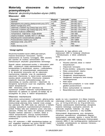 Materiały stosowane przemysłowych do budowy rurociągów Materiał akrylonitryl-butadien-styren (ABS) Własności ABS Parametr Gęstość Naprężenie przy granicy plastyczności przy 23oC Moduł Younga przy 23oC Udarność z karbem wg Charpy’ego przy 23oC Udarność z karbem wg Charpy’ego przy -40oC Twardość kulkowa (358N/30s) Temperatura mięknienia Vicata B/50N Cieplna trwałość kształtu HDT A 1,80 Mpa Współczynnik rozszerzalności cieplnej Przewodnictwo cieplne przy 23oC Absorpcja wody przy 23oC Kolor Indeks tlenowy (LOI) Wartość ≥1,035 ≥40 ≥1600 42 ≥10 87 ≥94 ≥74 0,1 0,17 ≤0,45 7001 19 Uwagi ogólne Akrylonitryl-butadien-styren (ABS) jest ważnym, masowo stosowanym tworzywem. Oprócz zastosowania do budowy rurociągów, ABS używany jest szeroko do budowy samochodów oraz wartościowych atrykułów gospodarstwa domowego. Szeroki zakres zastosowań wynika z różnorakich zalet ABS, uzyskanych dzięki odpowiedniemu doborowi komponentów, tj. akrylonitrylu, styrenu i polibutadienu, w zależności od przewidywanego zastosowania. O ile akrylonitryl przyczynia się do odporności mechanicznej materiału, oraz do poprawienia odporności chemicznej, to styren wnosi wytrzymałość i wysoką jakość powierzchni. Chemicznie związane cząsteczki kauczuku polibutadienowego zaś odpowiadają za wysoką udarność i odporność na obciążenia dynamiczne (czyli tzw. wiązkość), także w niskich temperaturach. ABS stosowany przez GF odznacza się wyważonym profilem własności wytrzymałościowych i odporności na pękanie, co sprawia, że nadaje się on szczególnie do pracy w niskich temperaturach. jednostki g/cm3 N/mm2 N/mm2 kJ/m2 kJ/m2 Mpa o C o C mm/m K W/m K % % norma EN ISO 1183-1 EN ISO 527-1 EN ISO 527-1 EN ISO 179-1/1eA EN ISO 179-1/1eA EN ISO 2039-1 ISO 306 EN ISO 75-2 DIN 51007 EN 12664 EN ISO 62 RAL ISO 4589-1 Stosownie do tego, główne pole zastosowań ABS to instalacje chłodnicze i klimatyzacyjne, a także uzdatnianie wody. Do głównych zalet ABS należą: • • • • • • • • • • • Wysoka udarność, także w niskich temperaturach Odporność korozyjna Prosta obróbka – połączenia klejone Niska przewodność cieplna Nieobecność halogenów Obojętność toksykologiczna Obojętność biologiczna, brak rozwoju mikroorganizmów Niski ciężar Niskie opory przepływu w rurze dzięki gładkim powierzchniom Dobra wytrzymałość na ścieranie Bezproblemowy recykling Własności mechaniczne Obok dobrej wytrzymałości i sztywności, główną cechą ABS jest jego wysoka udarność. Udarność określa się ilością energii udarowej, którą materiał może przejąć bez pęknięcia. Dla ABS bada się udarność z karbem, używając specjalnych, wyprodukowanych wtryskowo, próbek. Próbka taka jest osłabiana przez ostry karb, i uderzana. Próbka bez karbu nie wykazuje przełomu. Wysokie wartości udarności z karbem, także w niskich temperaturach, ukazują wysoką trwałość materiału i jego wysoką tolerancję na uszkodzenia powierzchni. Rury GF wykonane z ABS standardowo badane są pod względem wiązkości wg normy EN ISO 15493, przy czym przy temperaturze 0oC obciążnik spada na rurę z wysokości 2 m. Masa trzpienia udarowego zmienia się w zależności od średnicy rury, od 0,5 kg (d=20 mm) do 9 kg (d=225 mm). Poprzez zastosowanie ekstremalnego obciążenia trzpienia testowego uzyskujemy pewność, że doskonała wiązkość materiału nie ulega zmniejszeniu po wykonaniu z niej kształtki. Wytrzymałość długoczasową, przy obciążeniu ciśnieniem wewnętrznym, przedstawia diagram wytrzymałości czasowej, zgodny z normą EN ISO 15493 (patrz także rozdział Obliczenia i Wytrzymałość czasowa ABS). Z niej wynikają granice zastosowań rur i kształtek, przedstawione na wykresie Ciśnienie – Temperatura dla ABS. 31 GRUDZIEŃ 2007 1 Odporność na działanie chemikaliów, wpływów atmosferycznych i erozji ABS charakteryzuje się dobrą odpornością na działanie różnorakich chemikaliów. Ogólnie, ABS jest odporny na działanie wody, wodnych roztworów soli i większości rozcieńczonych kwasów i zasad. Odporność na działanie alkoholi, węglowodorów alifatycznych, olejów i tłuszczów określić można jako warunkową. ABS jest nieodporny na działanie stężonych kwasów mineralnych, organicznych i rozpuszczalników, jak estry, ketony, węglowodory chlorowane i aromatyczne. Celem uzyskania dokładniejszych informacji, prosimy przejrzeć Listę Odporności Chemicznej GF, lub zwrócić się do przedstawiciela GF. Jeśli rurociąg z ABS będzie przez dłuższy czas narażony na działanie promieni słonecznych, to jego powierzchnia straci połysk i przebarwi się do jaśniejszej szarości. Dzięki wysokiej udarności ABS, związane z tym zjawiskiem ograniczone zmniejszenie wiązkości nie powinno stwarzać żadnego problemu. W razie ekstremalnej ekspozycji na warunki atmosferyczne, lub też bardzo wysokim obciążeniu rurociągu, zalecamy ochronę powierzchni przed bezpośrednim nasłonecznieniem. Oprócz doskonałej udarności, cząsteczki butadienu w ABS przyczyniają się do jego świetnej odporności erozyjnej. Dzięki temu, rurociągi z ABS od dawna stosowane są do transportu mediów stałych i o dużej zawartości frakcji stałej, np. w górnictwie. Okazało się, że ABS, podobnie jak PE, w wielu takich zastosowaniach wykazują znaczną przewagę w stosunku do metali i innych tworzyw sztucznych. Jeśli projektujecie Państwo tego typu instalację, proszę zwrócić się do przedstawiciela GF, a my chętnie poinformujemy Was o możliwości zastosowania naszego ABS i PE do Waszego medium. Własności termiczne Własności ABS umożliwiają jego zastosowanie w szerokim zekresie temperatur, pomiędzy -40oC a +60oC. Ze wzrostem temperatury spada wytrzymałość i sztywność materiału. Maksymalną temperaturę pracy odczytacie Państwo z wykresu Ciśnienie/Temperatura. Tak jak wszystkie termoplasty, tak