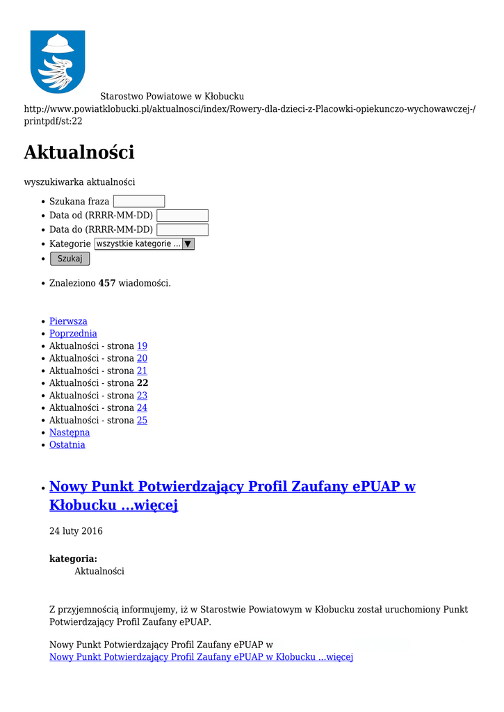 Starostwo Powiatowe w Kłobucku http://www.powiatklobucki.pl/aktualnosci/index/Rowery-dla-dzieci-z-Placowki-opiekunczo-wychowawczej-/ printpdf/st:22 Aktualności wyszukiwarka aktualności Szukana fraza Data od (RRRR-MM-DD) Data do (RRRR-MM-DD) Kategorie wszystkie kategorie ... ▼ Szukaj Znaleziono 457 wiadomości. Pierwsza Poprzednia Aktualności - strona 19 Aktualności - strona 20 Aktualności - strona 21 Aktualności - strona 22 Aktualności - strona 23 Aktualności - strona 24 Aktualności - strona 25 Następna Ostatnia Nowy Punkt Potwierdzający Profil Zaufany ePUAP w Kłobucku ...więcej 24 luty 2016 kategoria: Aktualności Z przyjemnością informujemy, iż w Starostwie Powiatowym w Kłobucku został uruchomiony Punkt Potwierdzający Profil Zaufany ePUAP. Nowy Punkt Potwierdzający Profil Zaufany ePUAP w Nowy Punkt Potwierdzający Profil Zaufany ePUAP w Kłobucku ...więcej Spotkanie w Starostwie w sprawie drogi nr 494 ...więcej 24 luty 2016 kategoria: Aktualności Starosta Kłobucki Henryk Kiepura, wspólnie z Zarządem Dróg Wojewódzkich zorganizował w Starostwie, kolejne spotkanie w sprawie remontu odcinka drogi 494 przebiegającej przez nasz powiat w ciągu Kalej-Wręczyca Wlk.-Truskolasy-Panki-Przystajń. Spotkanie w Starostwie w sprawie drogi nr 494 Spotkanie w Starostwie w sprawie drogi nr 494 ...więcej Kwalifikacja wojskowa w 2016 roku ...więcej 24 luty 2016 kategoria: Aktualności Rozpoczęła się coroczna kwalifikacja wojskowa w naszym regionie. Powiatowa Komisja Lekarska dla powiatu kłobuckiego powołana przez Wojskową Komendę Uzupełnień w Częstochowie będzie działać w okresie od 22 lutego do 17 marca 2016 roku. Kwalifikacja wojskowa w 2016 roku Kwalifikacja wojskowa w 2016 roku ...więcej XIII sesja Rady Powiatu w Kłobucku ...więcej 19 luty 2016 kategoria: Aktualności W środę 17 lutego 2016 roku odbyła się XIII sesja Rady Powiatu. XIII sesja Rady Powiatu w Kłobucku XIII sesja Rady Powiatu w Kłobucku ...więcej Nie daj się grypie! ...więcej 18 luty 2016 kategoria: Aktualności Państwowy Powiatowy Inspektor Sanitarny w Kłobucku przypomina, że sezon jesienno-zimowy to okres wzmożonych zachorowań na grypę i infekcji grypopodobnych. Nie daj się grypie! Nie daj się grypie! ...więcej „Zaszczep w sobie chęć szczepienia” ...więcej 18 luty 2016 kategoria: Aktualności W roku 2016 Inspekcja Sanitarna województwa śląskiego kontynuuje realizację Kampanii społecznej „Zaszczep w sobie chęć szczepienia” w ramach Projektu Śląskiego Państwowego Wojewódzkiego Inspektora Sanitarnego „Zdrowe dziecko – zdrowy dorosły – zdrowa rodzina”. „Zaszczep w sobie chęć szczepienia” „Zaszczep w sobie chęć szczepienia” ...więcej Wizyta robocza przedstawicieli Republiki Kazachstanu ...więcej 16 luty 2016 kategoria: Aktualności Na zaproszenie Przewodniczącego Krajowego Związku Rolników, Kółek i Organizacji Rolniczych Władysława Serafina, w sobotę 13 lutego, wizytę w naszym powiecie złożyła delegacja z Republiki Kazachstanu na czele z Erikiem Utembajewem, ambasadorem tego kraju w Polsce. Wizyta robocza przedstawicieli Republiki Kazachsta Wizyta robocza przedstawicieli Republiki Kazachstanu ...więcej Sprawozdanie z konsultacji ...więcej 15 luty 2016 kategoria: Aktualności Sprawozdanie z konsultacji dotyczących projektu uchwały Rady Powiatu w sprawie określenia zasad i trybu przyznawania nagród i wyróżnień dla sportowców i trenerów za osiągnięte wyniki sportowe oraz dla innych osób wyróżniających się osiągnięciami w działalności sportowej. Sprawozdanie z konsultacji Sprawozdanie z konsultacji ...więcej XIII Sesja Rady Powiatu w Kłobucku - 17 lutego 2015 roku ...więcej 10 luty 2016 kategoria: Aktualności W dniu 17 lutego 2016 roku o godz. 11:00 w Sali Konferencyjnej Urzędu Miejskiego w Kłobucku przy ul. 11-go Listopada 6 odbędzie się XIII Sesja Rady Powiatu w Kłobucku. XIII Sesja Rady Powiatu w Kłobucku - 17 lutego 20 XIII Sesja Rady Powiatu w Kłobucku - 17 lutego 2015 roku ...więcej Narada roczna na Komendzie Powiatowej Policji ...więcej 08 luty 2016 kategoria: Aktualności 2 lutego br. w sali konferencyjnej Komendy Powiatowej Policji odbyła się narada policjantów i pracowników cywilnych garnizonu kłobuckiego. Narada roczna na Komendzie Powiatowej Policji Narada roczna na Komendzie Powiatowej Policji ...więcej Pierwsza Poprzednia Aktualności - strona 19 Aktualności - strona 20 Aktualności - strona 21 Aktualności - strona 22 Aktualności - strona 23 Aktualności - strona 24 Aktualności - strona 25 Następna Ostatnia