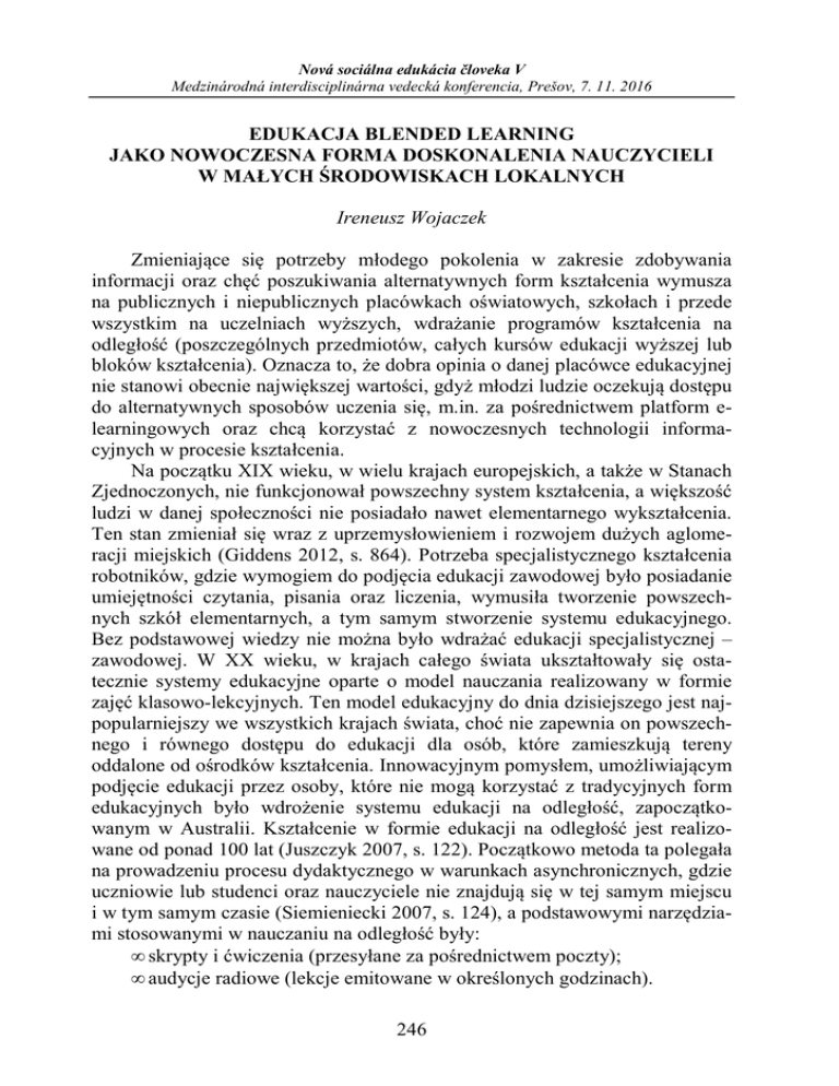 Nová sociálna edukácia človeka V Medzinárodná interdisciplinárna vedecká konferencia, Prešov, 7. 11. 2016 EDUKACJA BLENDED LEARNING JAKO NOWOCZESNA FORMA DOSKONALENIA NAUCZYCIELI W MAŁYCH ŚRODOWISKACH LOKALNYCH Ireneusz Wojaczek Zmieniające się potrzeby młodego pokolenia w zakresie zdobywania informacji oraz chęć poszukiwania alternatywnych form kształcenia wymusza na publicznych i niepublicznych placówkach oświatowych, szkołach i przede wszystkim na uczelniach wyższych, wdrażanie programów kształcenia na odległość (poszczególnych przedmiotów, całych kursów edukacji wyższej lub bloków kształcenia). Oznacza to, że dobra opinia o danej placówce edukacyjnej nie stanowi obecnie największej wartości, gdyż młodzi ludzie oczekują dostępu do alternatywnych sposobów uczenia się, m.in. za pośrednictwem platform elearningowych oraz chcą korzystać z nowoczesnych technologii informacyjnych w procesie kształcenia. Na początku XIX wieku, w wielu krajach europejskich, a także w Stanach Zjednoczonych, nie funkcjonował powszechny system kształcenia, a większość ludzi w danej społeczności nie posiadało nawet elementarnego wykształcenia. Ten stan zmieniał się wraz z uprzemysłowieniem i rozwojem dużych aglomeracji miejskich (Giddens 2012, s. 864). Potrzeba specjalistycznego kształcenia robotników, gdzie wymogiem do podjęcia edukacji zawodowej było posiadanie umiejętności czytania, pisania oraz liczenia, wymusiła tworzenie powszechnych szkół elementarnych, a tym samym stworzenie systemu edukacyjnego. Bez podstawowej wiedzy nie można było wdrażać edukacji specjalistycznej – zawodowej. W XX wieku, w krajach całego świata ukształtowały się ostatecznie systemy edukacyjne oparte o model nauczania realizowany w formie zajęć klasowo-lekcyjnych. Ten model edukacyjny do dnia dzisiejszego jest najpopularniejszy we wszystkich krajach świata, choć nie zapewnia on powszechnego i równego dostępu do edukacji dla osób, które zamieszkują tereny oddalone od ośrodków kształcenia. Innowacyjnym pomysłem, umożliwiającym podjęcie edukacji przez osoby, które nie mogą korzystać z tradycyjnych form edukacyjnych było wdrożenie systemu edukacji na odległość, zapoczątkowanym w Australii. Kształcenie w formie edukacji na odległość jest realizowane od ponad 100 lat (Juszczyk 2007, s. 122). Początkowo metoda ta polegała na prowadzeniu procesu dydaktycznego w warunkach asynchronicznych, gdzie uczniowie lub studenci oraz nauczyciele nie znajdują się w tej samym miejscu i w tym samym czasie (Siemieniecki 2007, s. 124), a podstawowymi narzędziami stosowanymi w nauczaniu na odległość były: • skrypty i ćwiczenia (przesyłane za pośrednictwem poczty); • audycje radiowe (lekcje emitowane w określonych godzinach). 246 Nová sociálna edukácia človeka V Medzinárodná interdisciplinárna vedecká konferencia, Prešov, 7. 11. 2016 Wraz z rozwojem technologii informacyjnej wdrożono system konsultacji, realizowanych w formie synchronicznej, w której przy zastosowaniu bezpośredniej komunikacji za pomocą CB-radia, uczeń mógł w czasie rzeczywistym kontaktować się z nauczycielami. Australijski system kształcenia na odległość przyjął się także w Stanach Zjednoczonych. W latach 50. XX wieku na Uniwersytecie Iowa rozpoczęto realizację projektu edukacji zdalnej przy użyciu telewizji edukacyjnej. Studenci mogli oglądać przygotowane dla nich wykłady, nadawane w określonych dniach i godzinach. Pionierem edukacji wyższej w Europie, realizowanej jako edukacja zdalna jest Uniwersytet Otwarty w Londynie (Open University), który rozpoczął swoją działalność w 1969 roku i do dnia dzisiejszego jest największą placówką pedagogiczną w Wielkiej Brytanii, która umożliwia doskonalenie się m.in. nauczycielom. Od początków swojego działania, Uniwersytet Otwarty tworzył warunki do kształcenia osób dorosłych w formie distance-learning (na odległość), a doświadczenia w tej dziedzinie zachęciły wiele innych uczelni do rozpoczęcia kształcenia zdalnego i nauczania otwartego (Wojaczek 2012, s. 270). Wprowadzenie edukacji na odległość jako sposobu kształcenia, która wykorzystuje dostępne środki komunikacji, i jako kontakt pośredni może zastępować osobisty kontakt ucznia, słuchacza lub studenta z nauczycielem zyskała akceptację wśród wielu odbiorców. Ta forma nowoczesnego edukacji dała szansę wielu osobom z małych miejscowości na podjęcie edukacji wyższej lub na przekwalifikowanie się. Nie można także zapomnieć o osobach niepełnosprawnych ruchowo, dla których edukacja online lub hybrydowa stała się jedyną możliwością do podnoszenia kwalifikacji. Od początku lat 90. XX wieku, wraz z rozwojem Internetu, zwiększyły się możliwości edukacji zdalnej. Wiele uczelni rozpoczęło wdrażanie zaawansowanych systemów obsługi studentów oraz nauczania zdalnego. Obecnie na wielu uczelniach można ukończyć różne kursy akademickie stanowiące część studiów licencjackich, magisterskich i podyplomowych. W kształceniu akademickim, edukacja zdalna prowadzona jest jako: • nauczanie za pomocą komputera bez łączności z Internetem przy wykorzystaniu programów edukacyjnych; • nauczanie za pomocą systemów telekonferencyjnych; • nauczanie za pomocą komunikatorów internetowych umożliwiających łączność indywidualną lub telekonferencyjną, z jednoczesnym przesyłaniem głosu i obrazu; • nauczanie przez e-mail; • nauczanie za pośrednictwem platform edukacji zdalnej; • nauczanie hybrydowe (łączące w sobie różne narzędzia edukacji elearningowej i edukacji tradycyjnej). 247 Nová sociálna edukácia človeka V Medzinárodná interdisciplinárna vedecká konferencia, Prešov, 7. 11. 2016 Na przełomie XX i XXI wieku dzięki powszechnemu dostępowi do szybkich łączy internetowych, nawet w małych miastach i gminach wiejskich obserwowano wzrost zaintereso