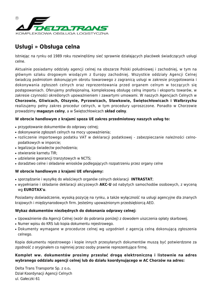 Usługi » Obsługa celna Istniejąc na rynku od 1989 roku rozwinęliśmy sieć sprawnie działających placówek świadczących usługi celne. Aktualnie posiadamy oddziały agencji celnej na obszarze Polski południowej i zachodniej, w tym na głównym szlaku drogowym wiodącym z Europy zachodniej. Wszystkie oddziały Agencji Celnej świadczą podmiotom dokonującym obrotu towarowego z zagranicą usługi w zakresie przygotowania i dokonywania zgłoszeń celnych oraz reprezentowania przed organem celnym w toczących się postępowaniach. Oferujemy profesjonalną, kompleksową obsługę celną importu i eksportu towarów, w zakresie czynności określonych upoważnieniem i zawartymi umowami. W naszych Agencjach Celnych w Chorzowie, Gliwicach, Olszynie, Pyrzowicach, Sławkowie, Świętochłowicach i Wałbrzychu realizujemy pełny zakres procedur celnych, w tym procedury uproszczone. Ponadto w Chorzowie prowadzimy magazyn celny, a w Świętochłowicach skład celny. W obrocie handlowym z krajami spoza UE zakres przedmiotowy naszych usług to: ● ● ● ● ● ● ● przygotowanie dokumentów do odprawy celnej; dokonywanie zgłoszeń celnych na mocy upoważnienia; rozliczenie importowego podatku VAT w deklaracji podatkowej - zabezpieczanie należności celnopodatkowych w imporcie; legalizacja świadectw pochodzenia; otwieranie karnetu TIR; udzielanie gwarancji tranzytowych w NCTS; doradztwo celne i składanie wniosków podlegających rozpatrzeniu przez organy celne W obrocie handlowym z krajami UE oferujemy: ● ● sporządzanie i wysyłkę do właściwych organów celnych deklaracji INTRASTAT; wypełnianie i składanie deklaracji akcyzowych AKC-U od nabytych samochodów osobowych, z wyceną wg EUROTAX'u. Posiadamy doświadczenie, wysoką pozycję na rynku, a także wyłączność na usługi agencyjne dla znanych krajowych i międzynarodowych firm. Jesteśmy upoważnionym przedsiębiorcą AEO. Wykaz dokumentów niezbędnych do dokonania odprawy celnej: ● ● ● Upoważnienie dla Agencji Celnej (wzór do pobrania poniżej) z dowodem uiszczenia opłaty skarbowej. Numer wpisu do KRS lub kopia dokumentu rejestrowego. Dokumenty wymagane w procedurze celnej wg uzgodnień z agencją celną dokonującą zgłoszenia celnego. Kopia dokumentu rejestrowego i kopie innych przesyłanych dokumentów muszą być potwierdzone za zgodność z oryginałem co najmniej przez osoby prawnie reprezentujące firmę. Komplet ww. dokumentów prosimy przesłać drogą elektroniczną i listownie na adres wybranego oddziału agencji celnej lub do działu koordynującego w AC Chorzów na adres: Delta Trans Transporte Sp. z o.o. Dział Koordynacji Agencji Celnych ul. Gałeczki 61 41- 506 Chorzów Do pobrania: FORMULARZ UPOWAŻNIENIA ZDC-31 Pełnej informacji o możliwym zakresie współpracy udzielą kierownicy naszych oddziałów Agencji Celnych: Agencja Celna Chorzów 41 -506 Chorzów, ul. Gałeczki 61 tel.: +48 32 346 17 50 / fax: 32 241 71 96 e-mail:[email protected] Kierownik oddziału: Ewa Bobrowska tel.: +48 601 507 323 e-mail:[email protected] Czas pracy: pn.- pt. 7:15 - 17:00 wszystkie procedury celne i uproszczenia Agencja Celna Pyrzowice Airport 42-625 Ożarowice, ul. Wolności 90, terminal CARGO, pok. 140.1 tel.: +48 32 784 78 77; fax: +48 32 784 78 78 e-mail: [email protected] Kierownik oddziału: Hanna Winiarczyk tel.: +48 601 843 832 e-mail: [email protected] Czas pracy: pn.-pt. 8:00 - 22:00 Po uprzedniej awizacji telefonicznej odprawy celne w godz. 22:00-6:00 oraz w sobotę i niedzielę ODPRAWY TRANSPORTÓW DROGOWYCH Agencja Celna Świętochłowice 41-605 Świętochłowice, ul. Chorzowska 109 tel.: +48 32 772 77 11/ fax: +48 32 772 77 17 e-mail: [email protected] Kierownik oddziału: Józef Potkowa tel.: +48 605 338 265 e-mail: [email protected] Czas pracy: pn. - pt. 7:00 - 18:00 Zgłoszenia celne wyłącznie w procedurze uproszczonej Agencja Celna Wałbrzych 58-304 Wałbrzych, ul. Ludowa 63 Agencja Celna Gliwice 44-100 Gliwice, ul. Portowa 28 tel.:+48 32 238 99 36/ fax: +48 32 230 78 76 e-mail: [email protected] Kierownik oddziału: Bożena Grądziel tel.: +48 601 494 633 e-mail: [email protected] Czas pracy: pn.- pt. 7:15 - 19:15 wszystkie procedury celne i uproszczenia Agencja Celna Olszyna AUTOPORT na E36 /18 68-212 Trzebiel , Budynek 30 tel.: +48 68 375 62 57/ fax: +48 68 375 62 56 e-mail: [email protected] Kierownik oddziału: Jarosław Mądry tel.: +48 601 513 676 e-mail: [email protected] Czas pracy: 24h / 7 dni w tygodniu Obsługa importu samochodów ze Szwajcari i USA. Na miejscu rzeczoznawca, AKC-u na samochody z UE. Krótki czas odpraw samochodowych w godz. 8:0020:00 Agencja Celna Sławków 41-260 Sławków, ul. Groniec 1 tel.: +48 32 714 25 09 fax: +48 32 714 25 11 e-mail: [email protected] Kierownik oddziału: Hanna Winiarczyk tel.: +48 601 843 832 e-mail: [email protected] Czas pracy: pn.- so. 7:15-19:15 Wszystkie procedury celne i uproszczenia tel.: +48 74 844 65 46 fax: +48 74 842 90 92 e-mail: [email protected] Kierownik oddziału: Dariusz Kica tel.: +48 601 843 805 e-mail: [email protected] Czas pracy: pt. - pt. 7:00-15:00 Odprawa wywozowa w procedurze uproszczonej możliwa całodobowo- po uprzednim uzgodnieniu. Galeria