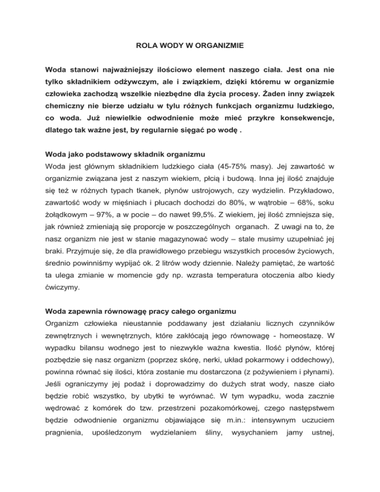 ROLA WODY W ORGANIZMIE Woda stanowi