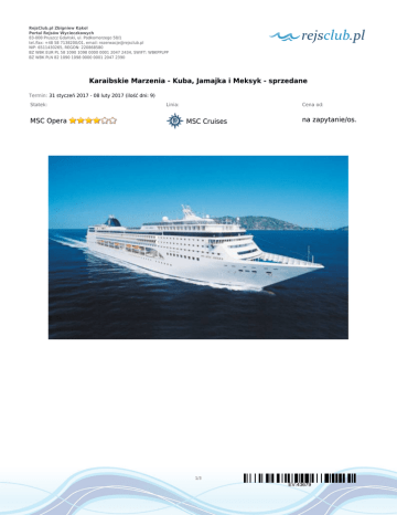RejsClub.pl Zbigniew Kąkol Portal Rejsów Wycieczkowych 83-000 Pruszcz Gdański, ul. Podkomorzego 58/1 tel./fax: +48 58 7138200/01, email: [email protected] NIP: 6511430265, REGON: 220868580 BZ WBK EUR PL 58 1090 1098 0000 0001 2047 2434, SWIFT: WBKPPLPP BZ WBK PLN 82 1090 1098 0000 0001 2047 2390 Karaibskie Marzenia - Kuba, Jamajka i Meksyk - sprzedane Termin: 31 styczeń 2017 - 08 luty 2017 (ilość dni: 9) Statek: MSC Opera Linia: Cena od: MSC Cruises na zapytanie/os. 1/3 EV:43679 RejsClub.pl Zbigniew Kąkol Portal Rejsów Wycieczkowych 83-000 Pruszcz Gdański, ul. Podkomorzego 58/1 tel./fax: +48 58 7138200/01, email: [email protected] NIP: 6511430265, REGON: 220868580 BZ WBK EUR PL 58 1090 1098 0000 0001 2047 2434, SWIFT: WBKPPLPP BZ WBK PLN 82 1090 1098 0000 0001 2047 2390 TRASA REJSU dzień 1 Data Port Wpłynięcie Wypłynięcie wtorek 31.01.2017 Hawana --:-- --:-- Legenda Kuba Zbiórka na lotnisku w Warszawie. Przelot na Kubę. Przylot do Hawany. Przejazd do portu i zaokrętowanie na statek MSC Opera. Wieczorem dla chętnych spacer po tętniącym życiem bulwarze El Malecon i hawańskiej starówce. Powrót na statek. Nocleg. dzień 2 środa 01.02.2017 Hawana --:-- --:-- Kuba Czas wolny na indywidualne zwiedzanie stolicy Kuby lub udział w wycieczce fakultatywnej pozwalającej poznać najważniejsze atrakcje tego miasta. Hawana to jedno z najwspanialszych historycznych miast zachodniej półkuli. Starówka miasta jest wpisana na Listę Światowego Dziedzictwa UNESCO. W programie m.in.: Plac Katedralny i katedra San Cristobal, El Capitolio, budynek zbudowany na wzór waszyngtońskiego Kapitolu, hotel Ambos Mundos, w którym mieszkał Hemingway, Plac Rewolucji, muzeum rumu. Wieczorem możliwość udziału w wycieczce fakultatywnej do słynnego kabaret Tropicana lub na występ Buena Vista Social Club. Nocleg na statku. dzień 3 czwartek 02.02.2017 Hawana --:-- 18:00 Kuba Czas wolny na dalsze zwiedzanie Hawany lub udział w wycieczce fakultatywnej do Parku Narodowego Vinales, kubańskiego regionu uprawy tytoniu, wpisanego na listę UNESCO, m.in.: wizyta w fabryce cygar. W godzinach popołudniowych powrót na statek. Wieczorem wypłynięcie z Hawany i rejs przez Morze Karaibskie. dzień 4 piątek 03.02.2017 Dzień na morzu --:-- --:-- dzień 5 sobota 04.02.2017 Montego Bay 09:00 20:00 Jamajka Czas wolny na indywidualne zwiedzanie Montego Bay i plażowanie lub udział w wycieczce fakultatywnej. Miasto położone w płn.zach. części Jamajki jest drugim co do wielkości miastem kraju i największym ośrodkiem wypoczynkowym wyspy. Unikalna kultura, piękne plaże, wspaniałe górskie krajobrazy, możliwość bezcłowych zakupów to tylko niektóre atuty tego miejsca. Wieczorem powrót na statek i rejs w kierunku Kajmanów. dzień 6 niedziela 05.02.2017 George Town, Wielki Kajman 09:00 15:00 Kajmany Czas wolny na indywidualne zwiedzanie stolicy Kajmanów, plażowanie i uprawianie sportów wodnych. Dla chętnych udział w wycieczce fakultatywnej. Po południu rejs w kierunku meksykańskiej wyspy Cozumel. dzień 7 poniedziałek 06.02.2017 Cozumel 10:00 18:00 Meksyk Czas wolny na indywidualne zwiedzanie, plażowanie i uprawianie sportów wodnych, m.in.: możliwość nurkowania na rafie koralowej. Dla chętnych udział w wycieczce fakultatywnej pozwalające poznać największe atrakcje wyspy, m.in.: malowniczo położone w dżungli pośrodku wyspy ruiny San Gervacio, które w czasach Majów, były miejscem kultu Ixchel – bogini księżyca i płodności. Wieczorem powrotny rejs w kierunku Kuby. dzień 8 wtorek 07.02.2017 Hawana 15:00 --:-- Kuba Czas wolny na relaks na pokładzie. Ok. godz. 15:00 wpłynięcie do Hawany i wyokrętowanie ze statku. Transfer na lotnisko i wylot do Europy. W przypadku przedłużenia rejsu o pobyt wypoczynkowy na Kubie, transfer do wybranego hotelu (propozycje hoteli przesyłamy na życzenie). dzień 9 środa 08.02.2017 Warszawa --:-- --:-- Polska Około południa przylot do Paryża, dla chętnych możliwość udziału w wycieczce po stolicy Francji. Wieczorem przelot do Polski i zakończenie imprezy. 2/3 EV:43679 RejsClub.pl Zbigniew Kąkol Portal Rejsów Wycieczkowych 83-000 Pruszcz Gdański, ul. Podkomorzego 58/1 tel./fax: +48 58 7138200/01, email: [email protected] NIP: 6511430265, REGON: 220868580 BZ WBK EUR PL 58 1090 1098 0000 0001 2047 2434, SWIFT: WBKPPLPP BZ WBK PLN 82 1090 1098 0000 0001 2047 2390 CENNIK Cena katalogowa Cena promocyjna Uwaga! Ceny za osobę w kabinie dwuosobowej. Cena zawiera: rejs statkiem MSC Opera zgodnie z programem - 7 noclegów na statku - zakwaterowanie w 2 os. kabinie wybranej kategorii; pełne wyżywienie na statku: 3 główne posiłki, podwieczorek i przekąski między posiłkami; napoje serwowane do śniadania i w bufetach samoobsługowych; serwis bagażowy podczas wejścia i zejścia ze statku oraz serwis kabinowy; korzystanie ze wszystkich urządzeń sportowo - rekreacyjnych znajdujących się na pokładzie statku (basen, jacuzzi, sala fitness, itp.); udział we wszystkich imprezach organizowanych na statku (przedstawienia w teatrze, koncerty, programy animacyjne itp.); transfery zgodnie z programem; podatki i opłaty portowe i ubezpieczenie: KL, NNW i bagaż; opiekę polskiego pilota w trakcie całej imprezy. Cena nie zawiera: biletu lotniczego; wycieczek fakultatywnych w trakcie rejsu; korzystania z barów, mini baru w kabinie oraz napojów zamawianych w restauracji - polecamy dopłatę do opcji all inclusive - szczegóły w uwagach; korzystania z punktów usługowych (fryzjer, pralnia, fotograf, salon piękności i odnowy biologicznej, internet); ubezpieczenia od kosztów rezygnacji i chorób przewlekłych; napiwków dla obsługi na statku (ok. 8,50EUR/os./dzień) oraz uznaniowych dla obsługi w hotelu; wydatków osobistych w trakcie całej imprezy; dwukrotnej Karty Turysty - 2 x ok. 23EUR/os.; opłaty wylotowej z Kuby płatnej na lotnisku (ok. 25 CUC/os.). Uwagi: w cenniku przedstawiono kabiny kategorii standard (Bella)