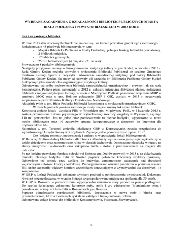 WYBRANE ZAGADNIENIA Z DZIAŁALNOŚCI BIBLIOTEK PUBLICZNYCH MIASTA BIAŁA PODLASKA I POWIATU BIALSKIEGO W 2013 ROKU Sieć i organizacja bibliotek W roku 2013 stan ilościowy bibliotek nie zmienił się, na terenie powiatów grodzkiego i ziemskiego funkcjonowało 45 placówek bibliotecznych, w tym: - Miejska Biblioteka Publiczna w Białej Podlaskiej, pełniąca funkcję biblioteki powiatowej, - 2 biblioteki miejskie, - 17 bibliotek gminnych, - 25 filii bibliotecznych (4 miejskie i 21 na wsi). Prowadzono 8 punktów bibliotecznych. Nastąpiły pozytywne zmiany w funkcjonowaniu instytucji kultury w gm. Kodeń, w kwietniu 2013 r. Rada Gminy Kodeń podjęła uchwałę o wyłączeniu Biblioteki Publicznej ze struktur Gminnego Centrum Kultury, Sportu i Turystyki i utworzenie samodzielnej instytucji pod nazwą Biblioteka Publiczna Gminy Kodeń. Na mocy tej uchwały od września br. Biblioteka Publiczna Gminy Kodeń funkcjonuje jako samodzielna organizacyjnie instytucja kultury. Odnotowano też próby pozbawienia bibliotek samodzielności organizacyjno – prawnej, jak na razie bezskuteczne. Podjęte przez samorządy w 2012 r. uchwały intencyjne dotyczące planów połączenia bibliotek z innymi instytucjami kultury, w mieście Międzyrzec Podlaski planowano włączenie MBP w struktury MOK oraz w gm. Rokitno połączenie GBP i GIK, zostały w 2013 r. negatywnie zaopiniowane przez Ministra Kultury i Dziedzictwa Narodowego. Aktualnie tylko w gm. Biała Podlaska biblioteki funkcjonują w strukturach organizacyjnych GOK. W dwóch gminach powiatu ziemskiego miały miejsce zmiany lokalowe bibliotek. Korzystną zmianę lokalu uzyskała Filia w Wysokiem gm. Międzyrzec Podl., w I kwartale 2013 r. została przeniesiona z domu prywatnego do wybudowanej świetlicy wiejskiej w Wysokiem, zajmuje 130 m2 powierzchni. Jest to jedno duże pomieszczenie na piętrze budynku, wyposażone w nowe meble biblioteczne oraz 10 zestawów sprzętu komputerowego z dostępem do Internetu dla użytkowników filii. Natomiast w gm. Terespol zmieniła lokalizację GBP w Koroszczynie, została przeniesiona do wybudowanego Urzędu Gminy w Kobylanach. Zajmuje jedno pomieszczenie o pow. 21 m2 . Oto kolejne remonty, modernizacje i zmiany w wyposażeniu lokali bibliotecznych. W Barwnej Multimedialnej Bibliotece dla Dzieci i Młodzieży wymieniono jasną część wykładziny w dziale dziecięcym oraz zamontowano rolety w oknach dachowych. Doposażono placówkę w regały na zbiory muzyczne i audiobooki oraz zakupiono fotele i stoliki z przeznaczeniem na miejsca dla rodziców. Po raz kolejny pozyskany fundusz sołecki wsi Szóstka gm. Drelów pozwolił w 2013 r. na dokończenie remontu elewacji budynku Filii w Szóstce poprzez położenie kolorowej struktury tynkowej. Odnowiono też schody przy wejściu do budynku, zamontowano zadaszenie nad drzwiami wejściowymi i ułożono kostkę chodnikową. Przeorganizowano również przestrzeń w pomieszczeniach filii, które zapewniło większy komfort czytelnikom korzystającym z wypożyczalni dla dorosłych i z komputerów. W GBP w Leśnej Podlaskiej dokonano wymiany podłogi w pomieszczeniu wypożyczalni. Dokonano również przemeblowania, w wyniku którego wygospodarowano miejsce na spotkania dla 30. osób. W GBP w Rossoszu w pomieszczeniu wypożyczalni zmieniono stary parkiet na panele podłogowe. Do kącika dziecięcego zakupiono kolorowe pufy, stolik i gry edukacyjne. Wymieniono okna i pomalowano ściany w lokalu Filii w Romaszkach gm. Rossosz. Poprzez odmalowanie pomieszczeń biblioteki, doposażenie w nowe stoły i biurka oraz przemeblowanie, GBP w Łomazach zyskała na estetyce i funkcjonalności lokalu. Odnotowano zakup krzeseł do bibliotek w Konstantynowie, Piszczacu, Sławatyczach. 5 Kształtowanie zbiorów bibliotecznych Do bibliotek publicznych powiatów grodzkiego i ziemskiego w roku 2013 wpłynęło 20 436 książek, w tym: - do bibliotek miejskich 11 102 wol., tj. 54,33 % ogółu wpływów, z czego w Białej Podlaskiej 9 558 wol. tj. 46,77 % - do bibliotek wiejskich 9 334 wol., tj. 45,67 % ogółu wpływów. Zakup nowości wydawniczych wyniósł 17 092 wol. (83,64 % wpływów), w tym: - do placówek miejskich 8 565 wol., tj. 50,11 % ogółu zakupu, z czego w Białej Podlaskiej 7 307 wol., tj. 42,75 % - do placówek wiejskich 8 527 wol., tj. 49,89% ogółu zakupu. Zmiany zachodzące w zbiorach w latach 2012 – 2013 Miasto Biała Podlaska wpływ księgozbioru w tym zakup zakup na 100 mieszkańców kwota wydatkowana na zakup książek średnia cena książki ubytek księgozbioru w tym w wyniku selekcji stan księgozbioru stan zbiorów specjalnych wydatki na zakup zbiorów specjalnych 2012 r. 43 711 6 398 11,03 132 101,72 20,65 69 562 25 508 198 970 10 667 13 580,36 2013 r. 9 558 7 307 12,62 150 655,34 20,62 7 976 7 488 200 528 11 496 17 795,25 różnica -34 153 +909 +1,59 +18 553,62 -0,03 -61 586 -18 020 +1 558 +829 +4 214,89 Powiat ziemski wpływ księgozbioru w tym zakup zakup na 100 mieszkańców kwota wydatkowana na zakup książek średnia cena książki ubytek księgozbioru w tym w wyniku selekcji stan księgozbioru stan zbiorów specjalnych wydatki na zakup zbiorów specjalnych 2012 r. 11 234 10 318 9,06 190 409,48 18,45 22 431 22 222 330 229 371 582,32 2013 r. 10 878 9 785 8,64 189 274,46 19,34 12 040 11 493 329 067 406 363,01 różnica -356 -533 -0,42 -1 135,02 +0,89 -10 391 - 10 729 -1 162 +35 -219,31 W porównaniu do roku ubiegłego wzrosły środki finansowe przeznaczone na wzbogacenie zasobów placówek bibliotecznych miasta Biała Podl. o nowe, poszukiwane przez użytkowników tytuły dostępne na rynku wydawniczym. W sumie organizator MBP w Białej Podl. przeznaczył na ten cel 117 768 zł (+17 885 zł), natomiast fundusze ministerialne wynosiły 50 683 zł i były wyższe o 4 884 zł. Fundusze przeznaczone przez organizatorów bibliotek na uzupełnianie zbiorów w nowości wydawnicze w poszczególnych gminach powiatu ziemskiego są bardzo zróżnicowane, najbardziej