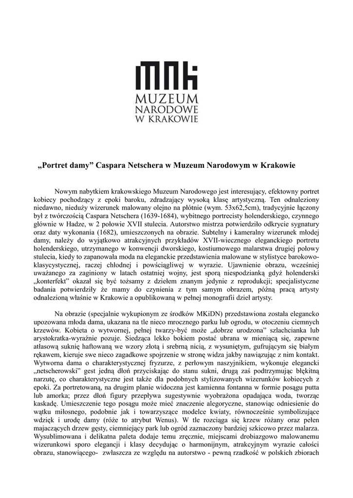 „Portret damy” Caspara Netschera w Muzeum Narodowym w Krakowie Nowym nabytkiem krakowskiego Muzeum Narodowego jest interesujący, efektowny portret kobiecy pochodzący z epoki baroku, zdradzający wysoką klasę artystyczną. Ten odnaleziony niedawno, nieduży wizerunek malowany olejno na płótnie (wym. 53x62,5cm), tradycyjnie łączony był z twórczością Caspara Netschera (1639-1684), wybitnego portrecisty holenderskiego, czynnego głównie w Hadze, w 2 połowie XVII stulecia. Autorstwo mistrza potwierdziło odkrycie sygnatury oraz daty wykonania (1682), umieszczonych na obrazie. Subtelny i kameralny wizerunek młodej damy, należy do wyjątkowo atrakcyjnych przykładów XVII-wiecznego eleganckiego portretu holenderskiego, utrzymanego w konwencji dworskiego, kostiumowego malarstwa drugiej połowy stulecia, kiedy to zapanowała moda na eleganckie przedstawienia malowane w stylistyce barokowoklasycystycznej, raczej chłodnej i powściągliwej w wyrazie. Ujawnienie obrazu, wcześniej uważanego za zaginiony w latach ostatniej wojny, jest sporą niespodzianką gdyż holenderski „konterfekt” okazał się być tożsamy z dziełem znanym jedynie z reprodukcji; specjalistyczne badania potwierdziły że mamy do czynienia z tym samym obrazem, późną pracą artysty odnalezioną właśnie w Krakowie a opublikowaną w pełnej monografii dzieł artysty. Na obrazie (specjalnie wykupionym ze środków MKiDN) przedstawiona została elegancko upozowana młoda dama, ukazana na tle nieco mrocznego parku lub ogrodu, w otoczeniu ciemnych krzewów. Kobieta o wytwornej, pełnej twarzy-być może „dobrze urodzona” szlachcianka lub arystokratka-wyraźnie pozuje. Siedząca lekko bokiem postać ubrana w mieniącą się, zapewne atłasową suknię haftowaną we wzory złotą i srebrną nicią, z wysuniętym, gufrującym się białym rękawem, kieruje swe nieco zagadkowe spojrzenie w stronę widza jakby nawiązując z nim kontakt. Wytworna dama o charakterystycznej fryzurze, z perłowym naszyjnikiem, wykonuje elegancki „netscherowski” gest jedną dłoń przyciskając do stanu sukni, drugą zaś podtrzymując błękitną narzutę, co charakterystyczne jest także dla podobnych stylizowanych wizerunków kobiecych z epoki. Za portretowaną, na drugim planie widoczna jest kamienna fontanna w formie posągu putta lub amorka; przez dłoń figury przepływa sugestywnie wyobrażona opadająca woda, tworząc kaskadę. Umieszczenie tego posągu może mieć znaczenie alegoryczne, stanowiąc odniesienie do wątku miłosnego, podobnie jak i towarzyszące modelce kwiaty, równocześnie symbolizujące wdzięk i urodę damy (róże to atrybut Wenus). W tle rozciąga się krzew różany oraz pełen majaczących drzew gęsty, ciemniejący park lub ogród zaznaczony bardziej szkicowo przez malarza. Wysublimowana i delikatna paleta dodaje temu zręcznie, miejscami drobiazgowo malowanemu wizerunkowi sporo elegancji i klasy decydując o harmonijnym, atrakcyjnym wyrazie całości obrazu, stanowiącego- zwłaszcza ze względu na autorstwo - pewną rzadkość w polskich zbiorach muzealnych. Autor obrazu, Caspar Netscher uznawany jest za jednego z najważniejszych portrecistów holenderskich XVII w., działających już w czasach zmierzchu „Złotego Wieku” Republiki Zjednoczonych Prowincji. Początkowo szkolił się on u znanego malarza scen rodzajowych Gerarda Terborcha w Deventer. Netscher przejął od niego charakterystyczny, odtąd wielokrotnie powtarzany sposób komponowania scen i „mieniący się” sposób malowania. Nauki malarstwa dopełnił następnie we Francji, gdyż przed 1660 rokiem znalazł się w Bordeaux (w rezultacie do Włoch nigdy nie trafił). Jednak, na początku lat 60. powrócił do Holandii, na stałe osiadając w Hadze. Zyskał tam liczną klientelę dzięki powtarzanym w różnych wariantach kompozycjom Terborcha, ale też malowanym przez siebie kameralnym, eleganckim scenom rodzajowym utrzymanym w nieco miniatorskim charakterze, w typie popularnych wówczas kompozycji malarzy z Delft. Jednak największe sukcesy i powodzenie osiągnął jako portrecista. Ten gatunek sztuki malarskiej zaabsorbował artystę najbardziej, jako główny punkt malarskich zainteresowań, począwszy od lat przed 1670 rokiem. W tej specjalizacji Netscher osiągnął najlepsze rezultaty powtarzając już do śmierci typ wysublimowanego, skonwencjonalizowanego wizerunku szlachecko-dworskiego w którym ukazywał swych modeli, zarówno mężczyzn jak i kobiety na tle kotary i parkowego lub ogrodowego krajobrazu z chętnie wprowadzanym antycznym posągiem. Malarz przejął ten wytworny, arystokratyczny typ wizerunku od Antona van Dycka, Flamanda czynnego głównie na terenie Anglii oraz od francuskich malarzy barokowych. Nie mniej ważnym, wręcz decydującym źródłem inspiracji była twórczość innych haskich portrecistów, nieco wcześniej stosujących ten wyrafinowany, chętnie przez nich rozwiązywany typ raczej kameralnych eleganckich wizerunków, wyraźnie vandyckowskich i nieco nostalgicznych w wyrazie (autorstwa mistrzów takich jak np. Adriaen Hanneman, Jan Mytens (Mijtens) czy Jan de Baen). Ich rozwiązania Netscher przetransponował na mały format, podobnie jak w prezentowanym obrazie który mógł stanowić parę z innym wizerunkiem (pendant), zgodnie ze zwyczajem zestawiania wizerunków małżeńskich lub par. Haski mistrz słynął z wielkiej biegłości i finezji w oddawaniu faktury miękkich, lśniących tkanin oraz nawet drobnych szczegółów jak elementy stroju: koronki, żaboty itp. Chętnie stosował on lśniącą, błyszczącą paletę, w interesujący i subtelny sposób używając często rozbielonej, wyszukanej gamy barwnej łączonej z ciemniejszymi, mocniejszymi tonami co też można zauważyć w wizerunku nieznanej damy. W pracowni artysty ustalony został charakterystyczny typ wizerunku, schemat portretu powielany później wielokrotnie, w którym bogato ubranego modela zazwyczaj ukaz