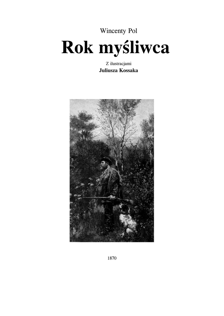 Wincenty Pol Rok myśliwca Z ilustracjami Juliusza Kossaka 1870 WSTĘP. Jednym z odcieniów życia naszego wiejskiego jest myśliwstwo. Zamiłowanie do niego jest tak starem jak dzieje ludzkie i stawało się niekiedy powołaniem dla całych epok i dla całych warstw społeczeństwa; ztąd też łączą się z życiem myśliwego tradycye, zwyczaje i obyczaje narodu, zostające w bezpośrednim związku z całym oddechem i życiem miejscowej natury. Przechowanie tych zwyczajów jest zadaniem Roku myśliwca; wszakże, gdy jej oderwanie odgłosów i widoków natury i od kolejnych zmian w przeciągu roku zrozumieć nie można, połączyłem tradycye myśliwego z Zegarem niebieskim, z Głosami i widokami natury, oznaczając jak w każdym miesiącu gwiazdy stoją, jakie głosy natury uderzają ucho, jakie widoki natury przesuwają się przed oczyma i jakie się w każdym miesiącu polowanie godzi: Stary to związek myśliwego z niebem. Myty greckie przedstawiają Dianę boginię łowów, z księżycem na nowiu nad czołem; pół-bogi i bohaterowie byli myśliwymi; łucznik z napiętym łukiem, jest panującym znakiem niebieskim w zwierzyńcu na czas łowów walnych, a już za czasów chrześciaństwa obrali sobie myśliwi św. Huberta za patrona łowów i jest wiele przysłów myśliwskich przywiązanych do świąt dorocznych: Włodarz czeka na trop ciepły, A łowca na skrzepły. Między matkami, jak się zajesieni, Najdzie Bartłomiej najprzód trop jeleni. Na Michała Łowcy chwała! Najważniejszem jednakowoż jest przysłowie o św. Hubercie, bo jest regułą w myśliwstwie: Quousque medio aevi sui stabit, Sanctus Hubertus dona sua dabit. coby w przekładzie tak oddać można: Św. Hubert tak długo będzie dary dawał, Pokąd będzie pośrodku pory łowów stawał. Jakoż, jeżeli się główne polowanie na ptactwo, mianowicie na podloty, poczyna w czerwcu, koło św. Jana, kończy się już polowanie wszelkie około św. Kaźmirza królewicza, a właściwie liczy sobie myśliwy 16 tygodni polowania przed św. Hubertem, a 16 po św. Hubercie, bo: Na św. Kazimierza Pokój dla łowcy i zwierza. To jest od św. Anny do św. Kaźmirza, kiedy czas królewskich łowów poczyna się w wigilią św. Michała, a kończy się w wigilią do Trzech króli. Ztąd jest także przysłowie: Sieć ostatnią trzej królowie Rozpinają po dąbrowie. Z przekąsem mówią o myśliwym, że: Zje wołu, a zabije ptaszka... pochodzi to ztąd, że się nie pilnujemy pory łowów. W krajach gdzie czas i sposób polowania jest opisany prawami i ściśle przestrzegany, zwierzyna stanowi jedne z ważniejszych rubryk dochodu i jest w pewnym czasie ważnym artykułem pożywienia miejscowej ludności, bo tańszą bywa od mięsa zwierząt domowych. Zapewne przyniesie czas i u nas tego rodzaju ulepszenia i może się stanie źródłem dochodu, co dziś marnotrawnie bez pożytku ginie. Uregulowanie myśliwstwa jest i warunkiem i skutkiem uregulowanej i prawnie określonej własności. Pisząc „Rok myśliwego”, chciałem zdać sobie i drugim sprawę z widoków i wrażeń natury, pośrodku której żyjemy i które, lubo przelotne, składają jednakowoż tło całego życia. Kto śród natury żyje, nie czuje tyle potrzeby zdawania sobie sprawy z jej głosów wymownych i z jej czarownych widoków; ale kto powołaniem swojem odciętym się widzi od żywego oddechu natury, dla tego staje się potrzebą wdrożenie się w tajemnice powszechnego żywota, aby zdołał pochwycić i ocenić głosy i widoki natury, zrozumieć je w sobie i dopełnić ten brak ciągłego związku z naturą, w chwili gdy się znajdzie śród wiejskiej ciszy, pod sklepieniem drzew cienistych, lub pod namiotem gwiaździstego nieba. ZEGAR NIEBIESKI DOROCZNY. Odkąd z niczego Bóg dźwignął zrąb świata, Płyną jednako i wieki i lata; Na gwiazdy patrzy w niebo ziemia stara I liczy doby wiecznego zegara Po znakach nieba i po gwiazd obrocie, I wielka sprawa w niebios kołowrocie Prowadzi wiernie, od wieka do wieka, Narody w dziejach, w pokoleniu człeka. Więc gdy Byk idzie na niebieską paszę, To w pola ciągną za nim trzody nasze; Więc kiedy Panna sierp podniesie siny, To chór żniwiarek pospiesza w caryny; A kiedy Strzelec łuk napnie gotowy, To się i w kniei poczynają łowy; A kiedy Wodnik panowanie trzyma, To leją deszcze, albo śnieży zima Tak pory roku, a i niebios czasy Dają świadectwo na pola i lasy, I w związku stoi każda ziemska sprawa Z świadectwem onem, co Bóg gwiazdą dawa. Więc żyj w świadectwie i świadectwo dawaj, I pod gwiazdami jak w swym domu stawaj, Znaj gwiaździstego nieba starą kartę I stróża-gwiazdę i stróża-anioła, Bo życie nasze o tyle tu warte, O ile z niebem człek je związać zdoła. STYCZEŃ. ZEGAR NIEBIESKI NA STYCZEŃ. O nowem lecie na styczniowem niebie Mrugają gwiazdy mrozem wyiskrzone, Gdy lodem ścięte wszystko w koło ciebie Jest jak na święto niebo wystrojone. Oczy aniołów — tak lud gwiazdy zowie, Patrzą czuwając i trzymają straże, I czy się zbłąkasz w stepie, czy w dąbrowie, To znana gwiazda drogę ci pokaże. Wysoko tedy, na południe nieco, Stoi Perseusz; obok niego świecą Węże Meduzy, a kędy się słania Szlak mlecznej drogi, Woźnica przegania; Prawie na grzbiecie jego Kózka siadła, I mleczna droga ku wschodowi spadła. Na południowy zachód dość wysoko Skrzydlaty Pegaz ponęci twe oko, I w tejże stronie odszukasz już tedy Koło Pegaza, głowę Andromedy. Na południowym wówczas już zapadzie Stoi Wieloryb, a od niego w prawo Nad głową jego, już się Baran kładzie; Byk na południu przyświeca jaskrawo; Na południku Kwoczka wówczas wodzi, Na małym wschodzie nizko Syrjusz wschodzi I zieje z paszczy Wielkiego Ogara. Po świetle jego, co jest najjaskrawsze, Na nocnem niebie odszukasz go zawsze. W prawo od niego, ale wyżej nieco, Tam kędy gwiazdy w Wielkim Mieczu świecą, Znajdzie się Orjon, pod nim Zając zwija, A na południu Gołąb się wybija