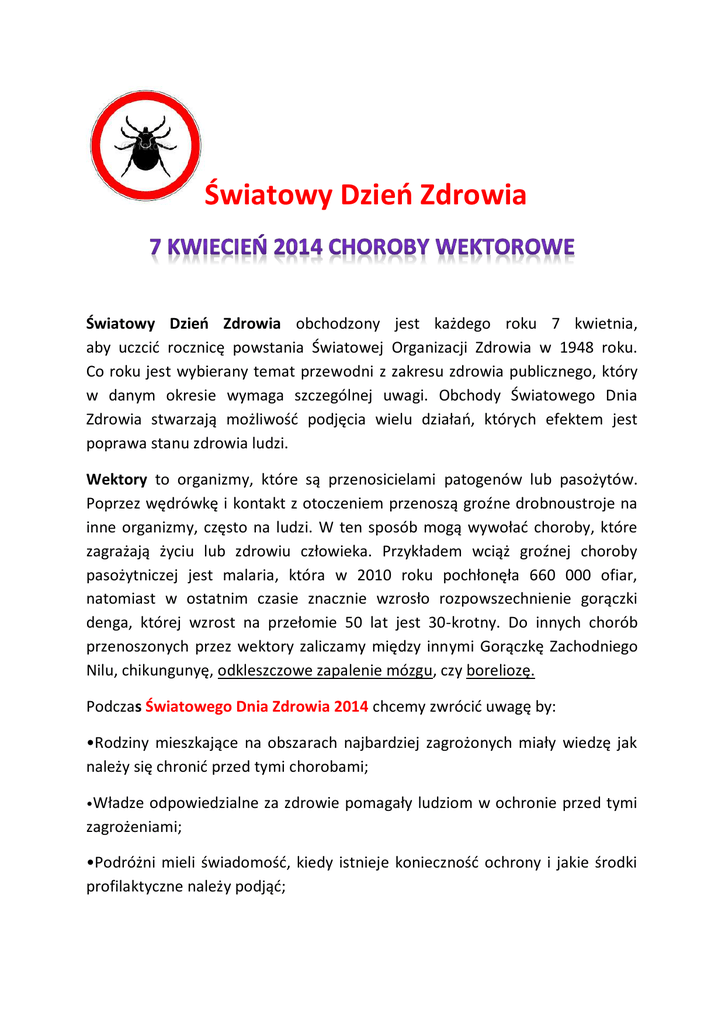 Światowy Dzień Zdrowia Światowy Dzień Zdrowia obchodzony jest każdego roku 7 kwietnia, aby uczcić rocznicę powstania Światowej Organizacji Zdrowia w 1948 roku. Co roku jest wybierany temat przewodni z zakresu zdrowia publicznego, który w danym okresie wymaga szczególnej uwagi. Obchody Światowego Dnia Zdrowia stwarzają możliwość podjęcia wielu działań, których efektem jest poprawa stanu zdrowia ludzi. Wektory to organizmy, które są przenosicielami patogenów lub pasożytów. Poprzez wędrówkę i kontakt z otoczeniem przenoszą groźne drobnoustroje na inne organizmy, często na ludzi. W ten sposób mogą wywołać choroby, które zagrażają życiu lub zdrowiu człowieka. Przykładem wciąż groźnej choroby pasożytniczej jest malaria, która w 2010 roku pochłonęła 660 000 ofiar, natomiast w ostatnim czasie znacznie wzrosło rozpowszechnienie gorączki denga, której wzrost na przełomie 50 lat jest 30-krotny. Do innych chorób przenoszonych przez wektory zaliczamy między innymi Gorączkę Zachodniego Nilu, chikungunyę, odkleszczowe zapalenie mózgu, czy boreliozę. Podczas Światowego Dnia Zdrowia 2014 chcemy zwrócić uwagę by: •Rodziny mieszkające na obszarach najbardziej zagrożonych miały wiedzę jak należy się chronić przed tymi chorobami; •Władze odpowiedzialne za zdrowie pomagały ludziom w ochronie przed tymi zagrożeniami; •Podróżni mieli świadomość, kiedy istnieje konieczność ochrony i jakie środki profilaktyczne należy podjąć; •Władze w krajach, w których choroby przenoszone przez wektory stają się problemem zdrowotnym, podjęły kroki w celu ochrony ludności przed nimi tymi chorobami. wirusowa choroba ośrodkowego układu nerwowego przenoszona przez kleszcze. Czynnikiem etiologicznym są wirusy z rodziny Flaviviridae. Do zakażenia dochodzi w wyniku ukłucia przez zakażonego kleszcza, rzadko drogą pokarmową poprzez spożycie surowego mleka zakażonego zwierzęcia. Rezerwuarem są małe gryzonie i kleszcze. Typowymi miejscami ukłucia u człowieka są głowa, uszy, miejsca zgięcia dużych stawów, ręce i nogi. Ponieważ ślina kleszczy posiada właściwości znieczulające, ukłucia na ogół nie zostaje zauważone i dlatego też bardzo często osoby z zachorowaniem na kleszczowe zapalenie mózgu nie przypominają sobie momentu ukłucia. Choroba przebiega dwufazowo. W fazie zwiastunowej występują objawy grypopodobne, nudności, wymioty, biegunka. Objawy utrzymują się do 7 dni, u większości chorych dochodzi do samoistnego wyleczenia na tym etapie. U części chorych po kilkudniowym okresie ustąpienia objawów rozwija się faza neuroinfekcji. Neuroinfekcja może występować pod postacią zapalenia opon mózgowo-rdzeniowych, zapalenia mózgu, zapalenia móżdżku lub zapalenia rdzenia kręgowego. U większości objawy ustępują całkowicie po 2-3 tygodniach. U chorych na zapalenie mózgu, rdzenia kręgowego możliwe utrzymywanie się przez kilka miesięcy zaburzeń czucia, niedowładów, upośledzenia pamięci. Śmiertelność około 1% Zapobieganie nosić odpowiednią odzież w lesie zakrywającą jak najwięcej części ciała, jak najszybciej usunąć kleszcza ze skóry, stosować środki odstraszające kleszcze, gotować mleko pochodzące od krów, kóz i owiec, unikać pobytu w rejonach zakażonych kleszczy, po wizycie w lesie dokładnie obejrzeć całe ciało. Jeżeli zauważysz ukąszenie, natychmiast delikatnie usuń kleszcza - uchwyć pęsetą za główkę i pociągnij. Miejsce ukłucia zdezynfekuj. Stosowanie wymienionych zasad zmniejsza prawdopodobieństwo ukąszenia i zakażenia. Jednak najpewniejszym sposobem zabezpieczenia się jest szczepienie ochronne. Szczepienia Szczepienia zaleca się osobom przebywającym na terenach endemicznych: zatrudnionym przy eksploatacji lasów, stacjonującemu w lasach wojsku, rolnikom, młodzieży, odbywającej praktyki oraz turystom, uczestnikom obozów i kolonii. Szczepienie przeciw kzm jest zalecane przez Ministerstwo Zdrowia. Dla zapewnienia odpowiedniego zabezpieczenia niezbędne jest uodpornienie podstawowe przez podanie szczepionki. Żeby szczepionka działała pewnie i długoczasowo, pobudza się układ obronny organizmu do tworzenia przeciwciał obronnych przez trzy etapowe szczepienie. Później podawane jest szczepienie przypominające. 1. Szczepienie podstawowe. Szczepienia ochronne przeciw kleszczowemu zapaleniu mózgu. I dawka 0,5 ml tak wcześnie, jak to możliwe najlepiej w zimnym okresie roku II dawka 0,5 ml 1–3 m-ce po pierwszym szczepieniu III dawka 0,5 ml 9–12 m-cy po drugim szczepieniu 2. Szczepienie przypominające. Co trzy lata jedno szczepienie przypominające. W ten sposób zostaje zapewnione właściwe zabezpieczenie. Na terenach zagrożonych powinno się szczepić dzieci już od pierwszego roku życia ponieważ przebywają dużo na powietrzu. Również kobiety ciężarne powinny się szczepić, ponieważ szczepienie chroni przyszłą matkę i dziecko. wieloukładowa choroba zakaźna wywoływana przez bakterie należące do krętków: Borrelia burgdorferi, Borrelia garinii, Borrelia afzelii, Borrelia japonica, jest najczęstszą chorobą odkleszczową. Zakażenie człowieka następuje poprzez ślinę lub wymiociny kleszcza. Wczesne objawy choroby obejmują powstanie charakterystycznego rumienia cechującego się obwodowym szerzeniem się i centralnym ustępowaniem. Rumień wędrujący jest najczęstszym objawem wczesnej postaci boreliozy. Inne wczesne zmiany to rzadko występujący naciek limfocytarny skóry oraz objawy grypopodobne obejmujące gorączkę, ból głowy, osłabienie. Wczesne objawy ustępują w ciągu 3 miesięcy i u części chorych rozwija się postać wczesna rozsiana, która może przebiegać pod postacią zapalenia stawów lub neuroboreliozy albo (rzadziej) zapalenia mięśnia sercowego. Po wielu latach od zakażenia u części chorych dochodzi do zanikowego zapalenia skóry, przewlekłego zapalenia stawów, powik