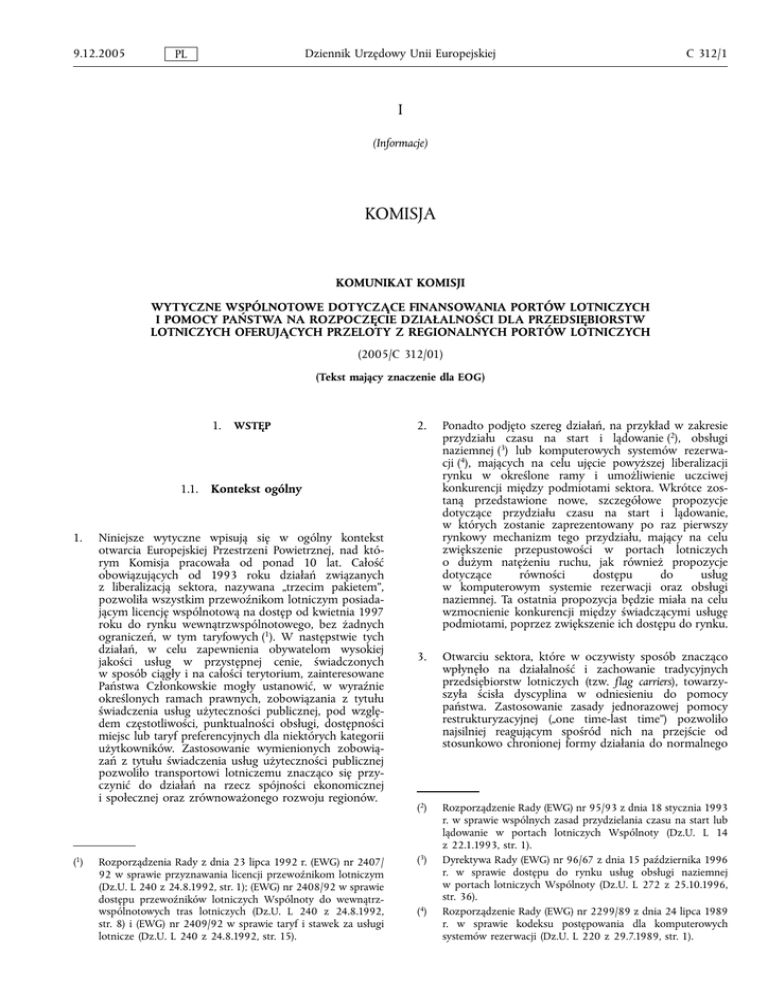 9.12.2005 Dziennik Urzędowy Unii Europejskiej PL C 312/1 I (Informacje) KOMISJA KOMUNIKAT KOMISJI WYTYCZNE WSPÓLNOTOWE DOTYCZĄCE FINANSOWANIA PORTÓW LOTNICZYCH I POMOCY PAŃSTWA NA ROZPOCZĘCIE DZIAŁALNOŚCI DLA PRZEDSIĘBIORSTW LOTNICZYCH OFERUJĄCYCH PRZELOTY Z REGIONALNYCH PORTÓW LOTNICZYCH (2005/C 312/01) (Tekst mający znaczenie dla EOG) 1. WSTĘP 2. Ponadto podjęto szereg działań, na przykład w zakresie przydziału czasu na start i lądowanie (2), obsługi naziemnej (3) lub komputerowych systemów rezerwacji (4), mających na celu ujęcie powyższej liberalizacji rynku w określone ramy i umożliwienie uczciwej konkurencji między podmiotami sektora. Wkrótce zostaną przedstawione nowe, szczegółowe propozycje dotyczące przydziału czasu na start i lądowanie, w których zostanie zaprezentowany po raz pierwszy rynkowy mechanizm tego przydziału, mający na celu zwiększenie przepustowości w portach lotniczych o dużym natężeniu ruchu, jak również propozycje dotyczące równości dostępu do usług w komputerowym systemie rezerwacji oraz obsługi naziemnej. Ta ostatnia propozycja będzie miała na celu wzmocnienie konkurencji między świadczącymi usługę podmiotami, poprzez zwiększenie ich dostępu do rynku. 3. Otwarciu sektora, które w oczywisty sposób znacząco wpłynęło na działalność i zachowanie tradycyjnych przedsiębiorstw lotniczych (tzw. flag carriers), towarzyszyła ścisła dyscyplina w odniesieniu do pomocy państwa. Zastosowanie zasady jednorazowej pomocy restrukturyzacyjnej („one time-last time”) pozwoliło najsilniej reagującym spośród nich na przejście od stosunkowo chronionej formy działania do normalnego (2) Rozporządzenie Rady (EWG) nr 95/93 z dnia 18 stycznia 1993 r. w sprawie wspólnych zasad przydzielania czasu na start lub lądowanie w portach lotniczych Wspólnoty (Dz.U. L 14 z 22.1.1993, str. 1). Dyrektywa Rady (EWG) nr 96/67 z dnia 15 października 1996 r. w sprawie dostępu do rynku usług obsługi naziemnej w portach lotniczych Wspólnoty (Dz.U. L 272 z 25.10.1996, str. 36). Rozporządzenie Rady (EWG) nr 2299/89 z dnia 24 lipca 1989 r. w sprawie kodeksu postępowania dla komputerowych systemów rezerwacji (Dz.U. L 220 z 29.7.1989, str. 1). 1.1. Kontekst ogólny 1. (1) Niniejsze wytyczne wpisują się w ogólny kontekst otwarcia Europejskiej Przestrzeni Powietrznej, nad którym Komisja pracowała od ponad 10 lat. Całość obowiązujących od 1993 roku działań związanych z liberalizacją sektora, nazywana „trzecim pakietem”, pozwoliła wszystkim przewoźnikom lotniczym posiadającym licencję wspólnotową na dostęp od kwietnia 1997 roku do rynku wewnątrzwspólnotowego, bez żadnych ograniczeń, w tym taryfowych (1). W następstwie tych działań, w celu zapewnienia obywatelom wysokiej jakości usług w przystępnej cenie, świadczonych w sposób ciągły i na całości terytorium, zainteresowane Państwa Członkowskie mogły ustanowić, w wyraźnie określonych ramach prawnych, zobowiązania z tytułu świadczenia usług użyteczności publicznej, pod względem częstotliwości, punktualności obsługi, dostępności miejsc lub taryf preferencyjnych dla niektórych kategorii użytkowników. Zastosowanie wymienionych zobowiązań z tytułu świadczenia usług użyteczności publicznej pozwoliło transportowi lotniczemu znacząco się przyczynić do działań na rzecz spójności ekonomicznej i społecznej oraz zrównoważonego rozwoju regionów. Rozporządzenia Rady z dnia 23 lipca 1992 r. (EWG) nr 2407/ 92 w sprawie przyznawania licencji przewoźnikom lotniczym (Dz.U. L 240 z 24.8.1992, str. 1); (EWG) nr 2408/92 w sprawie dostępu przewoźników lotniczych Wspólnoty do wewnątrzwspólnotowych tras lotniczych (Dz.U. L 240 z 24.8.1992, str. 8) i (EWG) nr 2409/92 w sprawie taryf i stawek za usługi lotnicze (Dz.U. L 240 z 24.8.1992, str. 15). (3) (4) C 312/2 PL Dziennik Urzędowy Unii Europejskiej realizowana przez siedem największych portów lotniczych, a 23 największe porty lotnicze realizują dwie trzecie tego ruchu (2). Mimo że pozostają one przede wszystkim dostawcami infrastruktury niezbędnej dla transportu lotniczego, przekształciły się również w podmioty handlowe o wysokiej rentowności. W przeciwieństwie do nich, większość małych portów lotniczych UE wciąż działa i jest użytkowana przez władze publiczne w zbiorowym interesie publicznym. W związku z powyższym wpływ działalności portu lotniczego na działalność innych portów lotniczych oraz na rynek w różnych Państwach Członkowskich może mieć różny wymiar w zależności od tego, do jakiej kategorii należy dany port lotniczy (zgodnie z podziałem przedstawionym w sekcji 1.2.1 poniżej). zachowania podmiotu gospodarczego. W związku z tym mogła nastąpić znacząca restrukturyzacja całego sektora lotniczego, restrukturyzacja, która wydawała się jeszcze bardziej konieczna po wydarzeniach z 11 września 2001 r., których skutki dla całości transportu lotniczego są nie do pominięcia. Konsolidacja ta odbywa się poprzez zawarte ostatnio alianse, np. Air France/Alitalia, Lufthansa/Austrian Airlines lub Iberia/British Airways, oraz niedawną koncentrację Air France i KLM. 4. 5. Wyroki Trybunału Sprawiedliwości nazywane „Open skies” (1) zdecydowanie ożywiły również sektor lotnictwa i potwierdziły, że Wspólnota posiada kompetencje w zakresie negocjacji międzynarodowych w dziedzinie lotnictwa cywilnego. Znaczenie tych wyroków jest bardzo duże, gdyż będą one sprzyjać zarówno konsolidacji między przedsiębiorstwami europejskimi, jak i ich zdolności do stawiania czoła konkurencji ze strony przedsiębiorstw lotniczych z krajów trzecich w oparciu o bazę wspólnotową. Na europejskim rynku transportu lotniczego mogły w związku z tym pojawić się dwie główne tendencje. Jedna z nich to powstanie kilku nowych przedsiębiorstw o zasięgu wspólnotowym, dysponujących zachęcającą ofertą taryfo
