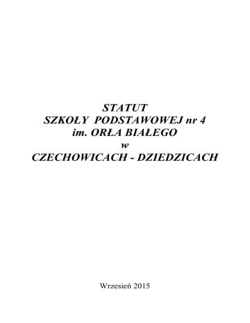 STATUT SZKOŁY PODSTAWOWEJ nr 4 im. ORŁA BIAŁEGO w CZECHOWICACH - DZIEDZICACH Wrzesień 2015 DZIAŁ I Postanowienia ogólne Rozdział 1 Nazwa szkoły i inne informacje o szkole §1 1. Pełna nazwa szkoły brzmi : Szkoła Podstawowa nr 4 im. Orła Białego w Czechowicach-Dziedzicach. 2. Siedzibą szkoły jest budynek w Czechowicach-Dziedzicach przy ul. Studenckiej 2. 3. Szkoła Podstawowa nr 4 im. Orła Białego jest szkołą środowiskową zaspakajającą potrzeby mieszkańców. Jej obwód został ustalony przez Radę Miejską w Czechowicach-Dziedzicach Uchwałą nr VIII/48/99 z dnia 9 marca 1999 roku. 4. Szkoła Podstawowa nr 4 im. Orła Białego jest szkołą publiczną. Nauka w niej – w zakresie ramowych planów nauczania – jest bezpłatna. Odpłatność może dotyczyć tylko nauki poza ramowymi planami nauczania, na którą organ prowadzący Szkołę nie zabezpiecza stosownych środków. Odpłatność ta musi uzyskać akceptację rodziców uczniów. 5. Organem prowadzącym Szkołę jest Burmistrz Czechowic-Dziedzic. 6. Nadzór Pedagogiczny nad Szkołą sprawuje Śląski Kurator Oświaty. 7. Czas trwania cyklu kształcenia, zgodnie z rozporządzeniem w sprawie ramowych planów nauczania, trwa 6 lat: 1) Etap I – klasy I-III – edukacja wczesnoszkolna; 2) Etap II – klasy IV-VI. 8. W Szkole prowadzi się bibliotekę, świetlicę oraz stołówkę szkolną. 9. W Szkole Podstawowej nr 4 im. Orła Białego korzysta się z dziennika elektronicznego, do którego dostęp jest bezpłatny. Rozdział 2 Przepisy definiujące §2 1. Ilekroć w dalszych przepisach jest mowa bez bliższego określenia o: 1) Szkole – należy przez to rozumieć Szkołę Podstawową nr 4 im. Orła Białego w Czechowicach-Dziedzicach; 2) Ustawie – należy przez to rozumieć Ustawę z dnia 7 września 1991 roku o systemie oświaty (Dz. U. z 2004 roku: Nr 256. poz. 2572 z późniejszymi zmianami); 3) Statucie - należy rozumieć Statut Szkoły; 4) Dyrektorze, Radzie Pedagogicznej, organach Samorządu Uczniowskiego, Radzie Rodziców – należy przez to rozumieć organy działające w szkole; 5) Uczniach i rodzicach – należy przez to rozumieć uczniów szkoły oraz ich rodziców lub prawnych opiekunów; 6) Wychowawcy – należy przez to rozumieć nauczyciela, którego szczególnej opiece wychowawczej powierzamy jeden z oddziałów szkoły; 7) Podstawie programowej wychowania przedszkolnego lub podstawie programowej kształcenia ogólnego – należy przez to rozumieć obowiązkowe, na danym etapie kształcenia, zestawy celów i treści nauczania oraz umiejętności, a także zadania wychowawcze szkoły, które są uwzględniane odpowiednio w programach wychowania przedszkolnego i programach nauczania oraz umożliwiają ustalenie kryteriów ocen szkolnych i wymagań egzaminacyjnych; 8) Niepełnosprawnościach sprzężonych – należy przez to rozumieć występowanie u dziecka niesłyszącego lub słabo słyszącego, niewidomego lub słabo widzącego, z niepełnosprawnością ruchową, z niepełnosprawnością umysłową albo autyzmem co najmniej jeszcze jednej z wymienionych niepełnosprawności. Rozdział 3 Cele i zadania szkoły §3 1. Szkoła realizuje cele i zadania określone w Ustawie o systemie oświaty z dnia 7 września 1991 r. (Dz. U. z 2004 r. Nr 256, poz. 2572 z późniejszymi zmianami) zwanej dalej ustawą oraz przepisach wydanych na jej podstawie. 1a. Szkoła podejmuje niezbędne działania w celu tworzenia optymalnych warunków realizacji działalności dydaktycznej, wychowawczej i opiekuńczej oraz innej działalności statutowej, zapewnienia każdemu uczniowi warunki niezbędne do jego rozwoju, podnoszenia jakości pracy szkoły i jej rozwoju organizacyjnego. 1b. Działania, o których mowa w ust. 1a, dotyczą: 1) efektów w zakresie kształcenia, wychowania i opieki oraz realizacji celów i zadań statutowych; 2) organizacji procesów kształcenia, wychowania i opieki; 3) tworzenia warunków do rozwoju i aktywności uczniów; 4) współpracy z rodzicami i środowiskiem lokalnym; 5) zarządzania. 1c. Szkoła zapewnia realizację kierunków polityki państwa na poziomie świadczącym o prawidłowym przebiegu procesów kształcenia, wychowania i opieki, umożliwieniu każdemu uczniowi rozwoju na miarę jego indywidualnych możliwości, podejmowaniu przez szkołę działań podnoszących jakość pracy, angażowaniu uczniów, rodziców i nauczycieli w działania szkoły lub placówki, a także współpracy ze środowiskiem lokalnym; 2. Szkoła prowadzi działalność dydaktyczną, wychowawczą, opiekuńczą i profilaktyczną respektując chrześcijański system wartości. 3. Szkoła w szczególności: 1) zapewnia realizację podstawy programowej poprzez odpowiedni dobór programów nauczania; 2) umożliwia zdobycie wiedzy i umiejętności niezbędnych do ukończenia szkoły podstawowej oraz do napisania sprawdzianu końcowego; 3) stwarza warunki do wszechstronnego rozwoju uczniów, uwzględniając ich indywidualne zainteresowania i potrzeby, organizuje koła zainteresowań, w miarę uzyskanych na ten cel środków przydzielonych przez organ prowadzący szkołę; 4) zapewnia uczniom i rodzicom pomoc psychologiczną i pedagogiczną poprzez zatrudnienie w szkole pedagoga oraz współpracę z wyspecjalizowanymi w tym zakresie jednostkami; 5) umożliwia uczniom podtrzymanie poczucia tożsamości narodowej, etnicznej i religijnej; 6) zapewnia podtrzymanie kultury i tradycji regionalnej; 7) uznając prawo rodziców do religijnego wychowania dzieci szkoła organizuje na życzenie rodziców naukę religii; 8) na prośbę rodziców szkoła organizuje naukę etyki na zasadach określonych odrębnymi przepisami; 9) organizuje, zgodnie z potrzebami i posiadanymi środkami finansowymi, zajęcia nauczania indywidualnego, indywidualny tok lub program nauki na zasadach określonych odrębnymi przepisami; 10) organizuje zajęcia dydaktyczno-wyrównawcze, korekcyjno-kompensacyjne, gimnastyki korekcyjno-kompensa