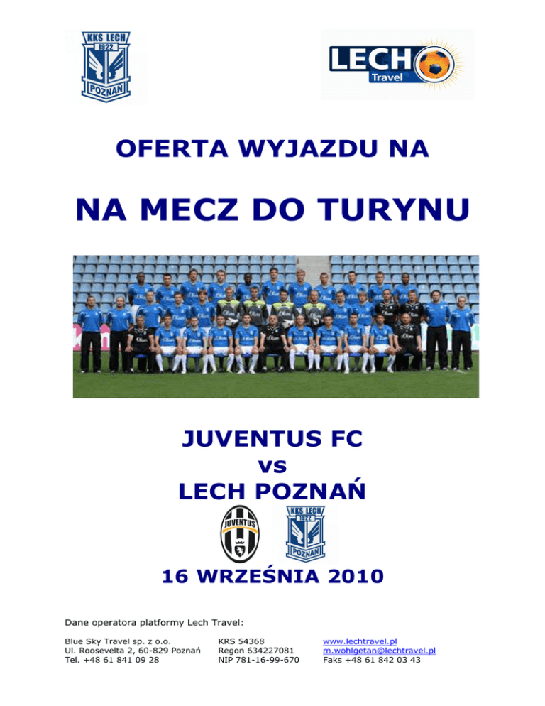 OFERTA WYJAZDU NA NA MECZ DO TURYNU JUVENTUS FC vs LECH POZNAŃ 16 WRZEŚNIA 2010 Dane operatora platformy Lech Travel: Blue Sky Travel sp. z o.o. Ul. Roosevelta 2, 60-829 Poznań Tel. +48 61 841 09 28 KRS 54368 Regon 634227081 NIP 781-16-99-670 www.lechtravel.pl [email protected] Faks +48 61 842 03 43 PROPONOWANY PROGRAM Dzień pierwszy, 15 września (środa) 15:00 Spotkanie uczestników wyjazdu przy stadionie Lecha w Poznaniu (od ul. Ptasiej) Wyjazd z Poznania do Włoch Dzień drugi, 16 września (czwartek) Przyjazd do Turynu w godzinach okołopołudniowych Zakwaterowanie w Best Western Hotel City**** w Turynie w pokojach dwuosobowych Czas wolny na odpoczynek Przejście na stadion 19:00 Mecz Juventus FC – Lech Poznań Powrót do hotelu Nocleg Dzień trzeci, 17 września (piątek) Śniadanie w hotelu Wykwaterowanie z hotelu Około 12:00 Wyjazd z Włoch do Polski Dzień czwarty, 18 września (sobota) Powrót do Poznania w godzinach porannych PROPONOWANY HOTEL Best Western Hotel City****, Turyn Via Filippo Juvarra 25, San Donato - Vittoria, 10122 Torino Hotel City posiada lokalizację w centrum Turynu w pobliŜu metra i 200 metrów od dworca kolejowego Porta Susa. Hotel znajduje się blisko Via Garibaldi, jednej z najbardziej znanych ulic handlowych Turynu. Hotel posiada 3 nowoczesne i w pełni wyposaŜone sale konferencyjne, bar, lobby, całodobową recepcję, pokoje dla niepalących, pokoje /udogodnienia dla niepełnosprawnych, windę, sejf, ogrzewanie, przechowalnię bagaŜu, pokoje dla alergików, klimatyzację, zaplecze bankietowe, centrum biznesowe, usługi pralni, faks/ksero. Hotel posiada jasne, wygodne pokoje w róŜnych standardach, niektóre posiadają balkony wychodzące na cichy ogród hotelowy. Hotel serwuje śniadanie w formie bufetu od 07:00 do 10:00. Liczba pokoi: 61. Sieć hotelowa: Best Western. CENA Orientacyjna cena z noclegiem w pokoju dwuosobowym wynosi około 765PLN /osoba (Faktura VAT MarŜa) (biorąc pod uwagę 40 uczestników) Cena zawiera: - przejazd autokarem na trasie Poznań- Turyn – Poznań - bilet na mecz - nocleg w pokoju dwuosobowym - śniadanie w hotelu - ubezpieczenie - opiekę pilota Cena - nie zawiera: posiłków (oprócz śniadania w hotelu) wydatków osobistych uczestników wyjazdu świadczeń wyŜej niewymienionych Uprzejmie informuję, iŜ powyŜsza oferta jest wstępną propozycją nie popartą jeszcze rezerwacjami. Proszę o zwrócenie uwagi, iŜ kalkulacja została oparta na podstawie uczestnictwa 40 osób. W przypadku zmiany liczby uczestników cena będzie kalkulowana ponownie. Oferta jest aktualna do dnia 13.09.2010. Wszystkie rezerwacje zostaną załoŜone po złoŜeniu zamówienia. W przypadku zainteresowania naszą propozycją uprzejmie proszę o informację. Wówczas przygotuję dla Państwa szczegółową ofertę z uwzględnieniem wybranych świadczeń i opcji, opartą juŜ na konkretnych rezerwacjach. Po załoŜeniu rezerwacji przygotuję takŜe finalną kalkulację. Zgłoszenia przyjmowane będą na podstawie kolejności zgłoszeń. Tel.: 061/ 8410 920 E-mail: [email protected] Wyciąg z zasad wyjazdowych Kibiców: - Kibice jeŜdŜą w barwach Lecha (koszulka, szal, ewentualnie czapeczka; bez obwieszania się wieloma szalami) - Kibice nie jeŜdŜą w innych barwach, czarnych koszulkach, koszulkach klubów zagranicznych, barw reprezentacji; na wyjazdach zagranicznych - Ŝadnych barw klubów zgodowych - Ŝadnych pomalowanych twarzy, dziwnych nakryć głowy, trąbek, klekotek itd. - zakaz picia w nadmiernych ilościach, - Ŝadnego zaczepiania miejscowych, - zakaz kręcenia filmików i robienia zdjęć z sektora - zakaz wymiany barwami z kibicami przeciwnymi - Ŝadnych okazjonalnych szali łączonych - podczas podróŜy autem Ŝadnych flag, szali, koszulek itp. w oknach - na meczu wszyscy śpiewają - szanujemy środki transportu - Ŝadnego wandalizmu - Ŝadnych kradzieŜy - bratanie się z słuŜbami mundurowymi i ochroną jest niemile widziane(od pogaduszek po robienie zdjęć)