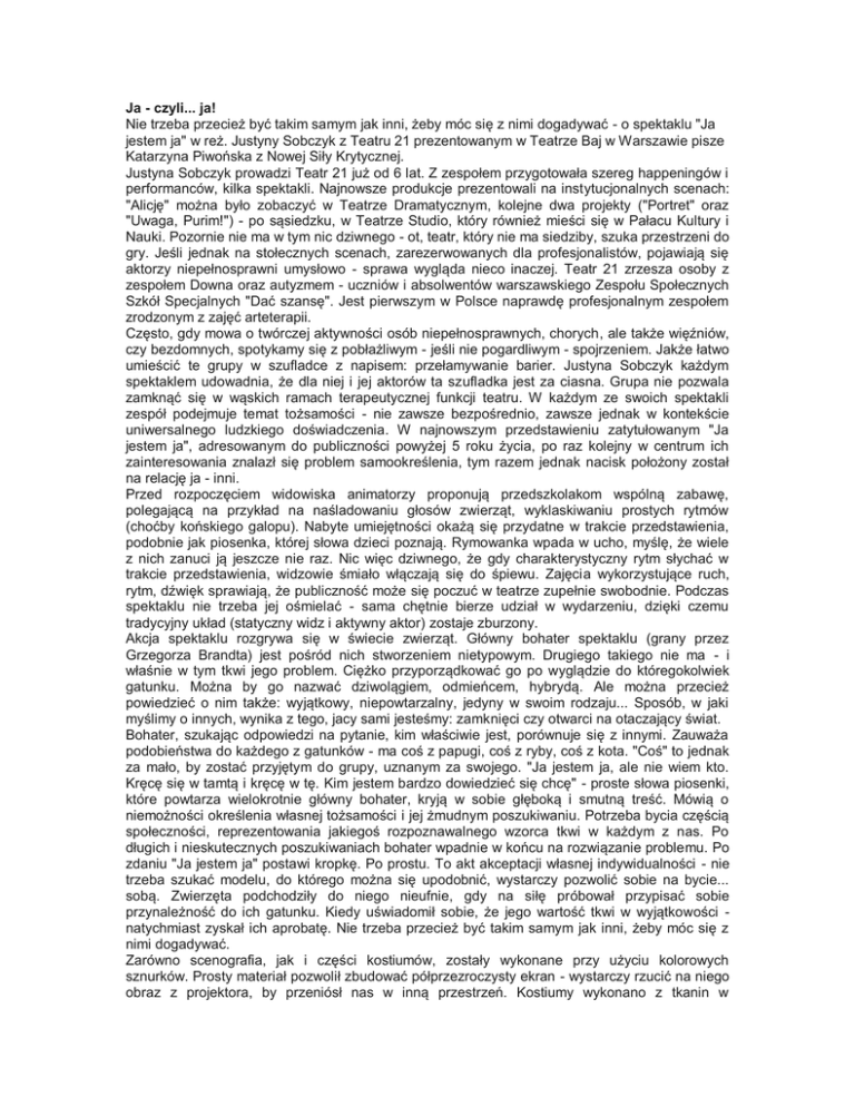 jestem ja" w reż. Justyny Sobczyk z Teatru 21 prezentowanym w Teatrze Baj w Warszawie pisze