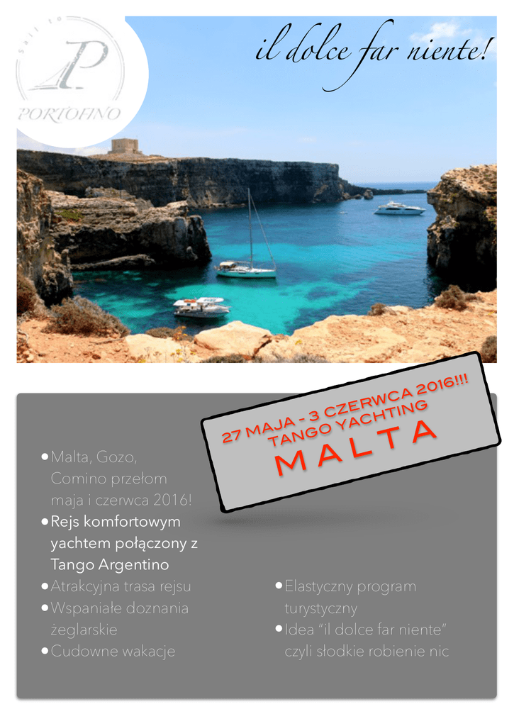 il dolce far niente! • Malta, Gozo, Comino przełom maja i czerwca 2016! • Rejs komfortowym yachtem połączony z Tango Argentino • Atrakcyjna trasa rejsu • Wspaniałe doznania żeglarskie • Cudowne wakacje !!! 016 2 CA W R ZE ING C T 3 H C AJA GO YA M 27 TAN MA A T L • Elastyczny program turystyczny • Idea “il dolce far niente” czyli słodkie robienie nic Leszek & Magdalena zapraszają na TangoYachting Malta, Valetta, 27 maja - 3 czerwca 2016 Oferujemy w cenie • Wakacyjny rejs luksusowym yachtem we wspaniałej atmosferze • Opiekę Skippera • Dla chętnych, podczas rejsu 3 dni po 2h praktyki Tango Argentino przy restauracjach portowych, w lagunach lub na plaży • W zależności od pogody oraz chęci uczestników możliwa dodatkowa praktyka taneczna • Wspaniałe doznania żeglarskie, interesujący plan rejsu, kąpiele w morzu, być może z delfinami, pogodna atmosfera, wakacyjny relaks, popołudniowe/wieczorne przybijanie do marin lub na kotwicowiska w zatokach urokliwych wysp • Kameralne grono - Magda i Leszek oraz 6 Uczestników, co gwarantuje swobodę i komfort podczas rejsu oraz przy doskonaleniu Tango Zapewniamy w cenie • Zakwaterowanie na wygodnym yachcie 8 osobowym w kajutach 2 osobowych • Wyżywienie na yachcie - zdrowe, wegetariańskie posiłki, które załoga wspólnie przygotowuje na yachcie wg planu dnia z poczynionych wspólnie zakupów spożywczych z części pieniędzy zawartych w cenie za rejs • Opłaty portowe, paliwo i wodę do yachtu • Pościel na yachcie, sprzątanie końcowe • Ubezpieczenie OC • Bezpieczne i luksusowe warunki wakacyjnego relaksu na yachcie - doświadczenie żeglarskie nie jest konieczne • Żadnych innych ukrytych kosztów Opis yachtu: • Bavaria 45C, Syn Odyssey 439 lub podobny • Ilość kajut: 4+kuchnia w pełni wyposażona • Ilość toalet i pryszniców: 2 lub 3 zależne od yachtu Wstępny plan rejsu: • Wyspa Malta • Wyspa Comino • Wyspa Gozo We własnym zakresie: • Dojazd do lotniska do Poznania lub Warszawy - ustalimy skąd będzie wylot. • Przejazd Taxi z lotniska na Malcie do mariny max 10 Eur/os • Dodatkowe wizyty w restauracjach (jeśli wystąpią) • Alkohol • Bilet lotniczy - pomagamy z zakupie - cena na dzień 22.01.2016 Poznań-Malta-Poznań liniami Ryanair: 600 PLN/os z bagażem 20kg Cena za pakiet: • 2 360,00 PLN/osobę - miejsce na yachcie w kajucie dwuosobowej • 120,00 PLN/osobę/dzień - składka na wyżywienie, paliwo, wodę, prąd, opłaty portowe, pościel • Łącznie: 3 200,00 PLN/osobę (+ koszt biletów lotniczych) • Cena zawiera wakacyjny pakiet żeglarstwa, wyżywienia, wypoczynku i doskonalenia Tango, jak przedstawiono powyżej Zgłoszenia: • ILOŚĆ MIEJSC OGRANICZONA do 6 osób + Magdalena i Leszek! • DECYDUJE KOLEJNOŚĆ ZGŁOSZEŃ ORAZ WPŁATA ZALICZKI WYSOKOŚCI: 1 600,00 PLN, która stanowi bezzwrotną kwotę rezerwacji yachtu. Nr konta poniżej. • Kolejna płatność: 1 600,00 PLN/osoby do 15 kwietnia 2016r. • Kontakt: Leszek Siennicki: T: 609 066 707, [email protected] SERDECZNIE ZAPRASZAMY :) WAŻNE INFORMACJE • W przypadku braku kompletu załogi organizator zastrzega sobie możliwość odwołania rejsu. W takim przypadku całość wpłat za rejs zostanie zwrócona. Jako ostateczny termin zgłoszenia ustala się 31 marca 2016. • Odwołanie rejsu nastąpić może z przyczyn niezależnych od organizatora, przy braku kompletu załogi lub braku dostępności jachtu do czarteru. • Wartość oferty nie obejmuje ceny za bilet lotniczy. Bilety należy zakupić samodzielnie JEDNAKŻE DOPIERO po informacji organizatora o skompletowaniu całej załogi, co stanowi warunek odbycia się rejsu. • W chwili skompletowania załogi przesłana zostanie informacja do uczestników o możliwości zakupu biletów lotniczych. W tym samym momencie wyczarterowany zostanie jacht na rejs z katalogu aktualnie dostępnych ofert armatorów. • Podczas rejsu wszyscy uczestnicy stanowią załogę stąd biorą udział przy organizacji posiłków na yachcie czy też prostych czynnościach podczas żeglugi pod okiem kapitana, co stanowi bardzo przyjemny proces integracji grupy. • Wpłatę zaliczki rezerwującej udział w rejsie należy dokonać na konto bankowe: Leszek Siennicki BZ WBK S.A. nr konta: 07 1090 1463 0000 0000 4610 1289. Tytuł wpłaty: Imię i nazwisko TangoYachting Malta 2016 • Jako organizatorzy kolejnej już wyprawy dokładamy wszelkich starań by… WASZE WAKACJE BYŁY OBŁĘDNIE CUDOWNYM PRZEŻYCIEM :-) Leszek & Magdalena