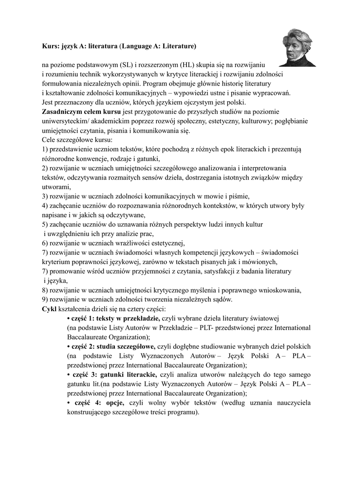 Kurs: język A: literatura (Language A: Literature) na poziome podstawowym (SL) i rozszerzonym (HL) skupia się na rozwijaniu i rozumieniu technik wykorzystywanych w krytyce literackiej i rozwijaniu zdolności formułowania niezależnych opinii. Program obejmuje głównie historię literatury i kształtowanie zdolności komunikacyjnych – wypowiedzi ustne i pisanie wypracowań. Jest przeznaczony dla uczniów, których językiem ojczystym jest polski. Zasadniczym celem kursu jest przygotowanie do przyszłych studiów na poziomie uniwersyteckim/ akademickim poprzez rozwój społeczny, estetyczny, kulturowy; pogłębianie umiejętności czytania, pisania i komunikowania się. Cele szczegółowe kursu: 1) przedstawienie uczniom tekstów, które pochodzą z różnych epok literackich i prezentują różnorodne konwencje, rodzaje i gatunki, 2) rozwijanie w uczniach umiejętności szczegółowego analizowania i interpretowania tekstów, odczytywania rozmaitych sensów dzieła, dostrzegania istotnych związków między utworami, 3) rozwijanie w uczniach zdolności komunikacyjnych w mowie i piśmie, 4) zachęcanie uczniów do rozpoznawania różnorodnych kontekstów, w których utwory były napisane i w jakich są odczytywane, 5) zachęcanie uczniów do uznawania różnych perspektyw ludzi innych kultur i uwzględnieniu ich przy analizie prac, 6) rozwijanie w uczniach wrażliwości estetycznej, 7) rozwijanie w uczniach świadomości własnych kompetencji językowych – świadomości kryterium poprawności językowej, zarówno w tekstach pisanych jak i mówionych, 7) promowanie wśród uczniów przyjemności z czytania, satysfakcji z badania literatury i języka, 8) rozwijanie w uczniach umiejętności krytycznego myślenia i poprawnego wnioskowania, 9) rozwijanie w uczniach zdolności tworzenia niezależnych sądów. Cykl kształcenia dzieli się na cztery części: • część 1: teksty w przekładzie, czyli wybrane dzieła literatury światowej (na podstawie Listy Autorów w Przekładzie – PLT- przedstwionej przez International Baccalaureate Organization); • część 2: studia szczegółowe, czyli dogłębne studiowanie wybranych dzieł polskich (na podstawie Listy Wyznaczonych Autorów – Język Polski A – PLA – przedstwionej przez International Baccalaureate Organization); • część 3: gatunki literackie, czyli analiza utworów należących do tego samego gatunku lit.(na podstawie Listy Wyznaczonych Autorów – Język Polski A – PLA – przedstwionej przez International Baccalaureate Organization); • część 4: opcje, czyli wolny wybór tekstów (według uznania nauczyciela konstruującego szczegółowe treści programu). Różnice pomiędzy poszczególnymi poziomami dotyczą ilości godzin przeznaczonych na dany poziom (SL – 150, HL – 240 w czasie 2 lat, czyli na SL – 4 godziny lekcyjne w tygodniu, na HL – 6 godzin/tydzień) oraz czytanych i omawianych na lekcjach prac: Część kursu 1. 2. 3. 4. Poziom podstawowy 2 prace 2 prace 3 prace 3 prace Poziom rozszerzony 3 prace 3 prace 4 prace 3 prace Pod pojęciem praca kryje się 1 większy tekst literacki (powieść, autobiografia lub biografia) lub kilka utworów, które odpowiadają obszerniejszemu utworowi ( np. 2 lub więcej nowel, 5-10 opowiadań, 5-8 esejów, kilka wierszy lub 1 długi – minimum 600 wersów). Przedmiot: Language A: Literature SL Poziom: podstawowy Tematyka zajęć: Teksty kultury: Przykładowe treści: Część 1: Wybrane dzieła literatury światowej. J. Conrad: Jądro ciemności. - Joseph Conrad w lekturze nowoczesnej i ponowoczesnej; recepcja twórczości w kulturze polskiej i anglosaskiej; - Problem unde malum i conradowski kodeks etyczny; - Europejczyk wobec mieszkańców Afryki, cywilizacja a natura. A. Camus: Dżuma. - Egzystencjalny heroizm bohaterów Dżumy Alberta Camusa; - Człowiek cierpiący wobec Boga; - Dżuma jako parabola; – Zagrożenia współczesności: Bakcyl dżumy nigdy nie umiera… Część 2: Dogłębne studiowanie wybranych dzieł. A. Mickiewicz: Dziady cz. III. - Bohaterowie III cz. Dziadów, kontekst historyczny i biograficzny; - Historiozofia romantyczna w wizji mesjanistycznej, funkcja nawiązań biblijnych; - Kreacjonizm i prometeizm, koncepcja Boga; - Obraz carskiej Rosji; - Arcydramat narodowy. B. Schulz: wybór opowiadań: Sklepy cynamonowe, Traktat o manekinach, Sierpień, Ulica Krokodyli. - Łamanie konwencji prawdopodobieństwa epickiego; - Człowiek w świecie symboli; - Analiza porównawcza filmu i opowiadania, język filmu a język literatury; - Świat Schulza w kontekstach: biograficznym, filozoficznym, literackim, obyczajowym. Kontekst: Ulica Krokodyli – film animowany, reżyseria: Stephen Quay. Część 3: Rodzaje i gatunki literackie. A. Fredro: Śluby panieńskie. - Komedia intrygi i charakteru; - Uniwersalizm i konwencje literackie; - Śluby panieńskie- komedia romantyczna czy antyromantyczna? S. Wyspiański: Wesele. - Geneza Wesela, pierwowzory bohaterów, zjawisko chłopomanii; - Portret inteligenta i chłopa; Ocenianie zewnętrzne: Składniki oceniania Arkusz egzaminacyjny nr 1 20 pkt. Ocenianie na poziomie SL LITERACKA ANALIZA Z UWZGLĘDNIENIEM PYTAŃ POMOCNICZYCH (20%) Arkusz zawiera dwa nieznane dla uczniów fragmenty tekstu. Uczniowie piszą ukierunkowaną literacką analizę w oparciu o fragment prozy lub wiersza z uwzględnieniem w swojej pracy pytań naprowadzających. (20 pkt.) Czas 90 min. Arkusz egzaminacyjny nr 2 ESEJ (25 %) Arkusz zawiera trzy tematy odnoszące się do każdego gatunku literackiego. Uczniowie wybierają jeden i piszą esej oparty na co najmniej dwóch pracach omawianych w części trzeciej kursu. (25 pkt.) (25%) Uczniowie na podstawie jednej lektury studiowanej w pierwszej części kursu piszą pracę, w której wyrażają własne sądy i opinie (300 – 400 słów) oraz esej (1200 – 1500 słów). (25 pkt.) 90 min. Zadanie pisemne Redagowane pod nadzorem nauczyciela w trakcie trwania zajęć z przedmiotu. Oc