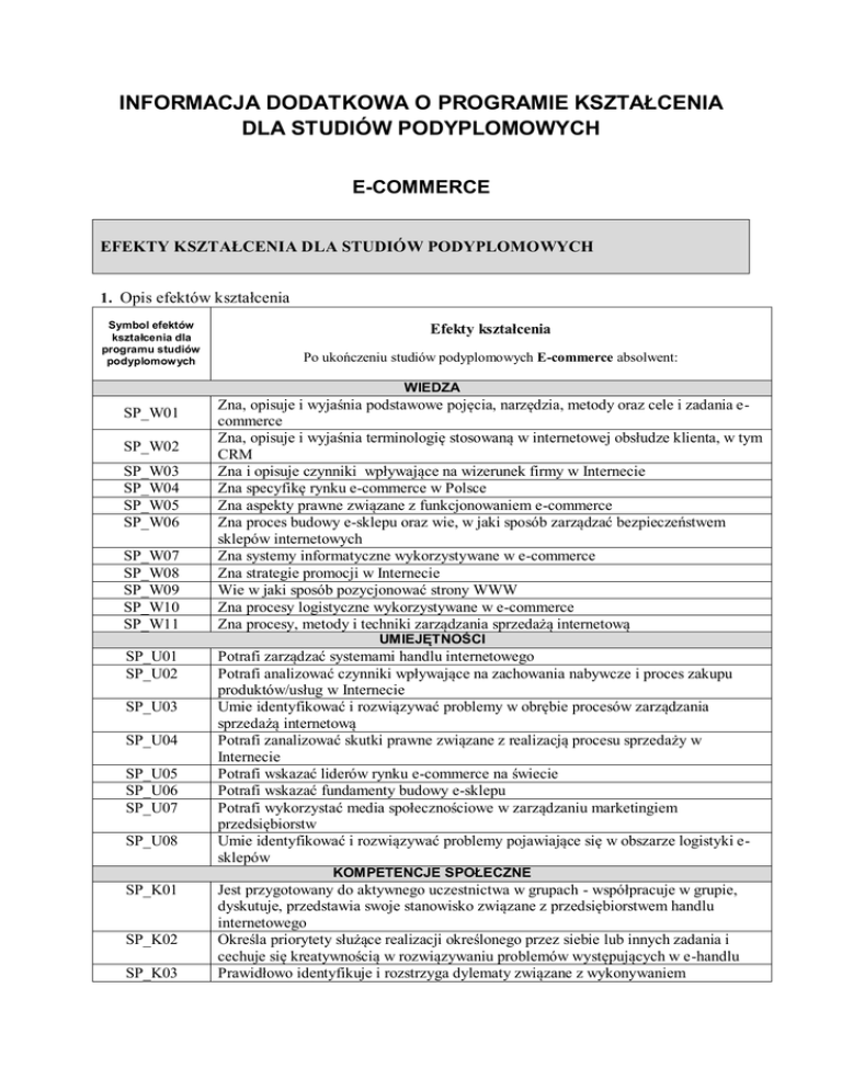 INFORMACJA DODATKOWA O PROGRAMIE KSZTAŁCENIA DLA STUDIÓW PODYPLOMOWYCH E-COMMERCE EFEKTY KSZTAŁCENIA DLA STUDIÓW PODYPLOMOWYCH 1. Opis efektów kształcenia Symbol efektów kształcenia dla programu studiów podyplomowych Efekty kształcenia Po ukończeniu studiów podyplomowych E-commerce absolwent: WIEDZA SP_W01 SP_W02 SP_W03 SP_W04 SP_W05 SP_W06 SP_W07 SP_W08 SP_W09 SP_W10 SP_W11 Zna, opisuje i wyjaśnia podstawowe pojęcia, narzędzia, metody oraz cele i zadania ecommerce Zna, opisuje i wyjaśnia terminologię stosowaną w internetowej obsłudze klienta, w tym CRM Zna i opisuje czynniki wpływające na wizerunek firmy w Internecie Zna specyfikę rynku e-commerce w Polsce Zna aspekty prawne związane z funkcjonowaniem e-commerce Zna proces budowy e-sklepu oraz wie, w jaki sposób zarządzać bezpieczeństwem sklepów internetowych Zna systemy informatyczne wykorzystywane w e-commerce Zna strategie promocji w Internecie Wie w jaki sposób pozycjonować strony WWW Zna procesy logistyczne wykorzystywane w e-commerce Zna procesy, metody i techniki zarządzania sprzedażą internetową UMIEJĘTNOŚCI SP_U01 SP_U02 SP_U03 SP_U04 SP_U05 SP_U06 SP_U07 SP_U08 Potrafi zarządzać systemami handlu internetowego Potrafi analizować czynniki wpływające na zachowania nabywcze i proces zakupu produktów/usług w Internecie Umie identyfikować i rozwiązywać problemy w obrębie procesów zarządzania sprzedażą internetową Potrafi zanalizować skutki prawne związane z realizacją procesu sprzedaży w Internecie Potrafi wskazać liderów rynku e-commerce na świecie Potrafi wskazać fundamenty budowy e-sklepu Potrafi wykorzystać media społecznościowe w zarządzaniu marketingiem przedsiębiorstw Umie identyfikować i rozwiązywać problemy pojawiające się w obszarze logistyki esklepów KOMPETENCJE SPOŁECZNE SP_K01 SP_K02 SP_K03 Jest przygotowany do aktywnego uczestnictwa w grupach - współpracuje w grupie, dyskutuje, przedstawia swoje stanowisko związane z przedsiębiorstwem handlu internetowego Określa priorytety służące realizacji określonego przez siebie lub innych zadania i cechuje się kreatywnością w rozwiązywaniu problemów występujących w e-handlu Prawidłowo identyfikuje i rozstrzyga dylematy związane z wykonywaniem działalności e-commerce OBJAŚNIENIA Symbole oznaczają: na pierwszym miejscu umieszczony jest efekt kształcenia danych studiów podyplomowych (SP) na drugim miejscu podkreślnik (_) na trzecim miejscu, po podkreślniku, kategoria wiedzy (W), umiejętności (U) lub kompetencji społecznych (K) na czwartym i piątym miejscu nr efektu kształcenia PROGRAM STUDIÓW PODYPLOMOWYCH Zatwierdzony Uchwałą Rady Wydziału Zarządzania i Ekonomiki Usług nr 11e/2/20/2014/2015 z dnia 16 kwietnia 2015 r. obowiązuje w roku akademickim 2015/2016 6 Nazwa studiów podyplomowych Numer edycji Czas trwania studiów (liczba semestrów) Łączny wymiar godzin Łączna liczba punktów ECTS konieczna do uzyskania kwalifikacji Forma zakończenia studiów 7 8 Plan studiów Matryca efektów kształcenia 9 Tabela efektów kierunkowych w odniesieniu do metod ich weryfikacji Sylabusy 1 2 3 4 5 8 9 10 11 E-commerce 1 2 200 60 Zaliczenie pisemne treści prezentowanych na zajęciach. Studia kończą się uzyskaniem pozytywnych ocen z zaliczeń w planie studiów oraz wydaniem świadectwa ukończenia studiów podyplomowych. załącznik nr 1 załącznik nr 2 załącznik nr 3 załącznik nr 4 (zgodnie z Zarządzeniem nr 4/2012 Rektora Uniwersytetu Szczecińskiego z dnia 20 stycznia 2012 roku w sprawie wprowadzenia w Uniwersytecie Szczecińskim jednolitego opisu przedmiotu/ modułu kształcenia (sylabusu) dla studiów podyplomowych) W przypadku kształcenia nauczycielskiego udokumentowanie, że program spełnia standardy kształcenia określone przez ministra właściwego do spraw szkolnictwa wyższego w rozporządzeniu w sprawie standardów kształcenia przygotowującego do wykonywania zawodu nauczyciela W przypadku studiów podyplomowych dających uprawnienia do wykonywania zawodu lub uzyskania licencji zawodowej udokumentowanie, że program spełnia minimalne wymogi programowe dla studiów podyplomowych, w zakresie treści programowych oraz łącznego czasu prowadzonych zajęć, określone przez właściwych ministrów Wymiar, zasady i forma odbywania praktyk jeśli są przewidziane brak brak brak PRZEDMIOTY: Analityka Internetowa w E-commerce (LAB) TREŚCI PROGRAMOWE Forma zajęć – ćwiczenia laboratoryjne 1. Wprowadzenie do analityki internetowej 2. 5 elementów skutecznej analityki internetowej 3. optymalizacja konwersji 4. optymalizacja procesu zakupowego 5. wyznaczanie kluczowych współczynników sukcesu dedykowanych e-commerce 6. Google Analytics - zbieranie i analiza danych Liczba godzin 12 1 1 1 1 1 7 Aspekty prawne w E-commerce TREŚCI PROGRAMOWE Forma zajęć – ćwiczenia 1. Podstawowe źródła prawa regulujące handel elektroniczny (e-commerce) oraz prowadzenie działalności gospodarczej w aspekcie e-commerce 2. Tworzenie regulaminu sklepu w sposób zgodny z przepisami chroniącymi konsumentów i przepisami antymonopolowymi 3. Zagadnienia prawne dotyczące e-mail marketingu, wysyłanie newsletter 4. Klauzule niedozwolone (abuzywne), konsekwencje prawne zastosowania klauzul niedozwolonych (abuzywnych) – postępowanie przed sądem antymonopolowym 5. Polityka prywatności i obowiązki wynikające z przetwarzania danych osobowych 6. Obowiązki wynikające z posiadania sklepu internetowego - polityka cookies, zgłoszenie bazy danych osobowych do GIODO, konieczność stosowania certyfikatów SSL 7. Prawo konsumenckie mające zastosowanie w e-commerce 8. Proces reklamacji i zwrotów Liczba godzin 8 1 1 1 1 1 1 1 1 Automatyzacja procesów w e-commerce TREŚCI PROGRAMOWE Forma zajęć – ćwiczenia 1. Zarządzanie ofertą 2. Zarządzanie cenami 3. Zamówienia – sprawna obsługa zamówień 4. Automatyzacja w obszarze obsługi klienta 5. Automatyzacja procesów logistyc