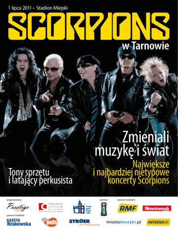 1 lipca 2011 • Stadion Miejski w Tarnowie Zmieniali muzykę i świat Tony sprzętu i latający perkusista organizatorzy patroni medialni Największe i najbardziej nietypowe koncerty Scorpions partner patroni medialni 2 Prezentacja współorganizatora koncertu – miasta Tarnowa Magia Tarnowa Kamienice przy ul. Wałowej K to choć raz zobaczył Tarnów, nie potrafi się oprzeć urokowi jego galicyjskiej atmosfery. To nie tylko wyjątkowa uroda Starego Miasta, w którym zachowały się uliczki w średniowiecznym planie, gotyckie i renesansowe budowle, fragmenty murów obronnych. To także szczególny duch, który odróżnia stare grody południa od reszty Polski. Dziś, jak pojedyncze kamyczki w barwnej mozaice, rozpoznajemy podczas spaceru ulicami Tarnowa ślady kolejnych lat, minionych stuleci. W sennej ciszy zaułków usłyszymy głosy dawnych bohaterów: mądrego Spicymira Leliwity, który założył w 1330 roku Tarnów, wielkiego wodza i polityka - hetmana Jana Tar- nowskiego, niestrudzonego żołnierza niepodległości - generała Józefa Bema, mądrego historyka - Józefa Szujskiego, przeklętego chłopskiego buntownika - Jakuba Szeli, genialnego wynalazcy Jana Szczepanika, charyzmatycznego polityka - Wincentego Witosa, bohaterskiego dowódcy - majora Henryka Sucharskiego, czy uduchowionego pisarza - Romana Brandstaettera. Był Tarnów przez wieki przystanią dla przybyszów: Żydów, Niemców, Ukraińców, Szkotów, Austriaków, Czechów i innych. A każda z tych nacji, każda nowa kultura pozostawiła tu swój trwały ślad. Można więc miasto zwiedzać szlakiem włoskiego renesansu, albo śladami generała Józefa Bema i serdecznych związków polsko-węgierskich, można też zanurzyć się w plątaninę ścieżek żydowskich, aby zadumać się nad resztkami synagogi i skłonić na kirkucie przed pomnikiem tysięcy pomordowanych żydowskich obywateli miasta. Można też doznać uniesień podczas poznawania prawdziwych skarbów sztuki na szlaku tarnowskich kościołów, wśród których jak perła błyszczy Bazylika Katedralna z monumentalnymi nagrobkami Tarnowskich i Ostrogskich, a obok Muzeum Diecezjalne ze swą bezcenną kolekcją. Nikt nie ominie wyjątkowych zbiorów muzealnych w renesansowym ratuszu, w kamienicach z podcieniami przy Rynku, a zwłaszcza jedynej w Europie stałej ekspozycji o historii i kulturze Romów w Muzeum Etnograficznym. Pójdźmy na wieczorny spacer ulicami Tarnowa. Latarnie rzucają światło na kamienny bruk, sale przywołują na liczne koncerty mistrzów, kawiarnie i restauracje zapraszają do dawnych kupieckich piwnic. A po kielichu węgierskiego wina, które od wieków płynęło tu z nieodległego Tokaju, spójrzmy raz jeszcze na iluminowane wieże, na secesyjne kamienice, na baszty i mury obronne, wciągnijmy w płuca wiatr, który przywiał nam zapach tatrzańskich szczytów i beskidzkich łąk. W pamięci pozostanie obraz miasta, do którego odtąd zawsze będziemy tęsknić. Adam Bartosz Scorpions w Tarnowie Prezydent Miasta Tarnowa 3 Szanowni Państwo Przed nami największe muzyczne wydarzenie w historii Tarnowa. Po raz pierwszy w grodzie Leliwitów zagra zespół o renomie sięgającej daleko poza kontynent europejski. To najKamienice przy Rynku i Ratusz prawdopodobniej ostatnia szansa na zobaczenie legendarnych Scorpionsów na koncercie organizowanym w naszym kraju. Tegoroczna wizyta zespołu w Tarnowie - z racji, że powoli żegna się on ze swoimi fanami - będzie czymś wyjątkowym. Scorpions to przecież grupa, która w latach 70. elektryzowała słuchaczy potężnym i pełnym finezji hard-rockiem, w latach 80-tych hitami rockowymi i heavy metalowymi grając koncerty z takimi gwiazdami jak Iron Maiden, Metallica czy AC/ DC. Dziś grupa Scorpions nie straciła nic ze swojej energii, jest u szczytu formy, co podkreślili podczas spotkania z tarnowskimi dziennikarzami w Hanoverze sami muzycy. Możemy się o tym przekonać słuchając ich ostatniej płyty „Sting in the Tail”, na której nawiązują do twórczości zespołu z lat 80., tyle, że z nowym brzmieniem. Jedno co się nie zmienia Klaus nadal zachwyca wszystkich swoim niepowtarzalnym metalicznym głosem. Jestem przekonany, że będzie to zdarzenie wyjątkowe. Życzę wszystkim fanom zespołu z całej Polski, którzy zjadą do Tarnowa na to wielkie muzyczne święto, niezapomnianych, nie tylko muzycznych, wrażeń oraz ciepłych wspomnień. Ryszard Ścigała Prezydent Tarnowa 4 Prezentacja organizatora koncertu – firmy Prestige MJM Wielkie Prestigowe koncerty Koncerty wielkich światowych gwiazd – Roda Stewarta, Bryana Adamsa, Scorpions, Zucchero, José Carrerasa i Basi Trzetrzelewskiej. Opieka promocyjno – marketingowa nad żużlową reprezentacją Polski. Pozyskanie pierwszego w historii sponsora żużlowej kadry. Wspaniałe Gale Sportu Żużlowego w Warszawie i Zielonej Górze. Czy w końcu mecz Gwiazd Piłki Ręcznej z udziałem najlepszych szczypiornistów świata. To tylko niektóre z przedsięwzięć, które udało się zrealizować w ciągu trzech lat właścicielom agencji Prestige. O statnie dwa lata w działalności firmy to głównie organizacja koncertów coraz większych gwiazd światowej muzyki. Dodajmy koncertów, które coraz częściej odbywają się w miejscowościach, które dotąd nigdy nie znajdowały się na trasach koncertowych gwiazd światowego show businessu. Carreras na 777-leciu Torunia 31 lipca 2010 roku agencja Prestige była organizatorem koncertu José Carrerasa w Toruniu. Znakomity hiszpański tenor wystąpił w ponad 2,5-godzinnym koncertem. Na program złożyły się głównie wielkie przeboje muzyki operowej, utwory z popularnych musicali oraz piękne pieśni hiszpańskie i włoskie. Koncert zorganizowany został z okazji 777-lecia miasta. Carrerasowi towarzyszyła 65-osobowa Toruńska Orkiestra Symfoniczna pod batutą Davida Gimeneza. W koncercie jako solistka, ale także w duecie z wielkim tenorem wystąpiła ukraińska sopranistka 