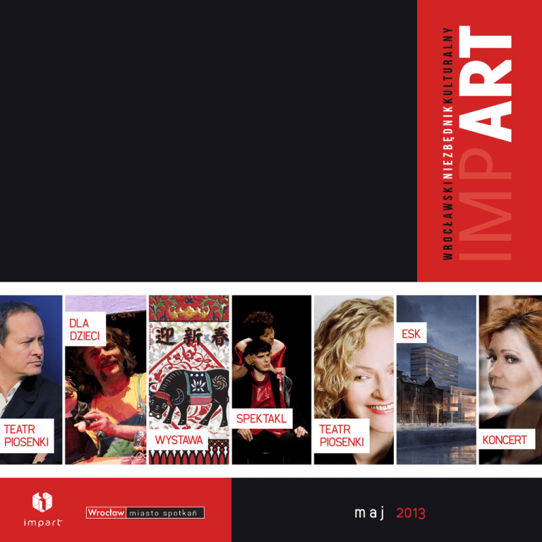 IMPART DLA DZIECI TEATR PIOSENKI ESK SPEKTAKL WYSTAWA TEATR PIOSENKI m a j 2013 KONCERT Drodzy Czytelnicy i Widzowie… Po niezwykle pracowitym, festiwalowym, ale chłodnym kwietniu nareszcie wiosna daje szansę głębszego oddechu. Podczas rozpoczynającego maj długiego weekendu wielu z Państwa wybierze odpoczynek w plenerze. Tym, którzy zdecydują się zostać w mieście, polecamy kolejną próbę pobicia gitarowego rekordu Guinnesa w grupowym wykonaniu „Hey, Joe” (najlepiej z własną gitarą) na wrocławskim Rynku, lub muzyczną majówkę na Wyspie Słodowej. Pod gościnnym dachem Impartu natomiast w tym miesiącu proponujemy kilka ciekawych koncertów dla miłośników dobrej piosenki w mistrzowskim wykonaniu. Przede wszystkim dwie wielkie damy polskiej estrady – Edyta Geppert i Lora Szafran. Gwiazda piosenki aktorskiej, Edyta Geppert, zaprezentuje się w repertuarze złożonym z pereł polskiej piosenki literackiej. Natomiast w wykonaniu jednej z najwybitniejszych polskich wokalistek jazzowych, Lory Szafran, usłyszymy songi i ballady Leonarda Cohena w polskich tłumaczeniach m.in. Macieja Zembatego. Płyta „Sekrety życia według Leonarda Cohena”, z której utwory artystka wykona podczas koncertu, zdobyła już status złotej. Przypomnijmy, że pięć lat temu właśnie na zaproszenie Impartu gościliśmy kanadyjskiego barda we Wrocławiu. W Teatrze Piosenki będziemy także oklaskiwać Jacka Bończyka z zespołem. Związany z Wrocławiem artysta przypomni twórczość Stanisława Staszewskiego, spopularyzowaną przez syna poety, Kazika Staszewskiego. Miłośników teatru zapraszamy na kolejne przedstawienia drugiego - poza cieszącym się uznaniem "Leningradem" – hitu teatralnego w Imparcie, którym zasłużenie staje się spektakl akrobatyczno-taneczny „Prometeusz”. Zachęcamy też do oglądania pokazów teatru tańca, realizowanych przez Laboratorium Ruchu, działające w ramach ESK 2016. W maju proponujemy dwie takie prezentacje. W tym miesiącu planowany jest finał kilkumiesięcznych działań projektu Halo Echo. Najmłodsi twórcy będą mieli swoje święto podczas Ogólnopolskiego Przeglądu Dziecięcych Filmów Animowanych. W czasie trzydniowego festiwalu przewidziane są pokazy najlepszych filmów zrealizowanych przez dzieci, rozstrzygnięcie konkursu, spotkania autorskie z twórcami filmów, warsztaty filmowe, a także koncerty. Poza Impartem imprezy Festiwalu „halo echo” będą się odbywać także w ODT Światowid, Centrum Sztuki WRO i Centrum Technologii Audiowizualnych. Już dziś anonsujemy, przygotowywaną na czerwiec, interesująco zapowiadającą się wystawę. Podczas jej oglądania będzie można skonfrontować mające swój niezaprzeczalny urok zdjęcia, widoki okolic siedziby Impartu, zachowane na przedwojennych rycinach, fotografiach, mapach i pocztówkach z dzisiejszym wyglądem tej części naszego miasta. W czerwcu również podziwiać będziemy u nas Krystynę Jandę w słynnym już monodramie Danuta W. Serdecznie zapraszamy do uczestnictwa w proponowanych zdarzeniach. A zanim wybiorą Państwo plener na drugi majowy długi weekend, spotkajmy się w Imparcie! Krzysztof Maj dyrektor generalny BF Impart 2016 www.impart.art.pl 1 Repertuar 6, 7 V pon., wt. 6V pon. 7V wt. 9V czw. 10 V pt. 11 V MAJ Pracowania Teatralna warsztaty str. 7 Jazz jam session koncert str. 6 Drzeworyty - talizmany szczęścia wernisaż wystawy str. 8 Mój Staszewski - Jacek Bończyk koncert Teatru Piosenki str. 9 100zł/mies 35/40zł Przed premierą Dominika Barabas Teatr Piosenki str. 10 sob. Król Maciuś spektakl dla dzieci str.11 15zł 11 V sob. Laboratorium Ruchu spektakl teatru tańca str.12 20zł 14 V wt. Król Edyp spektakl str. 13 15zł 14 V wt. Bluess jam session koncert 19 V ndz. Baśń o grającym imbryku spektakl dla dzieci str. 14 15zł 19 V ndz. Edyta Geppert koncert Teatru Piosenki str. 15 40/60/70zł 20 V pon. Laboratorium Ruchu spektakl teatru tańca str. 16 20zł Leningrad spektakl Teatru Piosenki str. 17 35/40zł Halo echo Festiwal Filmów Animowanych str. 18 Prometeusz spektakl str. 20 35/45zł Lora Szafran Sekrety życia według Leonarda Cohena koncert str. 21 40/55zł 22, 23 V śr., czw. 24, 25, 26 V pt., sb., ndz. 24, 25, 26, 27 V pt., sb., ndz., pon. 27 V pon. str. 6 Organizatorzy zastrzegają sobie prawo do zmian w repertuarze 2 koncert festiwal spektakl ESK 2016 spektakl dla dzieci Teatr Piosenki wystawa inne www.impart.art.pl FOTOREPORTAŻ Działo się na 49. Festiwalu Jazz nad Odrą w kwietniu 2013 fot. Natalia Borzymowska Prometeusz premiera Leszek Możdżer Adam Makowicz Cassandra Wilson Aga Zaryan Kurt Elling fot.Wiktor SławekBernatowicz Przerwa fot. Adam Bałdych Robert Glasper Big Festival Band Henryk Miśkiewicz Michał Urbaniak www.impart.art.pl 3 środa 1 maja godzina 10.00 Wrocław, Rynek BILETY GITAROWY KRÓL MACIUŚ REKORD GUINNESA Podczas Gitarowego Rekordu Guinnessa, oprócz najlepszych polskich gitarzystów, będzie można zobaczyć także gitarzystkę Michaela Jacksona – Jennifer Batten, gitarzystę KISS – Bruce’a Kulicka oraz Johna Corabiego – gitarzystę Mötley Crüe. Wystąpi też mistrz bałałajki z Rosji– Alexey Arhipovsky oraz znany amerykański fingerstylowiec, Preston Reed. W tym roku gitarzyści będą próbowali pobić zeszłoroczny Rekord Guinnessa, kiedy to Hey Joe Jimiego Hendrixa wybrzmiał na 7273 gitary. Do tej pory w imprezie udział wzięli m.in. Steve Morse (Deep Purple), Marcus Miller, Leon Hendrix, Al Di Meola, Tommy Emmanuel, Ray Wilson (były wokalista Genesis), Ten Years After, Tood Wolf (gitarzysta Sheryl Crow), Bernie Marsden (gitarzysta Whitesnake), a także wszyscy najważniejsi polscy gitarzyści. INNE Cztery najlepsze wyniki na świecie w równoczesnym graniu na gitarze należą do Polaków. W 2009 roku na wrocławskim Rynku zebrało się 6347 gitarzystów, rok później pojwiło się 4 www.impart.art.pl fot. Sławek Przerwa wydarzenie bezpłatne 4597 osób. W następnym rok