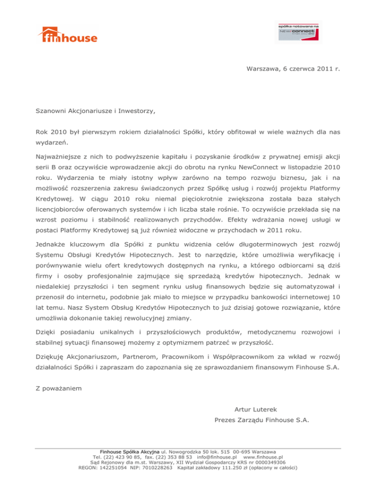 Warszawa, 6 czerwca 2011 r. Szanowni Akcjonariusze i Inwestorzy, Rok 2010 był pierwszym rokiem działalności Spółki, który obfitował w wiele ważnych dla nas wydarzeń. Najważniejsze z nich to podwyższenie kapitału i pozyskanie środków z prywatnej emisji akcji serii B oraz oczywiście wprowadzenie akcji do obrotu na rynku NewConnect w listopadzie 2010 roku. Wydarzenia te miały istotny wpływ zarówno na tempo rozwoju biznesu, jak i na możliwość rozszerzenia zakresu świadczonych przez Spółkę usług i rozwój projektu Platformy Kredytowej. W ciągu 2010 roku niemal pięciokrotnie zwiększona została baza stałych licencjobiorców oferowanych systemów i ich liczba stale rośnie. To oczywiście przekłada się na wzrost poziomu i stabilność realizowanych przychodów. Efekty wdrażania nowej usługi w postaci Platformy Kredytowej są już również widoczne w przychodach w 2011 roku. Jednakże kluczowym dla Spółki z punktu widzenia celów długoterminowych jest rozwój Systemu Obsługi Kredytów Hipotecznych. Jest to narzędzie, które umożliwia weryfikację i porównywanie wielu ofert kredytowych dostępnych na rynku, a którego odbiorcami są dziś firmy i osoby profesjonalnie zajmujące się sprzedażą kredytów hipotecznych. Jednak w niedalekiej przyszłości i ten segment rynku usług finansowych będzie się automatyzował i przenosił do internetu, podobnie jak miało to miejsce w przypadku bankowości internetowej 10 lat temu. Nasz System Obsług Kredytów Hipotecznych to już dzisiaj gotowe rozwiązanie, które umożliwia dokonanie takiej rewolucyjnej zmiany. Dzięki posiadaniu unikalnych i przyszłościowych produktów, metodycznemu rozwojowi i stabilnej sytuacji finansowej możemy z optymizmem patrzeć w przyszłość. Dziękuję Akcjonariuszom, Partnerom, Pracownikom i Współpracownikom za wkład w rozwój działalności Spółki i zapraszam do zapoznania się ze sprawozdaniem finansowym Finhouse S.A. Z poważaniem Artur Luterek Prezes Zarządu Finhouse S.A. Finhouse Spółka Akcyjna ul. Nowogrodzka 50 lok. 515 00-695 Warszawa Tel. (22) 423 90 85, fax. (22) 353 88 53 [email protected] www.finhouse.pl Sąd Rejonowy dla m.st. Warszawy, XII Wydział Gospodarczy KRS nr 0000349306 REGON: 142251054 NIP: 7010228263 Kapitał zakładowy 111.250 zł (opłacony w całości)