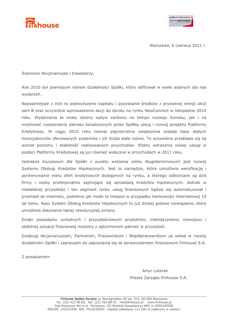 FINHOUSE 2010 - Pismo Zarządu