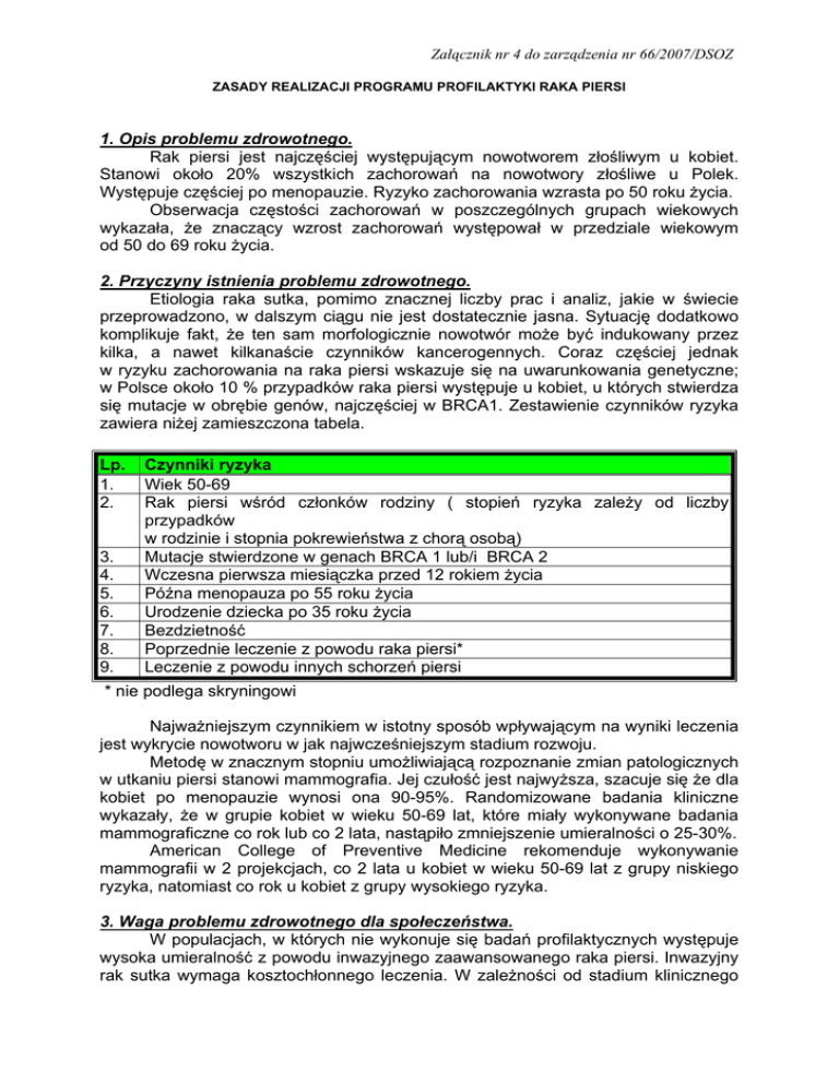 Załącznik nr 4 do zarządzenia nr 66/2007/DSOZ ZASADY REALIZACJI PROGRAMU PROFILAKTYKI RAKA PIERSI 1. Opis problemu zdrowotnego. Rak piersi jest najczęściej występującym nowotworem złośliwym u kobiet. Stanowi około 20% wszystkich zachorowań na nowotwory złośliwe u Polek. Występuje częściej po menopauzie. Ryzyko zachorowania wzrasta po 50 roku życia. Obserwacja częstości zachorowań w poszczególnych grupach wiekowych wykazała, że znaczący wzrost zachorowań występował w przedziale wiekowym od 50 do 69 roku życia. 2. Przyczyny istnienia problemu zdrowotnego. Etiologia raka sutka, pomimo znacznej liczby prac i analiz, jakie w świecie przeprowadzono, w dalszym ciągu nie jest dostatecznie jasna. Sytuację dodatkowo komplikuje fakt, że ten sam morfologicznie nowotwór może być indukowany przez kilka, a nawet kilkanaście czynników kancerogennych. Coraz częściej jednak w ryzyku zachorowania na raka piersi wskazuje się na uwarunkowania genetyczne; w Polsce około 10 % przypadków raka piersi występuje u kobiet, u których stwierdza się mutacje w obrębie genów, najczęściej w BRCA1. Zestawienie czynników ryzyka zawiera niżej zamieszczona tabela. Lp. 1. 2. 3. 4. 5. 6. 7. 8. 9. Czynniki ryzyka Wiek 50-69 Rak piersi wśród członków rodziny ( stopień ryzyka zależy od liczby przypadków w rodzinie i stopnia pokrewieństwa z chorą osobą) Mutacje stwierdzone w genach BRCA 1 lub/i BRCA 2 Wczesna pierwsza miesiączka przed 12 rokiem życia Późna menopauza po 55 roku życia Urodzenie dziecka po 35 roku życia Bezdzietność Poprzednie leczenie z powodu raka piersi* Leczenie z powodu innych schorzeń piersi * nie podlega skryningowi Najważniejszym czynnikiem w istotny sposób wpływającym na wyniki leczenia jest wykrycie nowotworu w jak najwcześniejszym stadium rozwoju. Metodę w znacznym stopniu umożliwiającą rozpoznanie zmian patologicznych w utkaniu piersi stanowi mammografia. Jej czułość jest najwyższa, szacuje się że dla kobiet po menopauzie wynosi ona 90-95%. Randomizowane badania kliniczne wykazały, że w grupie kobiet w wieku 50-69 lat, które miały wykonywane badania mammograficzne co rok lub co 2 lata, nastąpiło zmniejszenie umieralności o 25-30%. American College of Preventive Medicine rekomenduje wykonywanie mammografii w 2 projekcjach, co 2 lata u kobiet w wieku 50-69 lat z grupy niskiego ryzyka, natomiast co rok u kobiet z grupy wysokiego ryzyka. 3. Waga problemu zdrowotnego dla społeczeństwa. W populacjach, w których nie wykonuje się badań profilaktycznych występuje wysoka umieralność z powodu inwazyjnego zaawansowanego raka piersi. Inwazyjny rak sutka wymaga kosztochłonnego leczenia. W zależności od stadium klinicznego zaawansowania jest to leczenie operacyjne (amputacja piersi), radioterapia lub leczenie systemowe (chemioterapia, hormonoterapia). Wszystkie te metody leczenia są bardzo kosztowne. W USA oraz w krajach Unii Europejskiej uznano, że najskuteczniejszym instrumentem ograniczenia zachorowań i poprawy wyników leczenia nowotworów złośliwych są narodowe programy walki z rakiem. Programy te są finansowane ze środków budżetowych państwa, a działania w ramach tych programów oprócz populacyjnych badań przesiewowych obejmują także zakup nowoczesnego sprzętu diagnostyczno – leczniczego oraz działania edukacyjne w odniesieniu do społeczeństwa i kadry medycznej. 4. Cel programu Celem realizacji programu jest obniżenie wskaźnika umieralności z powodu raka piersi do poziomu osiągniętego w przodujących w tym zakresie krajach Unii Europejskiej oraz podniesienie poziomu wiedzy kobiet na temat profilaktyki raka sutka i wprowadzenie na terenie całego kraju zasad postępowania diagnostycznego. 5. Tryb zapraszania do programu. Dla osiągnięcia zamierzonych celów optymalny jest system imiennego zapraszania świadczeniobiorców. Do chwili wprowadzenia skryningu populacyjnego w ramach Narodowego Programu Zwalczania Chorób Nowotworowych akcję informacyjną o programie prowadzą świadczeniodawcy realizujący program. 6. Populacja, do której skierowany jest program. Populacja kobiet w wieku od 50 do 69 lat (przy określaniu wieku należy wziąć pod uwagę rok urodzenia), spełniających jedno z poniższych kryteriów: 1) nie miały wykonywanej mammografii w ciągu ostatnich 24 miesięcy, 2) otrzymały w ramach realizacji programu profilaktyki raka piersi w roku 2007 pisemne wskazanie do wykonania ponownego badania mammograficznego po upływie 12 miesięcy z powodu obciążenia następującymi czynnikami ryzyka: − rak piersi wśród członków rodziny (u matki, siostry lub córki ) − mutacje w obrębie genów BRCA 1 lub/i BRCA 2. Kryteria wykluczające: Programem nie mogą być objęte kobiety, u których już wcześniej zdiagnozowano zmiany nowotworowe o charakterze złośliwym w piersi. 7. Świadczenia zdrowotne w poszczególnych etapach realizacji programu Świadczeniodawca zobowiązany jest do prowadzenia elektronicznej dokumentacji realizacji programu w oparciu o narzędzie informatyczne udostępnione przez Narodowy Fundusz Zdrowia. Etap podstawowy – schemat postępowania: 1) zarejestrowanie w systemie informatycznym udostępnionym przez NFZ, z jednoczesną weryfikacją kwalifikacji do objęcia programem kobiety, która zgłosi się do programu, 2) przeprowadzenie wywiadu i wypełnienie ankiety w systemie informatycznym udostępnionym przez NFZ, 3) wykonanie badania mammograficznego: 2 x 2 zdjęcia mammograficzne wraz z opisem, sporządzenie Karty badania mammograficznego w systemie informatycznym udostępnionym przez NFZ, 2 4) podjęcie decyzji dotyczącej dalszego postępowania w zależności od wyniku badania potwierdzona pisemnie, zgodnie z wzorem określonym w systemie informatycznym udostępnionym przez NFZ ( w przypadku konieczności skierowania pacjentki do etapu pogłębionej diagnostyki, kierujący zobowiązany jest udzielić informacji o wszystkich świadczeniodawcach rea