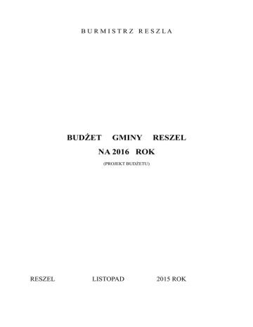 B U R M I S T R Z R E S Z LA BUDŻET GMINY RESZEL NA 2016 ROK (PROJEKT BUDŻETU) RESZEL LISTOPAD 2015 ROK Projekt Uchwała Nr ………… Rady Miejskiej w Reszlu z dnia …… 2015 roku w sprawie uchwalenia budżetu gminy Reszel na 2016 rok Na podstawie art. 18 ust. 2 pkt 4, pkt 9 lit. c), d) i lit. i) ustawy z dnia 08 marca 1990 r. o samorządzie gminnym (t.j. Dz. U. z 2015 rok Poz. 1515) oraz art. 211, art. 212, art. 214, art. 215, art. 222, art. 235, art. 236, art. 237, art. 239, art. 258 ust. 1 i art. 264 ust. 3 ustawy z dnia 27 sierpnia 2009r. o finansach publicznych (t.j. Dz. U. z 2013 rok Poz. 885, z późn. zm.) Rada Miejska uchwala § 1. Dochody budżetu gminy w wysokości 23 803 190,00 zł, zgodnie z załącznikiem nr 1. z tego: - dochody bieżące w wysokości 23 602 190,00 zł, - dochody majątkowe w wysokości 201 000,00 zł, § 2.1. Wydatki budżetu gminy w wysokości 23 972 178,00 zł, zgodnie z załącznikiem nr 2. z tego: - wydatki bieżące w wysokości 22 658 997,00 zł, - wydatki majątkowe w wysokości 1 313 181,00 zł, 2. Limity wydatków na wieloletnie programy inwestycyjne, zgodnie z załącznikiem nr 3. 3. Wydatki inwestycyjne w 2016 roku w wysokości 653 434,00 zł, zgodnie z załącznikiem nr 2, 3 i 3a. 4. Wydatki na programy i projekty realizowane ze środków pochodzących z funduszy strukturalnych i Funduszu Spójności oraz pozostałe środki pochodzące ze źródeł zagranicznych nie podlegających zwrotowi, w roku 2016 w wysokości 580 631,00 zł, zgodnie z załącznikiem nr 4. 5. Dochody i wydatki związane z realizacją: - zadań z zakresu administracji rządowej i innych zadań zleconych jednostce samorządu terytorialnego odrębnymi ustawami w 2016 roku, zgodnie z załącznikiem nr 5, - zadań realizowanych w drodze umów lub porozumień między jednostkami samorządu terytorialnego w 2016 roku, zgodnie z załącznikiem nr 6. § 3. Deficyt budżetu gminy w wysokości 168 988,00 zł zostanie pokryty przychodami pochodzącymi z: - wolnych środków, jako nadwyżki środków pieniężnych na rachunku bieżącym budżetu gminy, wynikających z rozliczeń kredytów i pożyczek z lat ubiegłych w kwocie 168 988,00 zł, § 4.1.Przychody budżetu gminy ustala się w wysokości 2 223 323,88 zł, rozchody w wysokości 2 054 335,88 zł, zgodnie z załącznikiem nr 7. 2. Planowane przychody z tytułu wolnych środków w wysokości 723 323,88 zł przeznacza się na: -spłatę wcześniej zaciągniętych zobowiązań z tytułu pożyczek i kredytów w wysokości 554 335,88 zł, -pokrycie deficytu budżetu w wysokości 168 988,00 zł. § 5. Ustala się limity zobowiązań z tytułu zaciąganych kredytów i pożyczek oraz emitowanych papierów wartościowych, zaciąganych na: 1) finansowanie przejściowego deficytu budżetu w kwocie 500 000,00 zł. § 6. Ustala się limit wolnych środków do lokowania na rachunkach bankowych w innych bankach niż bank prowadzący obsługę budżetu gminy w wysokości 1 500 000,00 zł. § 7. Wydatki przypadające do spłaty w roku budżetowym 2016, zgodnie z zawartą umową, z tytułu poręczeń i gwarancji udzielonych przez gminę – 171 589,00 zł. 1 § 8.1. Ustala się dochody w kwocie 108 400,00 zł z tytułu wydawania zezwoleń na sprzedaż napojów alkoholowych oraz wydatki w kwocie 103 900,00 zł na realizację zadań określonych w programie profilaktyki i rozwiązywania problemów alkoholowych. 2. Ustala się wydatki w kwocie 4 500,00 zł na realizację zadań określonych w gminnym programie przeciwdziałania narkomanii. § 9. Ustala się dochody i wydatki z tytułu opłat i kar, o których mowa w art. 402 ust. 4-6 i art. 403 ustawy z dnia 27 kwietnia 2001 r. – Prawo ochrony środowiska (t.j. Dz.U. z 2013 rok Poz. 1232, z późn.zm.): 1) dochody w wysokości – 130 000,00 zł 2) wydatki w wysokości – 130 000,00 zł. § 10. Ustala się dochody i wydatki z tytułu opłat, o których mowa w art. 6r ust. 1 i 2 ustawy z dnia 13 września 1996r. o utrzymaniu czystości i porządku w gminach (t.j. Dz.U. z 2013 rok Poz. 1399, z późn. zm.): 1) dochody w wysokości – 800 897,00 zł 2) wydatki w wysokości – 800 897,00 zł. § 11. Ustala się wydatki budżetu na 2016 rok obejmujące zadania jednostek pomocniczych gminy na łączną kwotę 298 774,00 zł, w tym ze środków funduszu sołeckiego na łączną kwotę 298 774,00 zł, zgodnie z załącznikiem nr 8. § 12. Zestawienie planowanych kwot dotacji udzielonych z budżetu gminy, realizowanych przez podmioty należące i nienależące do sektora finansów publicznych, zgodnie z załącznikiem nr 9. § 13. Plan przychodów i kosztów w łącznej kwocie (zbiorczo): - plan dochodów w łącznej kwocie rachunku samorządowych jednostek budżetowych prowadzących działalność na podstawie ustawy o systemie oświaty i wydatków nimi finansowanych: dochody – 2 000,00 zł, wydatki – 2 000,00 zł, zgodnie z załącznikiem nr 10. § 14. 1. Rezerwa ogólna wynosi 63 900,00 zł. 2. Rezerwa celowa wynosi 96 100,00 zł, z tego: a) 25 000,00 zł na odprawy emerytalne i rentowe pracowników, b) 71 100,00 zł na zarządzanie kryzysowe. § 15.1. Upoważnia się Burmistrza do zaciągania kredytów i pożyczek oraz emisji papierów wartościowych do wysokości poszczególnych limitów zobowiązań określonych w § 5 Uchwały, na: 1) finansowanie przejściowego deficytu budżetu w kwocie 500 000,00 zł. 2. Upoważnia się Burmistrza do: 1) przekazania uprawnień kierownikom jednostek organizacyjnych gminy do zaciągania zobowiązań z tytułu umów, których realizacja w roku budżetowym i latach następnych jest niezbędna dla zapewnienia ciągłości działania jednostki i z których wynikające płatności wykraczają poza rok budżetowy, 2) przekazania kierownikom jednostek budżetowych uprawnień do dokonywania przeniesień w planie wydatków oraz planie wydatków wydzielonego rachunku dochodów samorządowych jednostek budżetowych prowadzących działalność na podstawie ustaw