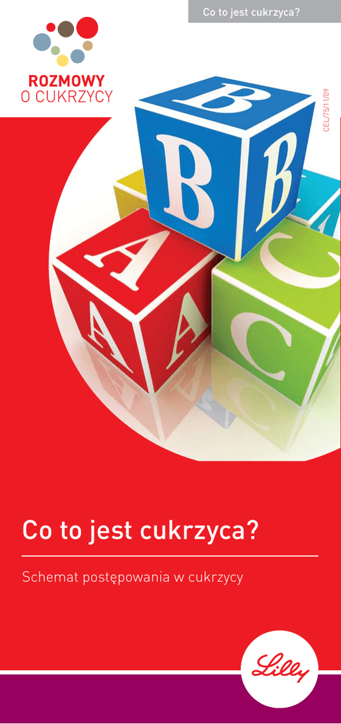 CEL/75/11/09 Co to jest cukrzyca? Co to jest cukrzyca? Schemat postępowania w cukrzycy Co to jest cukrzyca? Wstęp Cukrzyca to stan, w którym organizm nie może utrzymać na odpowiednim poziomie stężenia glukozy (cukru) we krwi. Glukoza jest głównym źródłem energii dla organizmu. Jeśli Twój organizm nie może w odpowiedni sposób jej wykorzystać, poziom glukozy we krwi (poziom glikemii) wzrasta znacznie powyżej normy. Jeśli poziom cukru we krwi przekracza 180 mg/dl, pojawia się cukier w moczu. Wiele produktów żywnościowych spożywanych codziennie jest trawionych do glukozy, która następnie jest wchłaniana do krwi i rozprowadzana po całym organizmie, gdzie jest wykorzystywana jako źródło energii. Stężenie glukozy we krwi jest ściśle związane z wytwarzaniem, uwalnianiem i użytkowaniem insuliny przez organizm. Insulina to hormon produkowany w trzustce, który pomaga prawidłowo wykorzystać glukozę i utrzymać jej stężenie we krwi na prawidłowym poziomie. Jeśli nie masz cukrzycy, to nie wystąpią u Ciebie nadmierne wzrosty glikemii. Mimo że jak dotąd cukrzycy nie można wyleczyć, można z nią żyć pod warunkiem utrzymania stężenia glukozy we krwi możliwie zbliżonego do normy. Pomoże w tym staranne planowanie posiłków, regularnie uprawiany wysiłek fizyczny i stosowanie odpowiednich leków. Twój lekarz i jego zespół służą Ci radą i pomocą, ale rzeczywisty sukces leczenia zależy od Ciebie. Wybory, jakich dokonujesz, w znacznym stopniu określają Twój poziom glukozy we krwi. Co to jest cukrzyca? Rodzaje cukrzycy Cukrzyca typu 1 Wyróżnia się dwa podstawowe rodzaje cukrzycy: typ 1 i typ 2. W cukrzycy typu 1 (poprzednio nazywanej cukrzycą młodzieńczą) organizm wytwarza zbyt mało insuliny albo nie wytwarza jej w ogóle. Osoby z cukrzycą typu 1 muszą brać insulinę codziennie, aby wyrównać jej niedobór w organizmie. Insulinę podaje się w formie zastrzyków. Na cukrzycę typu 1 choruje 10% osób z cukrzycą. Zwykle występuje u osób młodych, ale może również pojawić się u osób dorosłych. Przyczyny cukrzycy typu 1 W cukrzycy typu 1 układ odpornościowy organizmu niszczy komórki wytwarzające insulinę w trzustce. Nikt nie wie dlaczego tak się dzieje. Osoby z cukrzycą typu 1 mogą, ale wcale nie muszą, mieć krewnych z tą samą chorobą. Co to jest cukrzyca? Cukrzyca typu 2 W cukrzycy typu 2 (poprzednio nazywanej cukrzycą dorosłych) organizm może wytwarzać insulinę, ale nie potrafi jej dobrze wykorzystać. Zjawisko to nosi nazwę „insulinooporności”. Z czasem ilość wytwarzanej insuliny zmniejsza się, prowadząc do faktycznego niedoboru insuliny. Cukrzyca typu 2 jest najczęstszą postacią choroby i stwierdza się ją u 9 na 10 osób z cukrzycą. Najczęściej pojawia się po 40 roku życia, ale ostatnio wzrasta liczba osób młodych z tym typem cukrzycy. Osoby z cukrzycą typu 2 otrzymują tabletki doustne, insulinę albo tabletki i insulinę. Niektórzy są w stanie kontrolować poziom glukozy we krwi poprzez staranne planowanie diety i regularny wysiłek fizyczny. Przebieg cukrzycy typu 2 zmienia się w czasie, dlatego leczenie również musi być modyfikowane. Objawy cukrzycy typu 2 W tej postaci cukrzycy stężenie glukozy we krwi wzrasta bardzo powoli, dlatego możesz nie odczuwać niczego nietypowego. We wczesnym stadium cukrzycy typu 2 możesz nie mieć żadnych objawów. Z czasem pojawią się następujące symptomy: • uczucie zmęczenia, • sucha i swędząca skóra, • uczucie drętwienia i mrowienia w obrębie dłoni i stóp, • częste infekcje, • zwiększona objętość wydalanego moczu, • obniżona ostrość wzroku, • powolne gojenie się ran i owrzodzeń, • silne uczucie głodu i pragnienia, • zaburzenia erekcji. Przyczyny cukrzycy typu 2 Nikt nie wie dokładnie, jakie są przyczyny cukrzycy typu 2, ale częściej występuje ona u osób, które: • mają powyżej 40 lat, • mają nadwagę, • są rodzinnie obciążone cukrzycą, • miały cukrzycę podczas ciąży, • urodziły dziecko ważące powyżej 4 kg, • doświadczyły silnego stresu związanego z chorobą albo urazem, • chorują na nadciśnienie tętnicze. Jeśli u kogoś z członków Twojej rodziny występują trzy albo więcej spośród wymienionych cech, osoba ta powinna zostać zbadana pod kątem cukrzycy. Regularnie uprawiane ćwiczenia fizyczne i kontrola masy ciała mogą pomóc zapobiec albo opóźnić wystąpienie cukrzycy typu 2 w niektórych przypadkach, dlatego tak ważne jest odpowiednio wczesne przeprowadzenie badań. Co to jest cukrzyca? Badania stosowane w cukrzycy Badania przesiewowe Cukrzycę można łatwo rozpoznać na podstawie badania krwi. U osób, które nie mają żadnych niepokojących objawów, to właśnie badania przesiewowe mogą wykryć podwyższony poziom cukru we krwi. Oto niektóre badania laboratoryjne stosowane w celu wykrycia cukrzycy: Przypadkowe badanie poziomu glukozy we krwi Badanie to wykonuje się zwykle w ramach badań laboratoryjnych krwi przeprowadzanych podczas ogólnych badań lekarskich. Określa ono poziom glukozy we krwi niezależnie od posiłków. Poziom glukozy powyżej 200 mg/dl (11 mmol/l) świadczy o cukrzycy. W takim przypadku należy powtórzyć badanie poziomu glukozy we krwi na czczo, aby potwierdzić rozpoznanie. Co to jest cukrzyca? Badanie poziomu glukozy we krwi na czczo Jest to standardowe badanie w kierunku cukrzycy. Próbkę krwi pobiera się po upływie co najmniej 8 godzin od ostatniego posiłku, gdy poziom glukozy we krwi jest najniższy. Jeśli wynik wyniesie 126 mg/dl (7 mmol/l) albo więcej, badanie należy przeprowadzić następnego dnia, aby potwierdzić rozpoznanie cukrzycy. Badanie tolerancji glukozy (Test obciążenia glukozą) Badanie to określa zmiany stężenia glukozy we krwi w czasie po wypiciu roztworu cukru. Przed badaniem nie wolno nic jeść przez co najmniej 8 godzin. Jeśli po upływie 2 godzin od wypicia roztworu 