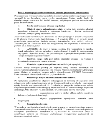 Środki zapobiegające zachorowaniom na choroby przenoszone przez kleszcze. Po oszacowaniu ryzyka zawodowego należy dokonać wyboru środków zapobiegawczych i wymienić je na formularzu oceny ryzyka zawodowego. Można ustalić środki do obowiązkowego stosowania lub środki zalecane, zwiększające poziom zabezpieczenia przed zachorowaniem. 1) Środki odstraszające kleszcze (repelenty). 2) Odzież i obuwie zabezpieczające ciało: wysokie buty, spodnie z długimi nogawkami spinanymi, koszula z zapinanym kołnierzem i długimi zapinanymi rękawami, nakrycie głowy z rondem na kark. Zestaw taki został wymieniony w Załączniku do obowiązującego w Uczelni Zarządzenia nr 60 Rektora Uniwersytetu Jagiellońskiego z 1 września 2006 r. w sprawie zasad przydzielania pracownikom środków ochrony indywidualnej oraz odzieży roboczej, Załącznik poz. 34. Zestaw ten może być modyfikowany lub uzupełniany w zależności od potrzeb, np. o nakrycie głowy. 3) APTECZKI do pracy w terenie powinny być wyposażone w pęsetkę, środek odkażający (spirytus salicylowy, woda utleniona) i środki do zabezpieczenia rany (gaziki i lepce lub plastry). Na rynku dostępne są pompki do odsysania kleszczy i toksyn z miejsca ukąszenia owadów. 4) Kontrola całego ciała pod kątem obecności kleszczy - na bieżąco i bezpośrednio po powrocie z pracy w terenie. 5) Usunięcie zagnieżdżonego kleszcza (możliwie jak najszybciej). Kleszcza należy uchwycić pęsetką jak najbliżej skóry i usunąć delikatnym ale zdecydowanym ruchem równoległym do linii wkłucia. Kleszcza można także wydłubać jak zadrę. Miejsce po usunięciu kleszcza należy zdezynfekować. UWAGA! Smarowanie kleszcza tłustymi substancjami zwiększa ryzyko zakażenia! 6) Obserwacja miejsca ukłucia kleszcza i stanu zdrowia. Po wystąpieniu jakichkolwiek objawów wskazujących na boreliozę lub zapalenie opon mózgowych, należy natychmiast udać się do lekarza, najlepiej w przychodni sprawującej opiekę lekarską nad pracownikami UJ. O zaistniałym przypadku zachorowania należy natychmiast powiadomić osobę kierującą, Inspektorat BHP UJ oraz właściwego inspektora sanitarnego. Opis objawów - w Załącznikach 3 i 4. Najbardziej typowe objawy to: • zaczerwienienie skóry w okolicy ukłucia należy zgłosić się do lekarza (podejrzenie boreliozy); • objawy grypopodobne (podejrzenie zapalenia opon mózgowych). 7) Szczepienia ochronne. W związku z możliwością uchronienia się przed wirusowym zapaleniem mózgu poprzez zastosowanie szczepienia ochronnego, Inspektorat BHP UJ proponuje rozważenie potrzeby szczepienia pracowników. Szczepienia te są wskazane na stanowiskach pracy w kompleksach leśnych na obszarach endemicznego występowania zachorowań na kleszczowe zapalenie mózgu. Borelioza - opis i objawy Etapy choroby: 1. borelioza wczesna – stadium zakażenia ograniczonego i stadium zakażenia rozsianego; 2. borelioza późna – stadium zakażenia przewlekłego. Obraz kliniczny jest zmienny i zdarza się współistnienie różnych faz choroby u jednego pacjenta. Okres wylęgania choroby w postaci rumienia wędrującego wynosi średnio od 3 do 30 dni. 1.1. Borelioza wczesna - etap zakażenia ograniczonego: • rumień wędrujący (Erythema migrans) pojawia się w miejscu ukłucia i stopniowo rozszerza, może mu towarzyszyć pieczenie skóry i świąd. Objawy: • grypopodobne (bóle mięśni, głowy i stawów) • zaburzenia czucia i kołatanie serca • chłoniak limfocytarny skóry. 1.2. Borelioza wczesna - etap zakażenia rozsianego: • • • • rumień wędrujący mnogi (wtórny); zapalenie stawów (niesymetryczne, dotyczy głównie dużych stawów ale zajęte mogą być wszystkie stawy); zapalenie mięśnia sercowego; zapalenie nerwu trójdzielnego. Objawy: • zapalenia lub podrażnienia opon mózgowo-rdzeniowych i nerwów obwodowych; • osłabienie, bóle głowy, sztywność karku; • przewlekłe zmęczenie; • zaburzenia czucia; • zaburzenia pamięci. 2.1. Borelioza późna - stadium zakażenia przewlekłego: • przewlekłe zanikowe zapalenie skóry powodujące powstawanie trudno gojących się owrzodzeń; • zmiany w układzie krążenia – zaburzenia rytmu, bloki przedsionkowo-komorowe, zapalenie osierdzia, wsierdzia i mięśnia sercowego. Objawy: • neurologiczne – zapalenie nerwów czaszkowych (najczęściej VI i VII), zapalenie mózgu i opon mózgowo-rdzeniowych,paraliż twarzy, niedowłady kończyn,depresja, otępienie, bóle korzonkowe,psychozy, niedowłady; • bóle i obrzęki stawów z wysiękami; • zaburzenia widzenia; • sztywność stawów i kręgosłupa szyjnego; • bóle i kurcze mięśni; • bezsenność. Elżbieta Staszków, Kierownik Laboratorium Wirusologii WSEE Kraków (skrót) Kleszczowe zapalenie mózgu - opis i objawy Zachorowania na KZM występują głównie w okresie wczesno-letnim lub wiosenno-letnim. W większości przypadków choroba przebiega bezobjawowo lub skąpoobjawowo, u dzieci na ogół łagodniej niż u dorosłych. Cięższy przebieg choroby i częstsze powikłania neurologiczne obserwuje się u osób po 40 roku życia. W zdecydowanej większości przypadków choroba nie jest groźna i nie pozostawia trwałych śladów. 1. Zapalenie opon mózgowo-rdzeniowych jest najczęstszą i najlżejszą postacią kliniczną i objawiaja się: • bólami głowy, • nudnościami, wymiotami, • gorączką • sztywnością karku. Choroba ma zazwyczaj przebieg łagodny i nie pozostawia trwałych następstw. 2. Zapalenie mózgu występuje rzadziej. Dochodzi do: • zaburzeń świadomości, • śpiączki, • porażeń kończyn. Powikłania w postaci niedowładów, zaników mięśniowych, zaburzeń koncentracji czy depresji mogą utrzymywać się przez wiele miesięcy znacznie pogarszając jakość życia. Ustępują powoli po długiej rehabilitacji z reguły bez pozostawienia trwałych następstw. W krajnych przypadkach choroba kończy się zgonem (ok.1 - 2% zac