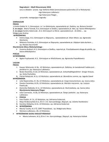 Nagrodzeni – Myśli Nieuczesane 2016 Jury w składzie : przew. mgr Stefania Mała (emerytowana polonistka LO w Wolsztynie) mgr Katarzyna Lulkiewicz mgr Katarzyna Flieger , przyznało następujące nagrody: GIMNAZJUM PROZA 1.Emilia Gabler kl. 3, Gimnazjum nr 1 w Wolsztynie, opowiadanie pt. Zasłony, op. Bożena Smoleń 2. ex aequo Maria Tomiak, kl.3, Gimnazjum w Siedlcu, opowiadanie pt. Ben, op. Iwona Mikołajewicz 2. ex aequo Sandra Adamczak , kl.3, Gimnazjum w Obrze ,opowiadanie pt. Za lekka…, op. Małgorzata Andrys WYRÓŻNIENIA Emma Zając, kl.2, Gimnazjum w Zbąszyniu, opowiadanie pt. Silver Moon, op. Agnieszka Stachecka Wiktoria Fimińska, kl.3, Gimnazjum w Zbąszyniu, opowiadanie pt. Gdybym była duchem…, op. Renata Kaczmarek Wyróżnienie Głosu Wolsztyńskiego Zuzanna Budzyń, kl.3, Gimnazjum w Siedlcu, reportaż pt. Prześladowanie drogą do piekła, op. Iwona Mikołajewicz POEZJA WYRÓŻNIENIA Agata Frąckowiak, kl.3, Gimnazjum w Wielichowie, op. Agnieszka Popiołkiewicz LICEUM PROZA 1. Kacper Mielcarek, kl.3b, LO Wolsztyn, opowiadanie pt. Załóżmy, że świadomość ludzka jest… pendrive’m ,op. Katarzyna Lulkiewicz. 2. Beata Stasińska, kl.2d, LO Wolsztyn, opowiadanie pt. Schutzhaftlagerfϋhrer Gregor Krauze, op. Anita Pacholska. 3. Patryk Ratajczak, kl.1z, LO Wolsztyn, opowiadanie pt. Benedictus somno, op. Jagoda Zawal WYRÓŻNIENIA Julia Napieralska, kl. 2b, LO Wolsztyn, opowiadanie pt. Exegi monumentum, op. Iwona Joksz. Żaneta Ciesielska, kl.2h, LO Wolsztyn, opowiadanie pt. Morskie marzenia , op. Justyna Pawliczak. Dominika Ślebioda, kl.1c, LO Wolsztyn, opowiadanie pt. Roztrzaskany, op. Iwona Joksz Wyróżnienie Katarzyny Flieger Julia Czarnecka , kl.3b, LO Wolsztyn, opowiadanie pt. Święci piekielni , op. Katarzyna Lulkiewicz POEZJA 1. Ewa Chybin, kl. 2c, LO Wolsztyn, op. Adrianna Gubernat, 2. Maja Straburzyńska kl.2, ZS nr 1 im. Garczyńskiego, Zbąszyń, op. Jolanta Stankiewicz 3. Karolina Małycha, kl.2c, LO Wolsztyn, op. Adrianna Gubernat 4. WYRÓŻNIENIA Maciej Tyszka, kl.2 TŻ, ZSRiT Powodowo, op. Małgorzata Weiss Martyna Lulkiewicz, 2B, LO Wolsztyn, WYRÓŻNIENIE GŁOSU WOLSZTYŃSKIEGO Marta Lehmann, kl.2, ZS nr 1 im. Garczyńskiego, Zbąszyń, op. Katarzyna Kubiak