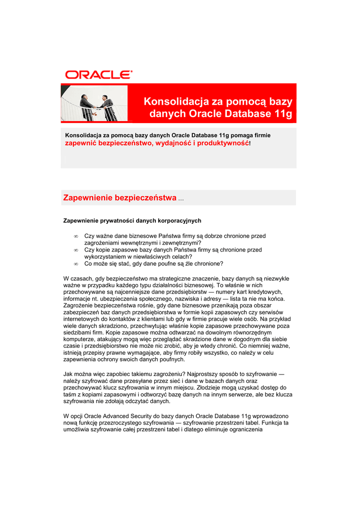 Konsolidacja za pomocą bazy danych Oracle Database 11g Konsolidacja za pomocą bazy danych Oracle Database 11g pomaga firmie zapewnić bezpieczeństwo, wydajność i produktywność! Zapewnienie bezpieczeństwa … Zapewnienie prywatności danych korporacyjnych • • • Czy waŜne dane biznesowe Państwa firmy są dobrze chronione przed zagroŜeniami wewnętrznymi i zewnętrznymi? Czy kopie zapasowe bazy danych Państwa firmy są chronione przed wykorzystaniem w niewłaściwych celach? Co moŜe się stać, gdy dane poufne są źle chronione? W czasach, gdy bezpieczeństwo ma strategiczne znaczenie, bazy danych są niezwykle waŜne w przypadku kaŜdego typu działalności biznesowej. To właśnie w nich przechowywane są najcenniejsze dane przedsiębiorstw ― numery kart kredytowych, informacje nt. ubezpieczenia społecznego, nazwiska i adresy ― lista ta nie ma końca. ZagroŜenie bezpieczeństwa rośnie, gdy dane biznesowe przenikają poza obszar zabezpieczeń baz danych przedsiębiorstwa w formie kopii zapasowych czy serwisów internetowych do kontaktów z klientami lub gdy w firmie pracuje wiele osób. Na przykład wiele danych skradziono, przechwytując właśnie kopie zapasowe przechowywane poza siedzibami firm. Kopie zapasowe moŜna odtwarzać na dowolnym równorzędnym komputerze, atakujący mogą więc przeglądać skradzione dane w dogodnym dla siebie czasie i przedsiębiorstwo nie moŜe nic zrobić, aby je wtedy chronić. Co niemniej waŜne, istnieją przepisy prawne wymagające, aby firmy robiły wszystko, co naleŜy w celu zapewnienia ochrony swoich danych poufnych. Jak moŜna więc zapobiec takiemu zagroŜeniu? Najprostszy sposób to szyfrowanie ― naleŜy szyfrować dane przesyłane przez sieć i dane w bazach danych oraz przechowywać klucz szyfrowania w innym miejscu. Złodzieje mogą uzyskać dostęp do taśm z kopiami zapasowymi i odtworzyć bazę danych na innym serwerze, ale bez klucza szyfrowania nie zdołają odczytać danych. W opcji Oracle Advanced Security do bazy danych Oracle Database 11g wprowadzono nową funkcję przezroczystego szyfrowania ― szyfrowanie przestrzeni tabel. Funkcja ta umoŜliwia szyfrowanie całej przestrzeni tabel i dlatego eliminuje ograniczenia skanowania częściowego (range scan) oraz klucza obcego typowe dla szyfrowania na poziomie kolumn. Tworzona jest nowa, szyfrowana przestrzeń tabel i dane (tabele oraz indeksy) są zapisywane w tej przestrzeni w postaci zaszyfrowanej. Opcja Advanced Security to tylko jedna z opcji zabezpieczeń oferowanych przez firmę Oracle. Zapewnianie wydajności … Automatyczne diagnozowanie wydajności • • • Czy Państwa firma chce, aby administratorzy bazy danych mieli więcej czasu na projekty strategiczne? Czy Państwa firma chce szybciej identyfikować główne przyczyny problemów z wydajnością i dostępnością? Czy pomogłoby, gdyby administratorzy bazy danych w Państwa firmie mogli identyfikować przyczynę problemów z wydajnością, spoglądając po prostu na jeden ekran? Diagnozowanie systemu działającego ze zbyt małą wydajnością to zadanie czasochłonne, często owiane mitami i legendami, z których niewiele jest opartych na faktach. Obecnie istnieje wiele narzędzi do dostrajania oferowanych przez innych producentów, ale tylko niewiele z tych narzędzi moŜe pomóc w udzieleniu odpowiedzi na pytania typu „Jak moŜna maksymalnie udoskonalić system?” lub „Dlaczego system działa dziś wolniej niŜ tydzień temu?”. Większość produktów wyświetla po prostu nieprzetworzone statystyki bazy danych w postaci graficznej, pozostawiając uŜytkownikom samodzielne określenie podstawowej przyczyny poprzez szczegółową analizę duŜych ilości takich nieprzetworzonych danych. Zadanie to moŜe się okazać złoŜone i Ŝmudne, nawet jeśli dysponuje się najlepszymi narzędziami. Pakiet Oracle Diagnostics Pack 11g zawiera moduł automatycznego diagnozowania wbudowywany bezpośrednio w jądro bazy danych Oracle Database 11g, tzw. Automatic Database Diagnostic Monitor (ADDM). Jest to wyjątkowo innowacyjne, pierwsze aŜ tak wydajne rozwiązanie do automatycznego diagnozowania. UmoŜliwia ono bazie danych automatyczne diagnozowanie jej problemów wydajnościowych, tym samym zwalniając całkowicie administratorów z zajmowania się tym złoŜonym i Ŝmudnym zadaniem. Proces automatycznego dostrajania aplikacji • • Czy administratorzy bazy danych w Państwa firmie spędzają zbyt wiele czasu na dostrajaniu aplikacji, gdyŜ ich wydajność jest zbyt niska? Czy podczas uŜytkowania aplikacji Państwa firma odczuwa niską wydajność obsługi zapytań SQL i czy Państwa firma potrzebuje rozwiązania „działającego wprost”? Dla administratorów baz danych i programistów opracowujących aplikacje dostrajanie aplikacji jest zadaniem o znaczeniu krytycznym ― na realizację tej bardzo waŜnej funkcji poświęcają znaczną ilość czasu. Źle dostrojona aplikacja biznesowa moŜe mieć niekorzystny wpływ nie tylko na działanie kilku uŜytkowników, ale całej firmy. Z tego powodu przedsiębiorstwa inwestują znaczne środki w zapewnienie płynnego działania aplikacji waŜnych dla swojej działalności biznesowej. Pakiet Oracle Tuning Pack wchodzący w skład zestawu produktów bazy danych Oracle Database 11g oferuje wyjątkowo ekonomiczne i łatwe w obsłudze rozwiązanie, które automatyzuje cały proces dostrajania aplikacji. Wzrost wydajności instrukcji SQL osiąga się poprzez monitorowanie w czasie rzeczywistym oraz dzięki modułom SQL Advisor, które moŜna bezproblemowo zintegrować z narzędziem Enterprise Manager. Razem narzędzia te stanowią kompleksowe rozwiązanie do automatyzacji złoŜonego i czasochłonnego zadania, jakim jest dostrajanie aplikacji. Zapewnianie produktywności … Zapewnianie maksymalnej wydajności i maksymalnego wykorzystania platform sprzętowych • • • • • • Czy Państwa firma chciałaby zwiększyć wykorzystanie swoich