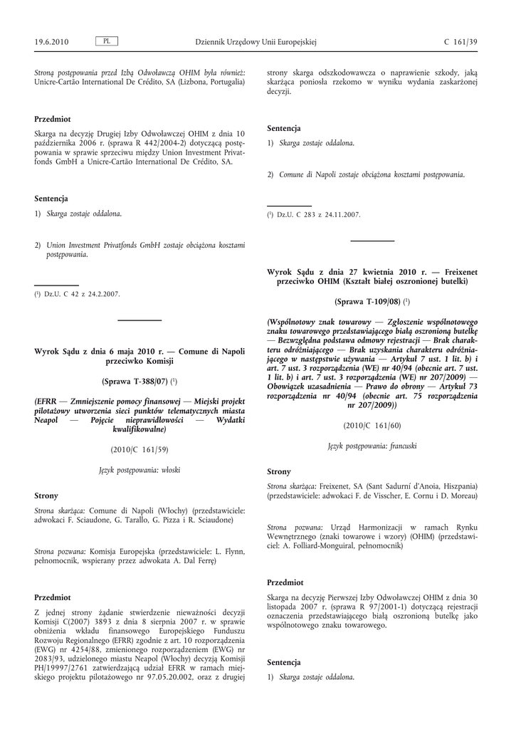 19.6.2010 PL Dziennik Urzędowy Unii Europejskiej Stroną postępowania przed Izbą Odwoławczą OHIM była również: Unicre-Cartão International De Crédito, SA (Lizbona, Portugalia) Przedmiot Skarga na decyzję Drugiej Izby Odwoławczej OHIM z dnia 10 października 2006 r. (sprawa R 442/2004-2) dotyczącą postę powania w sprawie sprzeciwu między Union Investment Privat fonds GmbH a Unicre-Cartão International De Crédito, SA. C 161/39 strony skarga odszkodowawcza o naprawienie szkody, jaką skarżąca poniosła rzekomo w wyniku wydania zaskarżonej decyzji. Sentencja 1) Skarga zostaje oddalona. 2) Comune di Napoli zostaje obciążona kosztami postępowania. Sentencja 1) Skarga zostaje oddalona. (1) Dz.U. C 283 z 24.11.2007. 2) Union Investment Privatfonds GmbH zostaje obciążona kosztami postępowania. Wyrok Sądu z dnia 27 kwietnia 2010 r. — Freixenet przeciwko OHIM (Kształt białej oszronionej butelki) (1) Dz.U. C 42 z 24.2.2007. Wyrok Sądu z dnia 6 maja 2010 r. — Comune di Napoli przeciwko Komisji (Sprawa T-388/07) (1) (EFRR — Zmniejszenie pomocy finansowej — Miejski projekt pilotażowy utworzenia sieci punktów telematycznych miasta Neapol — Pojęcie nieprawidłowości — Wydatki kwalifikowalne) (Sprawa T-109/08) (1) (Wspólnotowy znak towarowy — Zgłoszenie wspólnotowego znaku towarowego przedstawiającego białą oszronioną butelkę — Bezwzględna podstawa odmowy rejestracji — Brak charak teru odróżniającego — Brak uzyskania charakteru odróżnia jącego w następstwie używania — Artykuł 7 ust. 1 lit. b) i art. 7 ust. 3 rozporządzenia (WE) nr 40/94 (obecnie art. 7 ust. 1 lit. b) i art. 7 ust. 3 rozporządzenia (WE) nr 207/2009) — Obowiązek uzasadnienia — Prawo do obrony — Artykuł 73 rozporządzenia nr 40/94 (obecnie art. 75 rozporządzenia nr 207/2009)) (2010/C 161/60) Język postępowania: francuski (2010/C 161/59) Język postępowania: włoski Strony Strona skarżąca: Comune di Napoli (Włochy) (przedstawiciele: adwokaci F. Sciaudone, G. Tarallo, G. Pizza i R. Sciaudone) Strona pozwana: Komisja Europejska (przedstawiciele: L. Flynn, pełnomocnik, wspierany przez adwokata A. Dal Ferrę) Strony Strona skarżąca: Freixenet, SA (Sant Sadurní d’Anoia, Hiszpania) (przedstawiciele: adwokaci F. de Visscher, E. Cornu i D. Moreau) Strona pozwana: Urząd Harmonizacji w ramach Rynku Wewnętrznego (znaki towarowe i wzory) (OHIM) (przedstawi ciel: A. Folliard-Monguiral, pełnomocnik) Przedmiot Przedmiot Z jednej strony żądanie stwierdzenie nieważności decyzji Komisji C(2007) 3893 z dnia 8 sierpnia 2007 r. w sprawie obniżenia wkładu finansowego Europejskiego Funduszu Rozwoju Regionalnego (EFRR) zgodnie z art. 10 rozporządzenia (EWG) nr 4254/88, zmienionego rozporządzeniem (EWG) nr 2083/93, udzielonego miastu Neapol (Włochy) decyzją Komisji PH/19997/2761 zatwierdzającą udział EFRR w ramach miej skiego projektu pilotażowego nr 97.05.20.002, oraz z drugiej Skarga na decyzję Pierwszej Izby Odwoławczej OHIM z dnia 30 listopada 2007 r. (sprawa R 97/2001-1) dotyczącą rejestracji oznaczenia przedstawiającego białą oszronioną butelkę jako wspólnotowego znaku towarowego. Sentencja 1) Skarga zostaje oddalona.