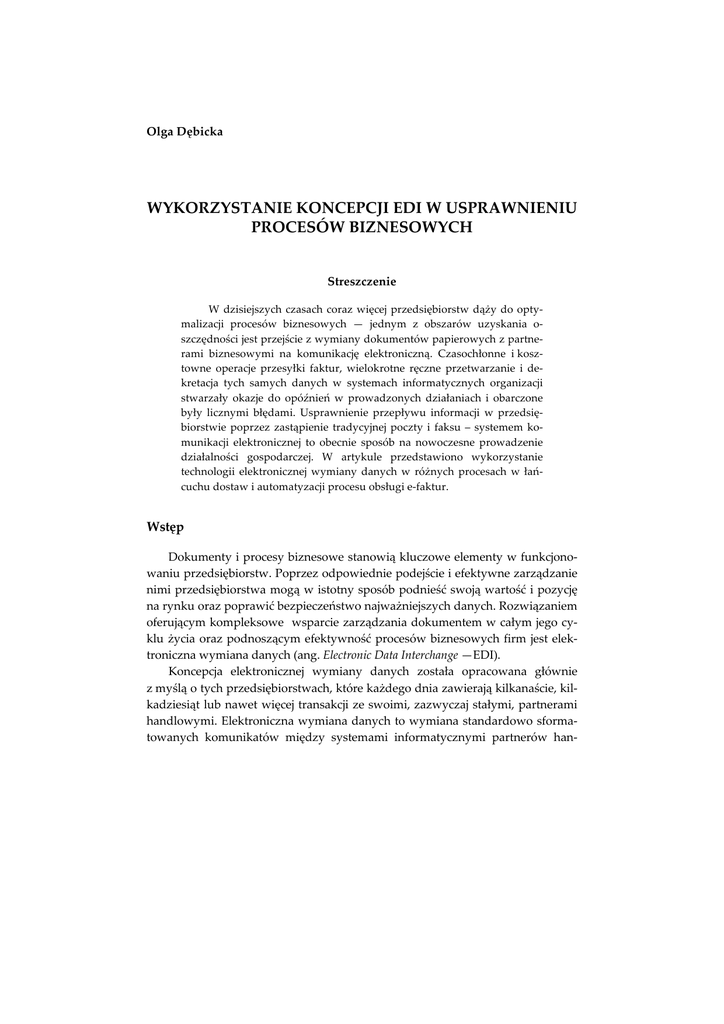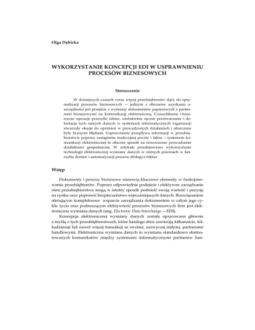 Olga Dębicka WYKORZYSTANIE KONCEPCJI EDI W USPRAWNIENIU PROCESÓW BIZNESOWYCH Streszczenie W dzisiejszych czasach coraz więcej przedsiębiorstw dąży do opty-‐‑ malizacji procesów biznesowych — jednym z obszarów uzyskania o-‐‑ szczędności jest przejście z wymiany dokumentów papierowych z partne-‐‑ rami biznesowymi na komunikację elektroniczną. Czasochłonne i kosz-‐‑ towne operacje przesyłki faktur, wielokrotne ręczne przetwarzanie i de-‐‑ kretacja tych samych danych w systemach informatycznych organizacji stwarzały okazje do opóźnień w prowadzonych działaniach i obarczone były licznymi błędami. Usprawnienie przepływu informacji w przedsię-‐‑ biorstwie poprzez zastąpienie tradycyjnej poczty i faksu – systemem ko-‐‑ munikacji elektronicznej to obecnie sposób na nowoczesne prowadzenie działalności gospodarczej. W artykule przedstawiono wykorzystanie technologii elektronicznej wymiany danych w różnych procesach w łań-‐‑ cuchu dostaw i automatyzacji procesu obsługi e-‐‑faktur. Wstęp Dokumenty i procesy biznesowe stanowią kluczowe elementy w funkcjono-‐‑ waniu przedsiębiorstw. Poprzez odpowiednie podejście i efektywne zarządzanie nimi przedsiębiorstwa mogą w istotny sposób podnieść swoją wartość i pozycję na rynku oraz poprawić bezpieczeństwo najważniejszych danych. Rozwiązaniem oferującym kompleksowe wsparcie zarządzania dokumentem w całym jego cy-‐‑ klu życia oraz podnoszącym efektywność procesów biznesowych firm jest elek-‐‑ troniczna wymiana danych (ang. Electronic Data Interchange —EDI). Koncepcja elektronicznej wymiany danych została opracowana głównie z myślą o tych przedsiębiorstwach, które każdego dnia zawierają kilkanaście, kil-‐‑ kadziesiąt lub nawet więcej transakcji ze swoimi, zazwyczaj stałymi, partnerami handlowymi. Elektroniczna wymiana danych to wymiana standardowo sforma-‐‑ towanych komunikatów między systemami informatycznymi partnerów han-‐‑ 166 Olga Dębicka dlowych. EDI określana jest również jako „[…] elektroniczna transmisja doku-‐‑ mentów handlowych w standardowym formacie bezpośrednio pomiędzy aplika-‐‑ cjami komputerowymi partnerów handlowych”1. EDI określa się również jako: „[…] sposób komunikowania się organizacji biorących udział w przedsięwzięciu gospodarczym, administracyjnym lub in-‐‑ nym, polegającym na automatycznym przesyłaniu elektronicznie sformatowa-‐‑ nych dokumentów między aplikacjami komputerowymi znajdującymi się we wszystkich tych organizacjach”2. Do najczęściej wskazywanych cechy EDI należą: – stosowanie elektronicznego medium transportowego (np. sieć typu VAN – Value Added Network lub Internet) zamiast wykorzystywania fizycznych nośników informacji, takich jak: papier, dyskietki, dyski optyczne, faksy itp.; – używanie informacji mających określoną strukturę i format opartych na przy-‐‑ jętych standardach, gdyż tylko wiadomości zawierające takie informacje mo-‐‑ gą podlegać translacji, interpretacji i kontroli w porównaniu z wymaganym wzorcem reguł; – bezpośrednia komunikacja pomiędzy aplikacjami z pominięciem udziału człowieka. Przyczyną powstania rozwiązań typu EDI są poszukiwania ciągłej poprawy efektywności zarządzania informacją na drodze ewolucji klasycznych systemów informacyjnych. Rozwiązaniem problemów związanych z zarządzaniem infor-‐‑ macją w przedsiębiorstwie jest wprowadzenie mechanizmów automatyzujących czynności z nią związane oraz ograniczające do minimum wpływ czynnika ludz-‐‑ kiego na system przetwarzania i gromadzenia danych. Takie korzyści dostarcza wprowadzenie systemów informatycznych, a w konsekwencji narzędzi EDI z możliwością przekazywania informacji pomiędzy partnerami. 1. Rozwój systemów elektronicznej wymiany danych Koncepcja powstania EDI sięga lat 70. XX wieku. Komputery były wówczas bardzo drogie, a modemowe połączenia między nimi miały niską przepustowość i niewiele przedsiębiorstw mogło sobie na nie pozwolić. Jednocześnie nie istniały żadne systemy wspomagające wymianę danych między przedsiębiorstwami. Programy, które tworzyli autorzy wynajmowani przez pionierów EDI (przemysł samochodowy, General Motors, Sears, K-‐‑Mart), nie były ogólnie dostępne. Dale-‐‑ ko im było również do prostoty obsługi i niezawodności, jakimi mogą się szczycić dzisiejsze systemy. Rozwój EDI wiąże się z rozwojem technologii internetowej, przy czym rozwój tej ostatniej nie wpłynie, jak się wydaje, na kształt i zasady 1 2 K. Lange-‐‑Sadzińska, M. Ziemecka, Przewodnik po EDI, Wydawnictwo UŁ, Łódź 2000. M. Niedźwiedziński, Globalny handel elektroniczny, PWN, Warszawa 2004. Wykorzystanie koncepcji EDI w usprawnieniu procesów biznesowych 167 działania systemów EDI, gdyż postęp w technologiach internetowych zapewnia jedynie nowe i lepsze medium transportowe. Początkowo wykorzystanie Interne-‐‑ tu w systemach elektronicznej wymiany danych ograniczało się do poczty elek-‐‑ tronicznej (mail-‐‑based EDI) oraz stron WWW i protokołu http (WEB-‐‑EDI). Rady-‐‑ kalną zmianę w sposobie realizacji EDI przy wykorzystaniu technologii internetowych przyniosło powstanie nowego języka opisu dokumentów XML 3 (technologia XML/EDI) . Pierwszymi poważnymi użytkownikami EDI stali się przewoźnicy morscy, kolejowi i powietrzni, czyli sektor transportu. W krótkim czasie dołączyli do nich związani z transportem brookerzy, magazyny, agencje celne, sieci detaliczne, wreszcie obsługujące te sektory banki. Wraz ze wzrostem liczby przedsiębiorstw oraz różnorodnością przesyła-‐‑ nych dokumentów oczywiste stało się, iż wymiana dokumentów w ramach EDI tylko wtedy może się powieść, jeśli uczestniczące w niej strony zaakceptują wspólny standard dokumentów. Używanie wypracowanych standard