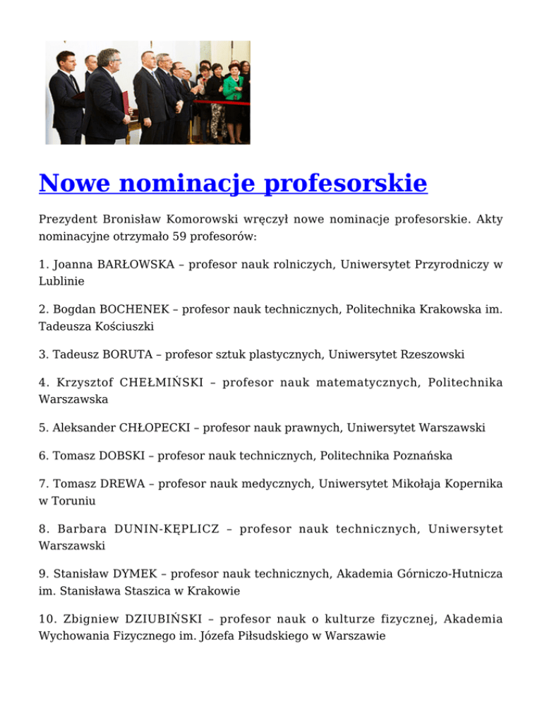 Nowe nominacje profesorskie Prezydent Bronisław Komorowski wręczył nowe nominacje profesorskie. Akty nominacyjne otrzymało 59 profesorów: 1. Joanna BARŁOWSKA – profesor nauk rolniczych, Uniwersytet Przyrodniczy w Lublinie 2. Bogdan BOCHENEK – profesor nauk technicznych, Politechnika Krakowska im. Tadeusza Kościuszki 3. Tadeusz BORUTA – profesor sztuk plastycznych, Uniwersytet Rzeszowski 4. Krzysztof CHEŁMIŃSKI – profesor nauk matematycznych, Politechnika Warszawska 5. Aleksander CHŁOPECKI – profesor nauk prawnych, Uniwersytet Warszawski 6. Tomasz DOBSKI – profesor nauk technicznych, Politechnika Poznańska 7. Tomasz DREWA – profesor nauk medycznych, Uniwersytet Mikołaja Kopernika w Toruniu 8. Barbara DUNIN-KĘPLICZ – profesor nauk technicznych, Uniwersytet Warszawski 9. Stanisław DYMEK – profesor nauk technicznych, Akademia Górniczo-Hutnicza im. Stanisława Staszica w Krakowie 10. Zbigniew DZIUBIŃSKI – profesor nauk o kulturze fizycznej, Akademia Wychowania Fizycznego im. Józefa Piłsudskiego w Warszawie 11. Stanisław FEDOROWICZ – profesor nauk o Ziemi, Uniwersytet Gdański 12. Sławomir FIJAŁKOWSKI – profesor sztuk plastycznych, Akademia Sztuk Pięknych w Gdańsku 13. Kazimierz GARBULEWSKI – profesor nauk technicznych, Szkoła Główna Gospodarstwa Wiejskiego w Warszawie 14. Zbigniew GÓRAL – profesor nauk prawnych, Uniwersytet Łódzki 15. Jolanta GROMADZIŃSKA – profesor nauk medycznych, Instytut Medycyny Pracy w Łodzi 16. Bożena GRONOWSKA – profesor nauk prawnych, Uniwersytet Mikołaja Kopernika w Toruniu 17. Witold GRZEGOŻEK – profesor nauk technicznych, Politechnika Krakowska im. Tadeusza Kościuszki 18. Piotr GRZESZCZUK – profesor nauk matematycznych, Politechnika Białostocka 19. Zbigniew KAMIŃSKI – profesor nauk technicznych, Politechnika Śląska w Gliwicach 20. Henryk KAPROŃ – profesor nauk technicznych, Politechnika Warszawska 21. Ryszard KATULSKI – profesor nauk technicznych, Politechnika Gdańska 22. Andrzej KĘSY – profesor nauk technicznych, Uniwersytet TechnologicznoHumanistyczny im. Kazimierza Pułaskiegow Radomiu 23. Waldemar KITLER – profesor nauk społecznych, Akademia Obrony Narodowej w Warszawie 24. Krzysztof KNITTEL – profesor sztuk muzycznych, Uniwersytet Muzyczny Fryderyka Chopina w Warszawie 25. Andrzej KOCHAŃSKI – profesor nauk medycznych, Instytut Medycyny Doświadczalnej i Klinicznej im. Mirosława Mossakowskiego Polskiej Akademii Nauk w Warszawie 26. Anna KOZUB – profesor sztuk muzycznych, Akademia Muzyczna im. Ignacego Paderewskiego w Poznaniu 27. Jan KUBICA – profesor nauk technicznych, Politechnika Śląska w Gliwicach 28. Janusz KUCHARSKI – profesor sztuk plastycznych, Akademia Sztuk Pięknych im. Eugeniusza Gepperta we Wrocławiu 29. Jerzy KUCZKOWSKI – profesor nauk medycznych, Gdański Uniwersytet Medyczny 30. Jan KUKUŁA – profesor sztuk plastycznych, Akademia Sztuk Pięknych im. Eugeniusza Gepperta we Wrocławiu 31. Zbigniew KULKA – profesor nauk technicznych, Politechnika Warszawska 32. Czesław KUNCEWICZ – profesor nauk technicznych, Politechnika Łódzka 33. Jarosław KWECLICH – profesor sztuk plastycznych, Akademia im. Jana Długosza w Częstochowie 34. Edmund LORENCOWICZ – profesor nauk rolniczych, Uniwersytet Przyrodniczy w Lublinie 35. Andrzej MARSZAŁEK – profesor nauk medycznych, Uniwersytet Medyczny w Poznaniu 36. Ksiądz Józef MIKOŁAJEC – profesor nauk teologicznych, Uniwersytet Opolski 37. Kamal MORSHED – profesor nauk medycznych, Uniwersytet Medyczny w Lublinie 38. Stanisław NAGY – profesor nauk technicznych, Akademia Górniczo-Hutnicza im. Stanisława Staszica w Krakowie 39. Stanisław NOSAL – profesor nauk technicznych, Politechnika Poznańska 40. Dorota NOWAKOWSKA – profesor nauk medycznych, Uniwersytet Medyczny w Łodzi 41. Renata NURZYŃSKA-WIERDAK – profesor nauk rolniczych, Uniwersytet Przyrodniczy w Lublinie 42. Piotr RIESKE – profesor nauk medycznych, Uniwersytet Medyczny w Łodzi 43. Andrzej RUSEK – profesor nauk technicznych, Politechnika Częstochowska 44. Piotr RUTKOWSKI – profesor nauk medycznych, Centrum Onkologii-Instytut im. Marii Skłodowskiej-Curie w Warszawie 45. Andrzej SKOCZYLAS – profesor nauk prawnych, Uniwersytet im. Adama Mickiewicza w Poznaniu 46. Andrzej SOBCZAK – profesor nauk medycznych, Śląski Uniwersytet Medyczny w Katowicach 47. Maciej SOSNOWSKI – profesor nauk medycznych, Śląski Uniwersytet Medyczny w Katowicach 48. Barbara STEINBORN – profesor nauk medycznych, Uniwersytet Medyczny w Poznaniu 49. Krzysztof ŚLOSAREK – profesor nauk medycznych, Centrum OnkologiiInstytut im. Marii Skłodowskiej-Curie w Warszawie 50. Beata ŚREDNIAWA – profesor nauk medycznych, Śląski Uniwersytet Medyczny w Katowicach 51. Eugeniusz TARASÓW – profesor nauk medycznych, Uniwersytet Medyczny w Białymstoku 52. Franciszek TOMASZEWSKI – profesor nauk technicznych, Politechnika Poznańska 53. Yuriy TOMILOV – profesor nauk matematycznych, Uniwersytet Mikołaja Kopernika w Toruniu 54. Jerzy WALOCHA – profesor nauk medycznych, Uniwersytet Jagielloński w Krakowie 55. Mirosław WCIŚLIK – profesor nauk technicznych, Politechnika Świętokrzyska w Kielcach 56. Ewa WEINERT-RĄCZKA – profesor nauk technicznych, Zachodniopomorski Uniwersytet Technologiczny w Szczecinie 57. Rafał WIŚNIOWSKI – profesor nauk technicznych, Akademia GórniczoHutnicza im. Stanisława Staszica w Krakowie 58. Klaudiusz WÓJCIK – profesor nauk matematycznych, Uniwersytet Jagielloński w Krakowie 59. Dariusz ZMARZŁY – profesor nauk technicznych, Politechnika Opolska Prezydent wręczył nominacje profesorskie Data publikacji: 11.04.2013r.