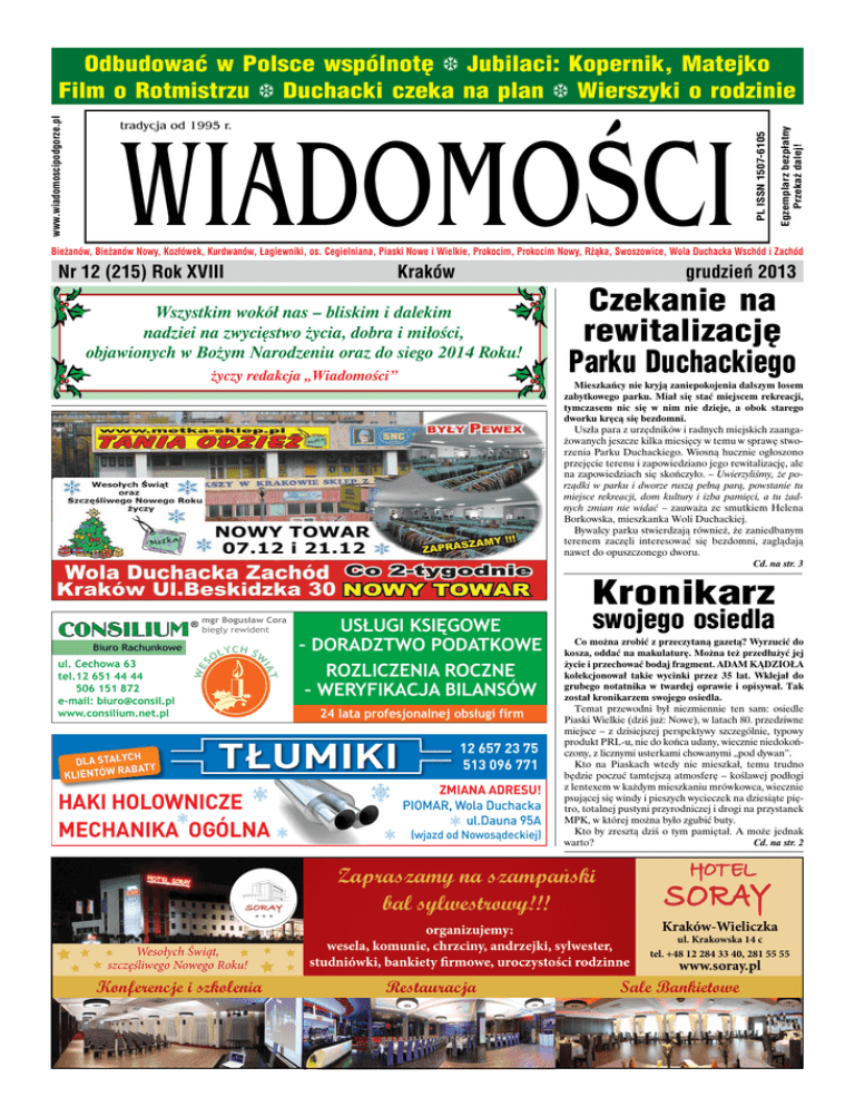 Egzemplarz bezpłatny Przekaż dalej! WIADOMOŚCI tradycja od 1995 r. PL ISSN 1507-6105 www.wiadomoscipodgorze.pl Odbudować w Polsce wspólnotę f Jubilaci: Kopernik, Matejko Film o Rotmistrzu f Duchacki czeka na plan f Wierszyki o rodzinie Bieżanów, Bieżanów Nowy, Kozłówek, Kurdwanów, Łagiewniki, os. Cegielniana, Piaski Nowe i Wielkie, Prokocim, Prokocim Nowy, Rżąka, Swoszowice, Wola Duchacka Wschód i Zachód Nr 12 (215) Rok XVIII Kraków Wszystkim wokół nas – bliskim i dalekim nadziei na zwycięstwo życia, dobra i miłości, objawionych w Bożym Narodzeniu oraz do siego 2014 Roku! życzy redakcja „Wiadomości” grudzień 2013 Czekanie na rewitalizację Parku Duchackiego Mieszkańcy nie kryją zaniepokojenia dalszym losem zabytkowego parku. Miał się stać miejscem rekreacji, tymczasem nic się w nim nie dzieje, a obok starego dworku kręcą się bezdomni. Uszła para z urzędników i radnych miejskich zaangażowanych jeszcze kilka miesięcy w temu w sprawę stworzenia Parku Duchackiego. Wiosną hucznie ogłoszono przejęcie terenu i zapowiedziano jego rewitalizację, ale na zapowiedziach się skończyło. – Uwierzyliśmy, że porządki w parku i dworze ruszą pełną parą, powstanie tu miejsce rekreacji, dom kultury i izba pamięci, a tu żadnych zmian nie widać – zauważa ze smutkiem Helena Borkowska, mieszkanka Woli Duchackiej. Bywalcy parku stwierdzają również, że zaniedbanym terenem zaczęli interesować się bezdomni, zaglądają nawet do opuszczonego dworu. Cd. na str. 3 Kronikarz mgr Bogusław Cora biegły rewident WE T h dla stałyc ATY B RA w klientó YCH ŚW OŁ IĄ ul. Cechowa 63 tel.12 651 44 44 506 151 872 e-mail: [email protected] www.consilium.net.pl S Biuro Rachunkowe usługi księgowe – doradztwo podatkowe rozliczenia roczne – weryfikacja bilansów 24 lata profesjonalnej obsługi firm tłumiki haki Holownicze mechanika ogólna 12 657 23 75 513 096 771 Zmiana adresu! PIOMAR, Wola Duchacka ul.Dauna 95A (wjazd od Nowosądeckiej) swojego osiedla Co można zrobić z przeczytaną gazetą? Wyrzucić do kosza, oddać na makulaturę. Można też przedłużyć jej życie i przechować bodaj fragment. ADAM KĄDZIOŁA kolekcjonował takie wycinki przez 35 lat. Wklejał do grubego notatnika w twardej oprawie i opisywał. Tak został kronikarzem swojego osiedla. Temat przewodni był niezmiennie ten sam: osiedle Piaski Wielkie (dziś już: Nowe), w latach 80. przedziwne miejsce – z dzisiejszej perspektywy szczególnie, typowy produkt PRL-u, nie do końca udany, wiecznie niedokończony, z licznymi usterkami chowanymi „pod dywan”. Kto na Piaskach wtedy nie mieszkał, temu trudno będzie poczuć tamtejszą atmosferę – koślawej podłogi z lentexem w każdym mieszkaniu mrówkowca, wiecznie psującej się windy i pieszych wycieczek na dziesiąte piętro, totalnej pustyni przyrodniczej i drogi na przystanek MPK, w której można było zgubić buty. Kto by zresztą dziś o tym pamiętał. A może jednak warto? Cd. na str. 2 ˘ Zapraszamy na szampanski bal sylwestrowy!!! Wesołych Świąt, szczęśliwego Nowego Roku! Konferencje i szkolenia organizujemy: wesela, komunie, chrzciny, andrzejki, sylwester, studniówki, bankiety firmowe, uroczystości rodzinne Restauracja Kraków-Wieliczka ul. Krakowska 14 c tel. +48 12 284 33 40, 281 55 55 www.soray.pl Sale Bankietowe hotel • restauracja konferencje i szkolenia • sale bankietowe 2 WIADOMOŚCI Nr 12 grudzień 2013 Po zabytkach To działo się – w majestacie przepisów – w biały dzień i na naszych oczach, przez długie lata. Dwie zabytkowe, stylowe wille przy rondzie Matecznego straszyły swoim widokiem. Mogły być wizytówką miasta zwanego „kulturalną stolicą Polski, a nawet Europy”. W to miejsce powstanie jakiś współczesny obiekt (pewnie hotel)... Tak pisaliśmy jeszcze w marcu ub.r. W końcu listopada ub.r. ruiny spłonęły. Cd. ze str. 1 Kronikarz swojego osiedla Lokalne historie Wrzesień 1979 r., widok od ul. Wadowickiej i ul. Bonarka. Wille miały po ok. 100 lat, zaprojektował je Józef ałęzowski. Zostały prawdopodobnie przeniesione G z okolic Lanckorony w okresie dwudziestolecia międzywojennego, w rejon uzdrowiska założonego w Podgórzu przez inż. Antoniego Matecznego. Przeniesienie konsultowano z historykiem sztuki prof. Karolem Estreicherem. Ich właścicielami byli obywatele narodowości żydowskiej. Budynki zamieszkiwali pracownicy tartaku lub kamieniołomu Liban. Po 1945 r. stały się mieszkaniami komunalnymi. Od lat 80-tych ub. wieku stały opustoszałe, zamieszkiwały je osoby bezdomne. Po transformacji ustrojowej Wydział Skarbu UMK bardzo długo szukał chętnego do kupienia tej nieruchomości, gdyż po uzgodnieniu z konserwatorem obwarował umowę zastrzeżeniami, że zabytkowe wille nie mogą być rozebrane, lecz co najwyżej przeniesione w inne miejsce. Wille zostały wpisane do ewidencji zabytków, gdyby były w rejestrze, to konserwator egzekwowałby prace remontowe. 24 lutego 1995 r. 29 marca 2010 r . Nowy właściciel zaraz po kupieniu nieruchomości w 2006 r. złożył wniosek o „warunki zabudowy i zagospodarowania terenu” – zgodę otrzymał dopiero latem 2011 r. Gdy wokół willi zrobiono spektakularną akcję Listopad 2012 r. społeczną, właściciel wytłumaczył się, że w momencie kupna poziom zużycia technicznego obu obiektów wynosił odpowiednio 75 i 90%. Nie znalazł chętnego, który za symboliczną „złotówkę” przeniósłby zabytki i już z własnych środków (pewnie krocie) odtworzył w nowym miejscu. Właściciel deklarował, że chciał zbudować przy Matecznym hotel i restaurację w historycznym stylu. Teraz chce odsprzedać teren, bo już nie chce budować. Ruina, która była zabytkiem, doczekała się śmierci. Jarosław Kajdański Zdjęcia: Dom Historii Podgórza, Paweł Kubisztal, (Kaj) Kraków ma taką tradycję i historię, że trudno z nimi konkurować. Nie dla wszystkich jednak krakowian, sercem tego miasta je