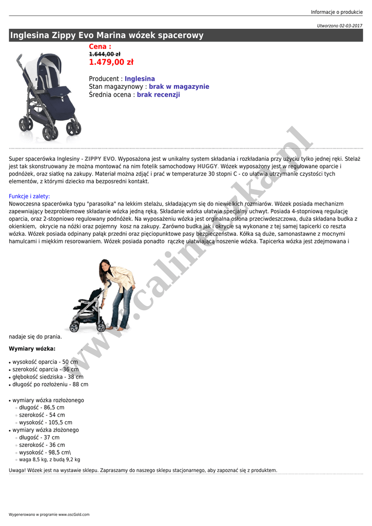 Informacje o produkcie Utworzono 02-03-2017 Inglesina Zippy Evo Marina wózek spacerowy Cena : 1.644,00 zł 1.479,00 zł pl Producent : Inglesina Stan magazynowy : brak w magazynie Średnia ocena : brak recenzji zk a. Super spacerówka Inglesiny - ZIPPY EVO. Wyposażona jest w unikalny system składania i rozkładania przy użyciu tylko jednej ręki. Stelaż jest tak skonstruowany że można montować na nim fotelik samochodowy HUGGY. Wózek wyposażony jest w regulowane oparcie i podnóżek, oraz siatkę na zakupy. Materiał można zdjąć i prać w temperaturze 30 stopni C - co ułatwia utrzymanie czystości tych elementów, z którymi dziecko ma bezposredni kontakt. Wymiary wózka: ● ● ● ● wysokość oparcia - 50 cm szerokość oparcia - 36 cm głębokość siedziska - 38 cm długość po rozłożeniu - 88 cm w ● w nadaje się do prania. w .c al in ec Funkcje i zalety: Nowoczesna spacerówka typu "parasolka" na lekkim stelażu, składającym się do niewielkich rozmiarów. Wózek posiada mechanizm zapewniający bezproblemowe składanie wózka jedną ręką. Składanie wózka ułatwia specjalny uchwyt. Posiada 4-stopniową regulację oparcia, oraz 2-stopniowo regulowany podnóżek. Na wyposażeniu wózka jest orginalna osłona przeciwdeszczowa, duża składana budka z okienkiem, okrycie na nóżki oraz pojemny kosz na zakupy. Zarówno budka jak i okrycie są wykonane z tej samej tapicerki co reszta wózka. Wózek posiada odpinany pałąk przedni oraz pięciopunktowe pasy bezpieczeństwa. Kółka są duże, samonastawne z mocnymi hamulcami i miękkim resorowaniem. Wózek posiada ponadto rączkę ułatwiającą noszenie wózka. Tapicerka wózka jest zdejmowana i wymiary wózka rozłożonego długość - 86,5 cm szerokość - 54 cm wysokość - 105,5 cm wymiary wózka złożonego długość - 37 cm szerokość - 36 cm wysokość - 98,5 cm\ ❍ ❍ ❍ ● ❍ ❍ ❍ ❍ waga 8,5 kg, z budą 9,2 kg Uwaga! Wózek jest na wystawie sklepu. Zapraszamy do naszego sklepu stacjonarnego, aby zapoznać się z produktem. Wygenerowano w programie www.oscGold.com