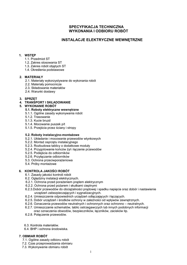 SPECYFIKACJA TECHNICZNA WYKONANIA I ODBIORU ROBÓT INSTALACJE ELEKTRYCZNE WEWNĘTRZNE 1. WSTĘP 1.1. Przedmiot ST 1.2. Zakres stosowania ST 1.3. Zakres robót objętych ST 1.4. Określenia podstawowe 2. MATERIAŁY 2.1. Materiały wykorzystywane do wykonania robót 2.2. Materiały pomocnicze 2.3. Składowanie materiałów 2.4. Warunki dostawy 3. SPRZĘT 4. TRANSPORT I SKŁADOWANIE 5. WYKONANIE ROBÓT 5.1. Roboty elektryczne wewnętrzne 5.1.1. Ogólne zasady wykonywania robót 5.1.2. Trasowanie 5.1.3. Kucie bruzd 5.1.4. Mocowanie puszek p/t 5.1.5. Przejścia przez ściany i stropy 5.2. Roboty instalacyjno-montaŜowe 5.2.1. Układanie i mocowanie przewodów wtynkowych 5.2.2. MontaŜ osprzętu instalacyjnego 5.2.3. Rozbudowa tablicy o dodatkowe moduły 5.2.4. Przygotowanie końców Ŝył i łączenie przewodów 5.2.5. Podejścia do odbiorników 5.2.6. Przyłączanie odbiorników 5.3. Ochrona przeciwporaŜeniowa 5.4. Próby montaŜowe 6. KONTROLA JAKOŚCI ROBÓT 6.1. Zasady jakości kontroli robót 6.2. Oględziny instalacji elektrycznych. 6.2.1. Ochrona przed poraŜeniem prądem elektrycznym 6.2.2. Ochrona przed poŜarem i skutkami cieplnymi 6.2.3.Dobór przewodów do obciąŜalności prądowej i spadku napięcia oraz dobór i nastawienie urządzeń zabezpieczających i sygnalizacyjnych. 6.2.4. Umieszczenie odpowiednich urządzeń odłączających i łączących. 6.2.5. Dobór urządzeń i środków ochrony w zaleŜności od wpływów zewnętrznych. 6.2.6. Oznaczenia przewodów neutralnych i ochronnych oraz ochronno – neutralnych. 6.2.7. Umieszczanie schematów, tablic ostrzegawczych lub innych podobnych informacji oraz oznaczenia obwodów, bezpieczników, łączników, zacisków itp. 6.2.8. Połączenie przewodów. 6.3. Kontrola materiałów. 6.4. BHP i ochrona środowiska. 7. OBMIAR ROBÓT 7.1. Ogólne zasady odbioru robót 7.2. Czas przeprowadzania obmiaru 7.3. Wykonywanie obmiaru robót 1 8. ODBIÓR ROBÓT 8.1. Odbiór frontu robót 8.2. Odbiory międzyoperacyjne. 8.3. Odbiory częściowe. 8.4. Odbiór końcowy. 8.5. Przekazanie instalacji do eksploatacji. 9. PODSTAWA PŁATNOŚCI 10. PRZEPISY ZWIĄZANE 2 ST.01.00 INSTALACJE ELEKTRYCZNE 1.1. Przedmiot ST Przedmiotem niniejszej specyfikacji są wymagania dotyczące wykonania i odbioru robót związanych z wykonaniem instalacji elektrycznych wewnętrznych zasilania klimatyzatora: Remont i Rozbudowa Przedszkola nr 216 i Gimnazjum nr 83 przy ul. Andriollego 1 w Warszawie Zamawiający: Miasto Stołeczne Warszawa Dzielnica Bemowo ul. Powstańców Śląskich 70, 01-381 Warszawa, działka nr 4, 3/13, obręb nr 6-08-05. 1.2. Zakres stosowania ST Specyfikacja jest stosowana jako dokument przetargowy i kontraktowy przy zlecaniu i realizacji robót wymienionych w punkcie 1.1. 1.3. Zakres robót objętych ST Ustalenia zawarte w niniejszej specyfikacji dotyczą prowadzenia robót elektrycznych a w szczególności: - CPV: 45300000-0 Roboty w zakresie instalacji budowlanych CPV: 45310000-3 Roboty w zakresie instalacji elektrycznych CPV: 45311000-0 Roboty w zakresie przewodów instalacji elektrycznych oraz opraw elektrycznych 1.4. Określenia podstawowe Określenia podane w niniejszej ST są zgodne z obowiązującymi normami: − PN-IEC 60050-826 Międzynarodowy słownik terminologiczny elektryki. Instalacje elektryczne w obiektach budowlanych. − PN-IEC 60364-1 Instalacje elektryczne w obiektach budowlanych. Zakres, przedmiot i wymagania. − PN-IEC 60364-3 Instalacje elektryczne w obiektach budowlanych. Ustalenie ogólnych charakterystyk. − PN-IEC 60364-4-43 Instalacje elektryczne w obiektach budowlanych. Ochrona dla zapewnienia bezpieczeństwa. Ochrona przed prądem przetęŜeniowym − PN-IEC 60364-4-443 Instalacje elektryczne w obiektach budowlanych. Ochrona dla zapewnienia bezpieczeństwa. Ochrona przed przepięciami. Ochrona przed przepięciami atmosferycznymi lub łączeniowymi. - PN-IEC 60364-4-46 Instalacje elektryczne w obiektach budowlanych. Ochrona dla zapewnienia bezpieczeństwa. Odłączenie izolacyjne i łączenie - PN-IEC 60364-4-47 Instalacje elektryczne w obiektach budowlanych. Ochrona dla zapewnienia bezpieczeństwa. Stosowanie środków ochrony dla zapewnienia bezpieczeństwa. Postanowienia ogólne. Środki ochrony przed poraŜeniem prądem elektrycznym. - PN-IEC 60364-4-473 Instalacje elektryczne w obiektach budowlanych. Ochrona dla zapewnienia bezpieczeństwa. Stosowanie środków ochrony zapewniających bezpieczeństwo. Środki ochrony przed prądem przetęŜeniowym - PN-IEC 60364-4-482 Instalacje elektryczne w obiektach budowlanych. Ochrona dla zapewnienia bezpieczeństwa. Dobór środków ochrony w zaleŜności od wpływów zewnętrznych. Ochrona przeciwpoŜarowa. − PN-IEC 60364-5-51 Instalacje elektryczne w obiektach budowlanych. Dobór i montaŜ wyposaŜenia elektrycznego. Postanowienia ogólne. PN-IEC 60364-5-52 Instalacje elektryczne w obiektach budowlanych. Dobór i montaŜ wyposaŜenia elektrycznego. Oprzewodowanie − PN-IEC 60364-5-53 Instalacje elektryczne w obiektach budowlanych. Dobór i montaŜ wyposaŜenia elektrycznego. Aparatura rozdzielcza i sterownicza. − PN-IEC 60364-5-537 Instalacje elektryczne w obiektach budowlanych. Dobór i montaŜ wyposaŜenia elektrycznego. Aparatura rozdzielcza i sterownicza. Urządzenia do odłączenia izolacyjnego i łączenia. PN-IEC 60364-5-54 Instalacje elektryczne w obiektach budowlanych. Dobór i montaŜ wyposaŜenia elektrycznego. Uziemienia i przewody ochronne. PN-IEC 60364-5-56 Instalacje elektryczne w obiektach budowlanych. Dobór i montaŜ wyposaŜenia elektrycznego. Instalacje bezpieczeńtwa. − PN-IEC 60364-6-61 Instalacje elektryczne w obiektach budowlanych. Sprawdzanie. Sprawdzanie 3 − − − − − − − − odbiorcze. PN-IEC 60364-5-523 Instalacje elektryczne w obiektach budowlanych. Dobór i montaŜ wyposaŜenia elektrycznego. ObciąŜalność prądowa długotrwała prądów. PN-IEC 60364-7-701 Instalacje elektryczne w obiektach budowlanych. Wymagania d